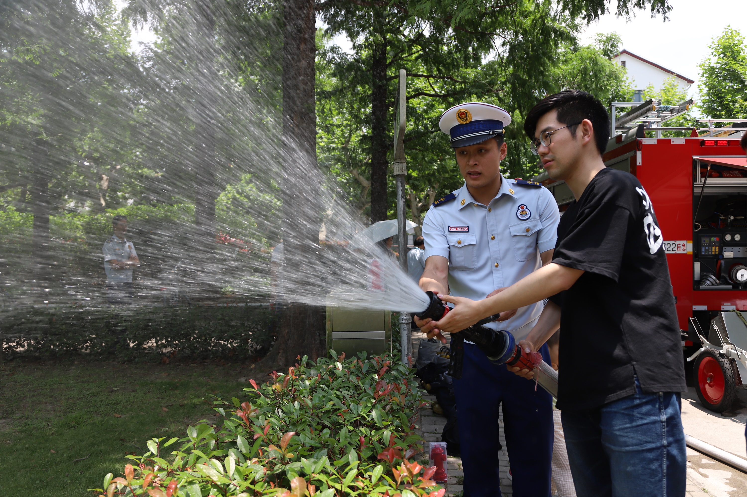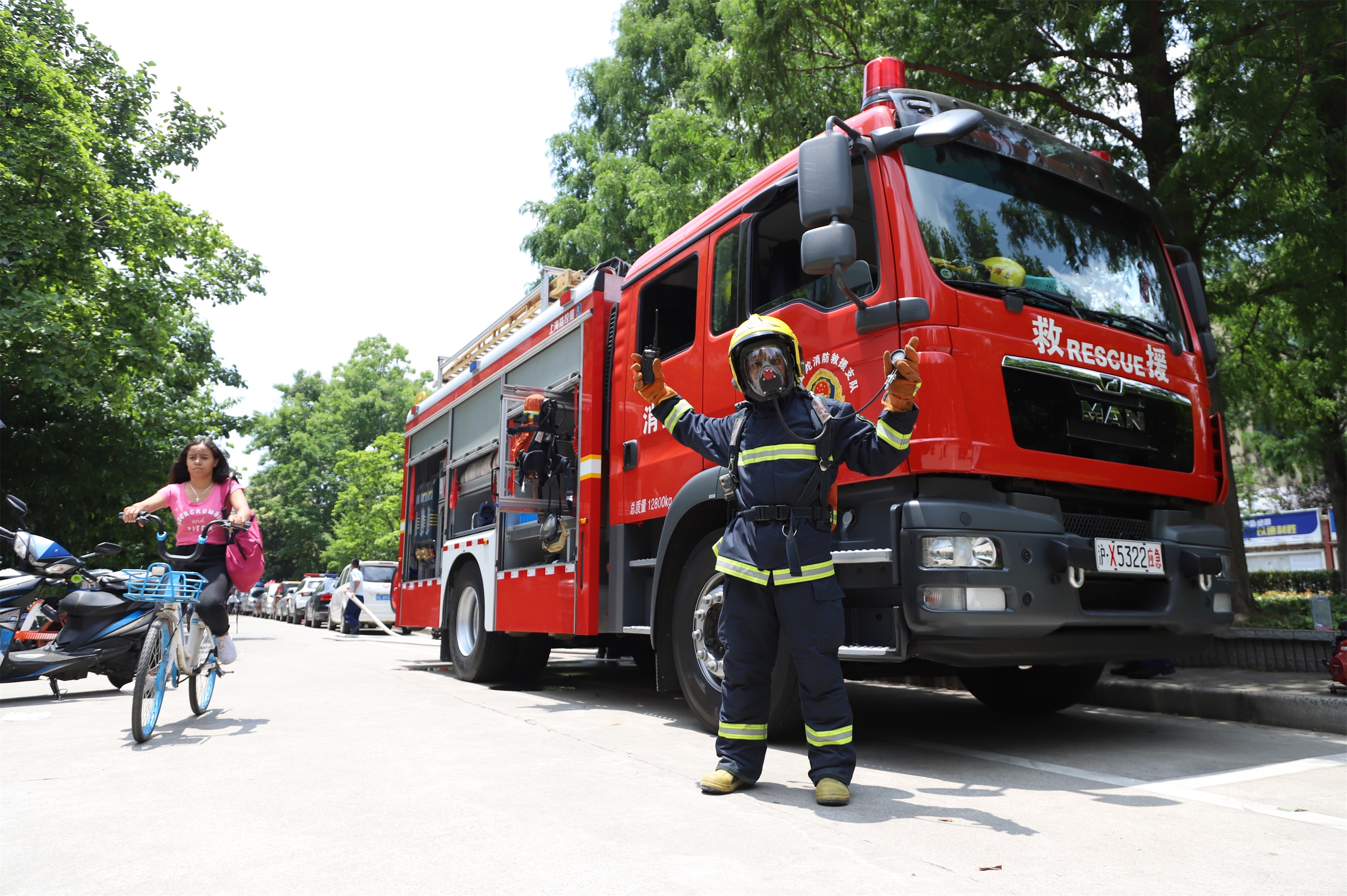 在消防装备体验环节,现场停放了真如消防中队的消防车和我校微型消防车。消防员穿戴装备、消防水带、灭火器、防烟面罩等消防设备悉数出场。在专业人士的演示指导下,多位师生依次穿戴消防服,对消防员工作的艰苦有了更加切身的体会,大家表示将更加注意日常的安全防范,及时消除火灾隐患。防烟面罩体验者多为化学、生物等生化学科同学,通过指导后,基本掌握了防烟面罩的操作步骤和注意事项,大家表示今后开展实验时要更加规范,一旦发生紧急情况将冷静对待、科学处置。此外,现场还进行了消防水带、灭火器、防火斗篷等其他消防装备的体验。