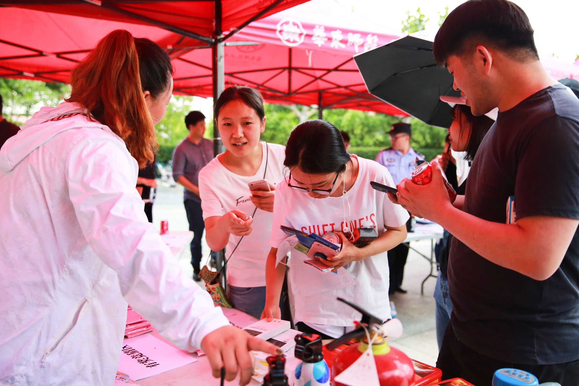 在安全知识竞答环节,前来参与师生络绎不绝。参与者现场扫描二维码后,即可参与网络答题。由于所答8道题目为题库随机抽取,不少同学遇到疑难题目时,往往通过现场讨论、回看现场展板、网络查询等方式,努力争取获得较高的分数。在上海市教委学校后勤保卫处的支持下,本次安全知识竞答题目参照《上海市大学生安全教育标准化考试试题库》专门定制,内容涉及国家安全、公共安全、危化品安全、实验室安全、食品安全、治安安全、消防安全、交通安全、人身安全、财产安全等多个安全领域,包括判断题、单项选择、多项选择等题型,是针对师生安全知识能力的一次综合检验。参与答题的师生纷纷表示,通过参加活动,不仅学到了很多安全知识和防范技能,还对安全工作的重要性有了更加深刻的认识。留学生也纷纷驻足,关注“平安华师”微信公众号,积极参与答题活动。