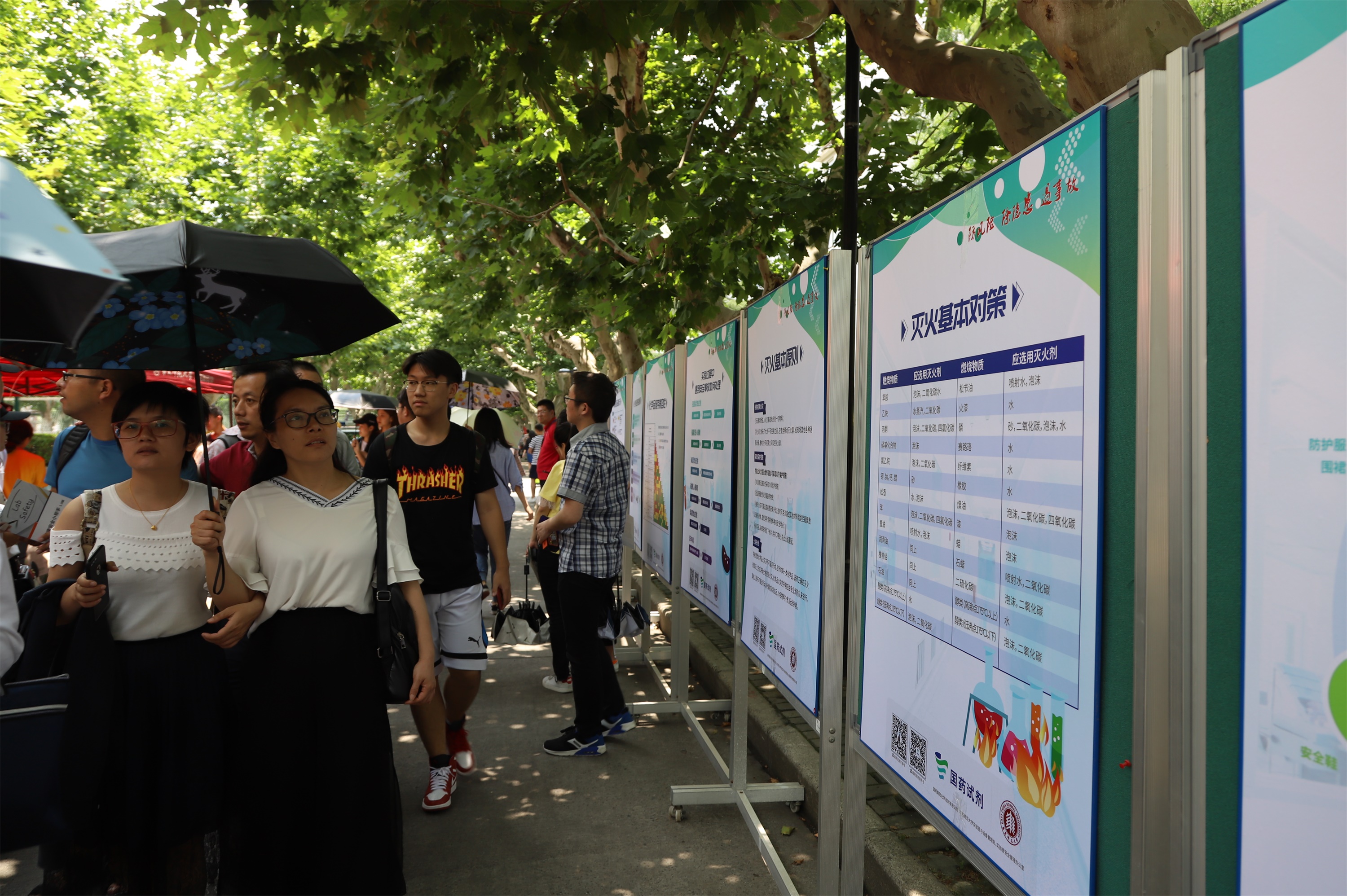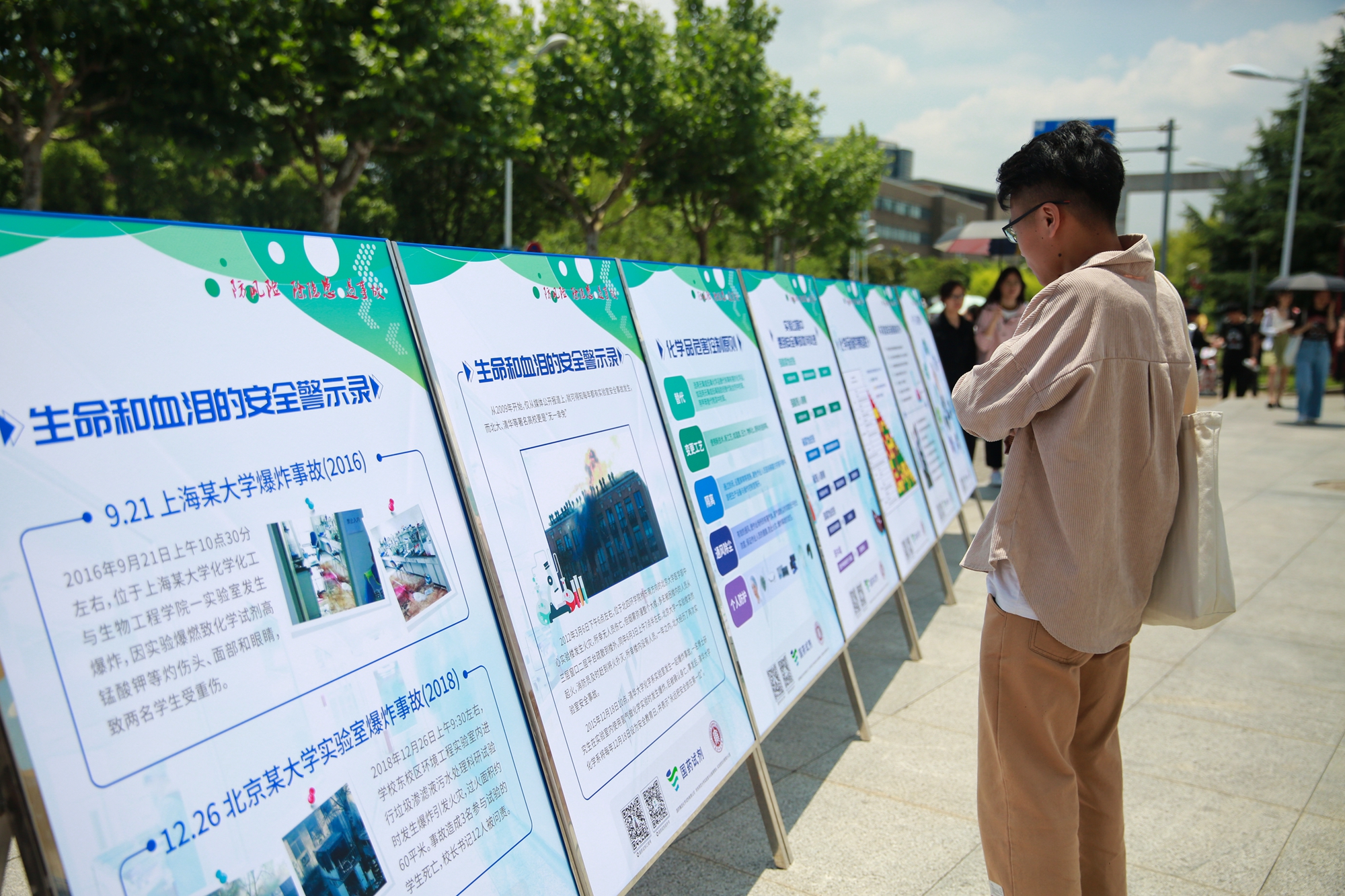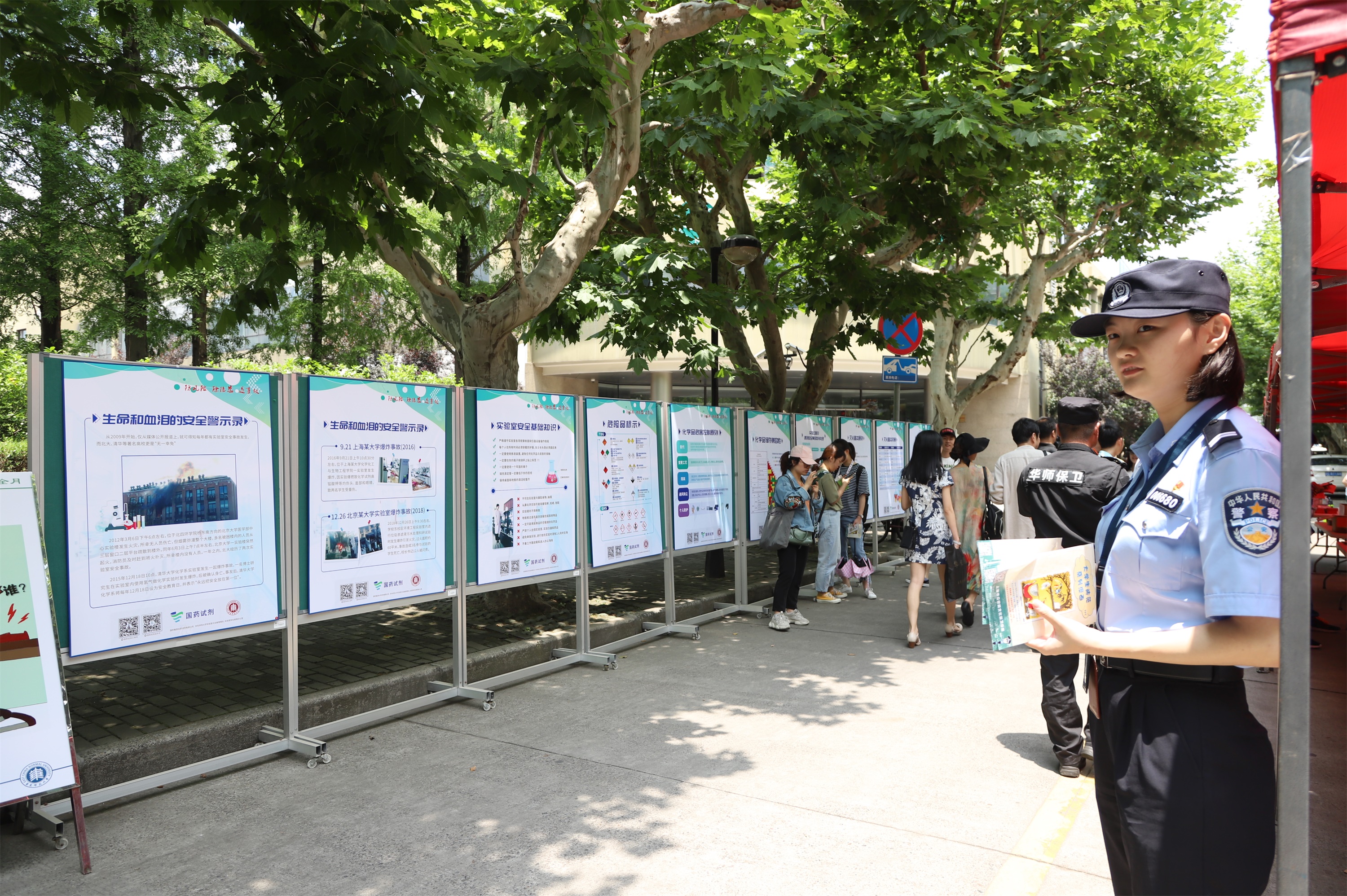 现场的展板展示了实验室安全、危化品安全、消防安全、治安安全的相关知识及典型安全事故案例。实验室与设备管理处的展板详细介绍了实验类型、实验操作规范、实验事故处置流程等内容,并结合实验室安全事故典型案例,提醒实验室师生规范实验操作、做好安全防护。保卫处的展板从治安、消防安全领域,介绍了人身财产安全防范,火灾的预防和身处火场的自我防护技巧等内容,并结合典型案例警示师生提高自身保护意识和安全防范意识。