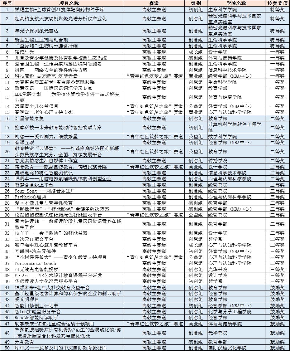 入围决赛项目创新型高,实用性强,具有很大发展潜力。参赛选手立足专业优势,投身“双创”实践,现场表现精彩,得到了评审专家的好评,展现了近年来学校创新创业教育的成果。最终,生命科学学院“祥耀生物-全球首创AI抗体靶向药物种子库”等5个项目荣获本次校内赛特等奖;体育健康学院“儿童及青少年健康及体育教学校园生态系统”等10个项目荣获一等奖;教育学部“灿星智能康复”等10个项目荣获二等奖;经管书院“Your Song——网络音乐工厂”等15个项目荣获三等奖;经管学部“ReadMe智能阅读助手”等10个项目荣获鼓励奖。