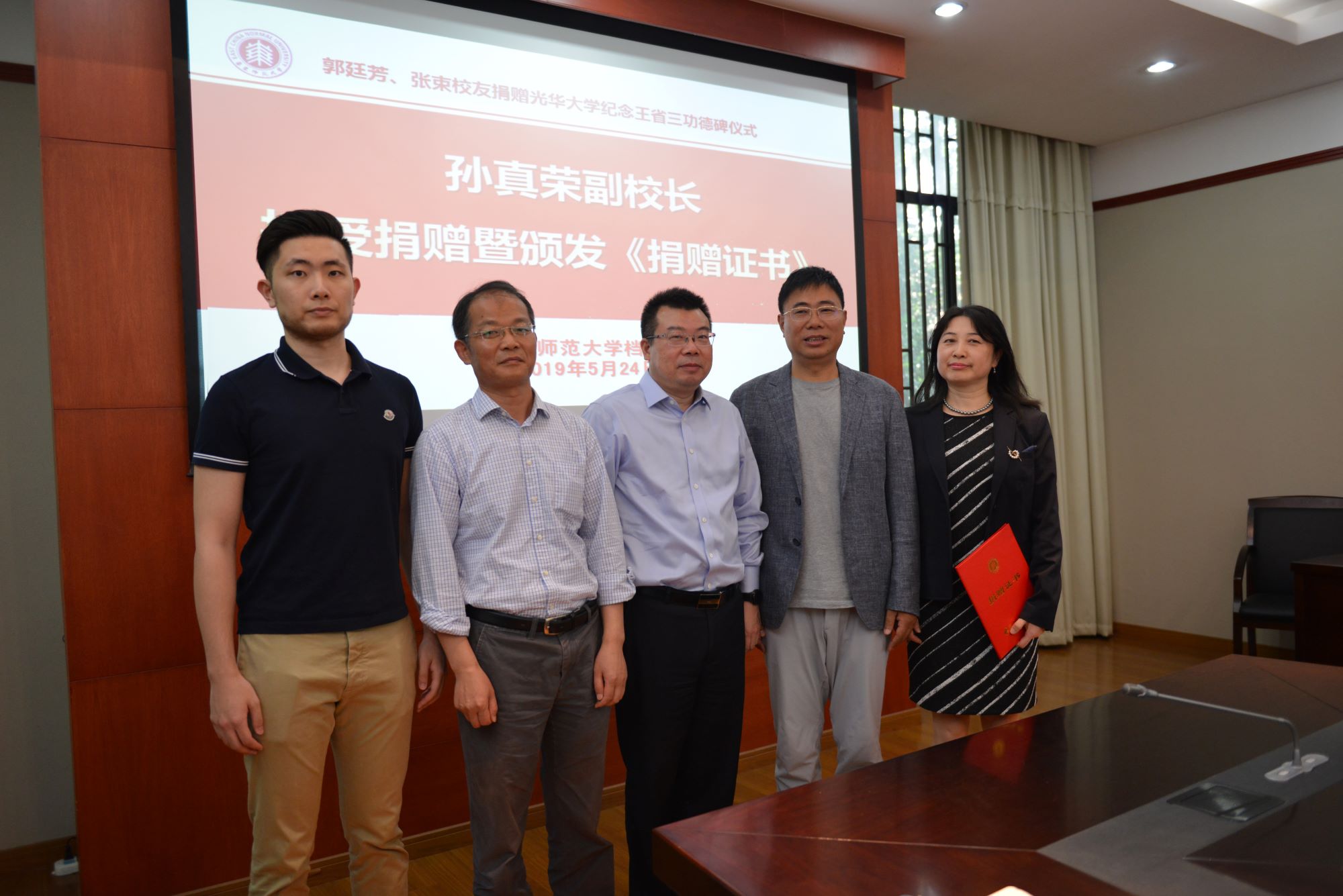 5月24日,华东师大校友郭廷芳、张束夫妇向学校捐赠一块额名为《王省三先生暨费佩翠夫人昭德之碑》。此碑为华东师大前身光华大学在建校五周年之际,即1930年6月3日校庆日竖立的纪念亭和纪念碑,系为表彰外交家王省三夫妇捐赠沪西家族田地为校地而立,以表垂之久远。