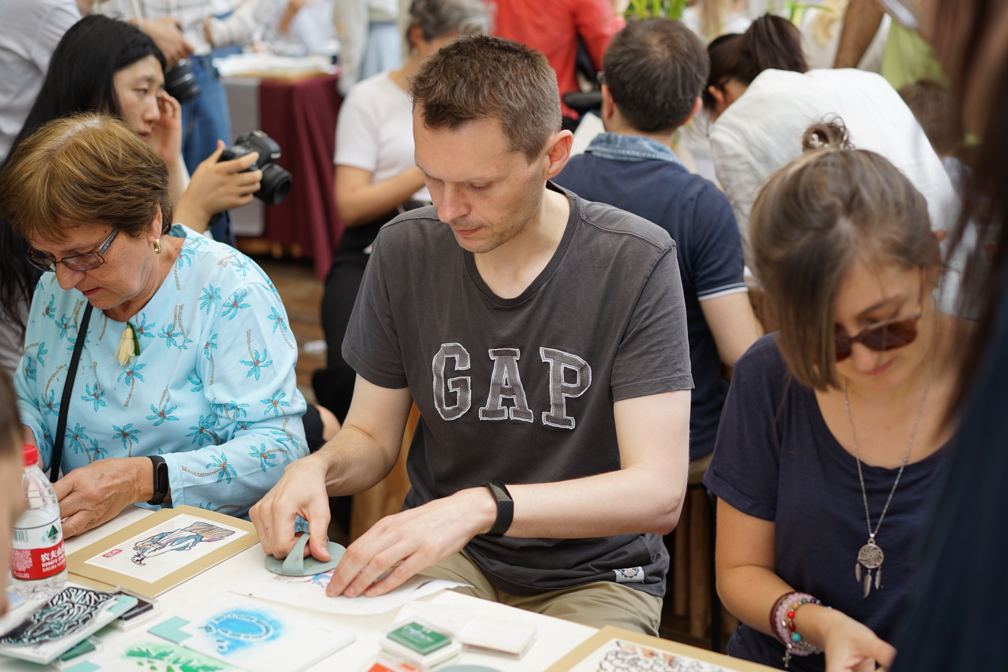 按照传统的习俗,过端午要避五毒,在这场特别的端午民俗游园会上,外交官们也得以初次体验了扎五毒这一民间风俗。另外,活动现场还准备了刻有端午元素(粽子、屈原、艾草等)的版画,外交官们纷纷将版画拓印在宣纸上,亲手制作一份端午节的祈福卡。“赛龙舟”是端午节另一项必不可少的活动,外交官们边学边做,制作出一个个精美的“纸龙舟”,给自己留下了一份独特的纪念和回忆。