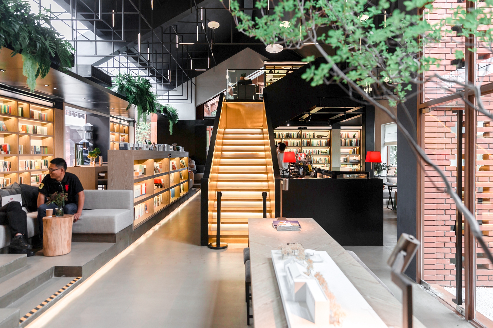 书吧由旭辉集团携手国内知名建筑设计师宋照青打造,秉持最前沿的建筑保护性更新理念,在保持教材科老楼主体建筑结构的前提下,采用与周边建筑环境相协调的红砖建筑风格。通过红砖的不同组合砌筑方式,辅以工业风格的折线钢构架和通透玻璃砖,进行立面修饰、室内修缮和功能更新,为华东师大师生提供了一处自然游憩新的体验地,也将成为校园活力的新中心、历史文脉的新载体。