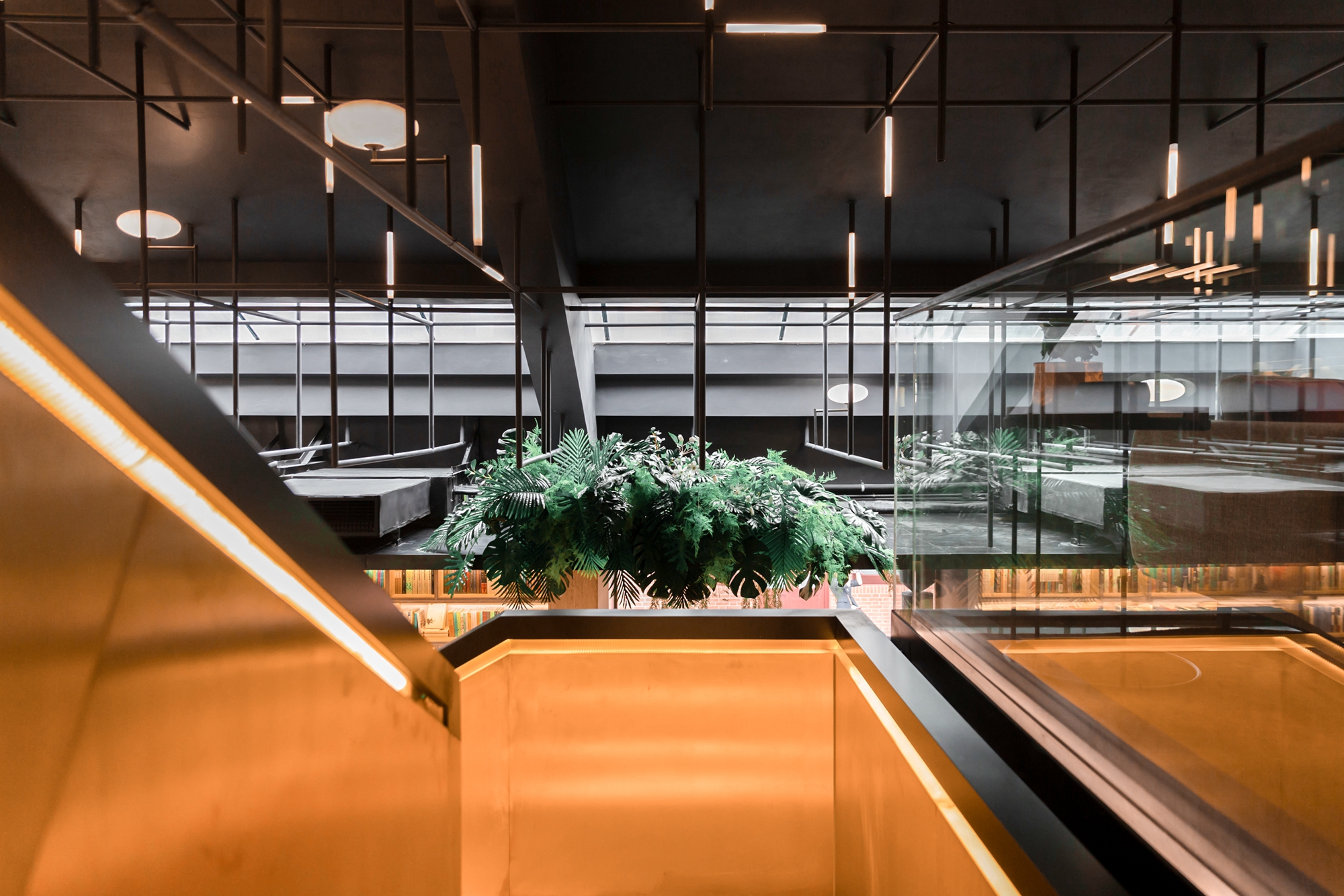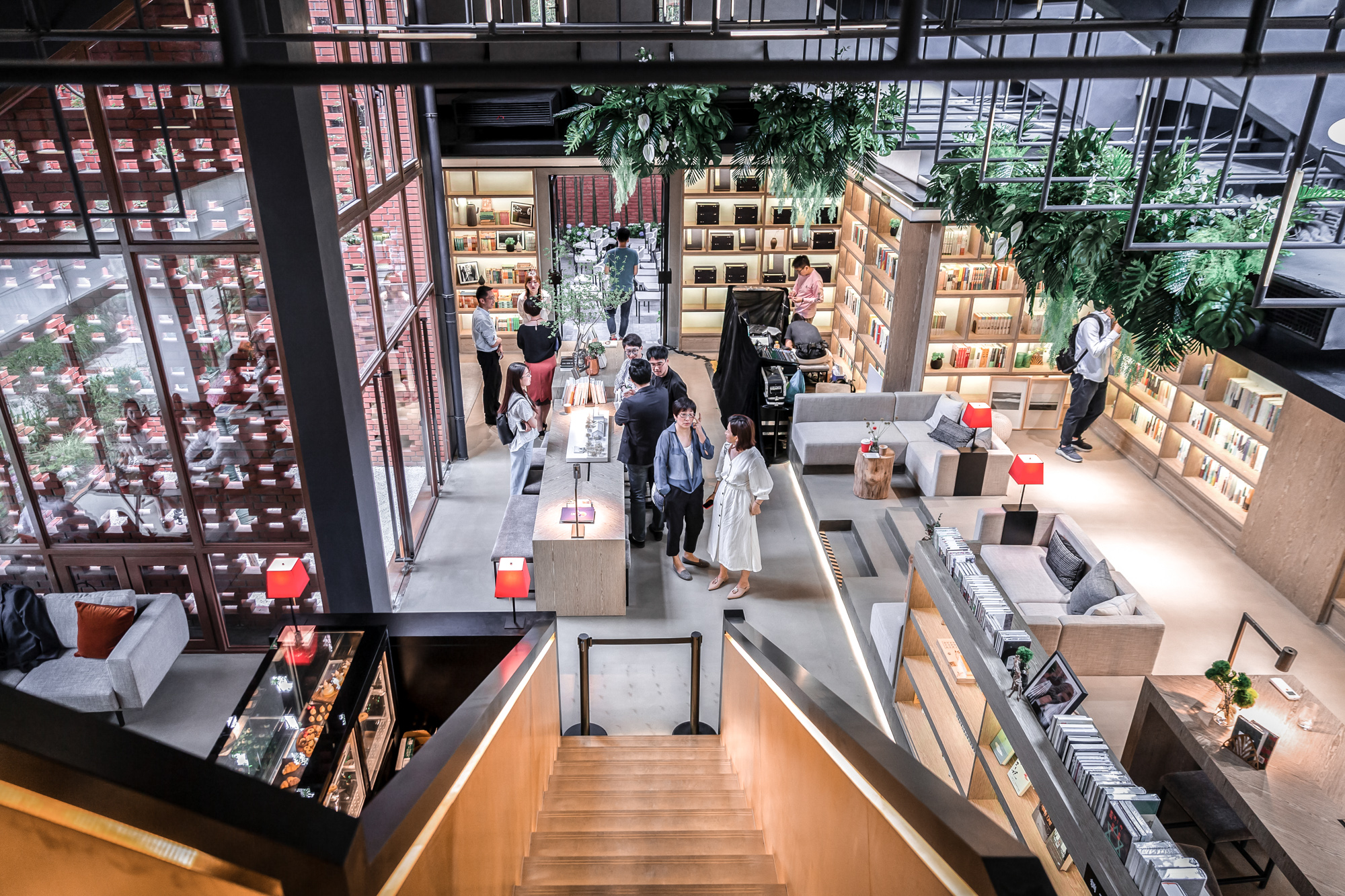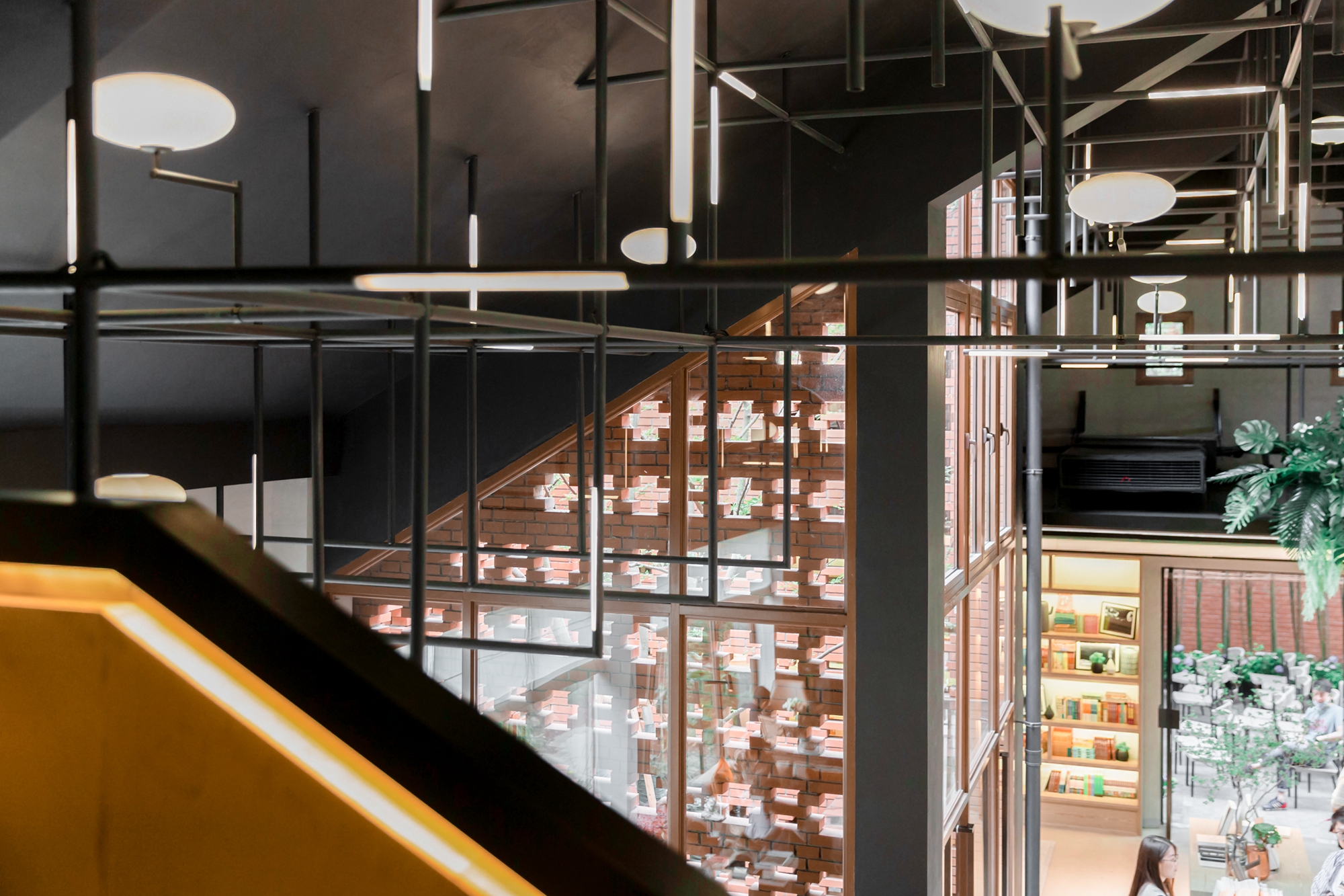 书吧室内采取工业风设计,围绕中心吧台进行分区,顶部将黑色条形钢管与定制灯具结合,再通过高度空间限定、软装组合,形成数个承载不同功能的阅读空间。举办此次启用仪式的半室外灰空间,则巧妙设计成通透的玻璃砖顶,将在光线变化之时折射出斑斓的光影效果。此空间不仅可作休憩之用,还具有多变的空间潜力,未来可举办读书沙龙和分享发布等活动。