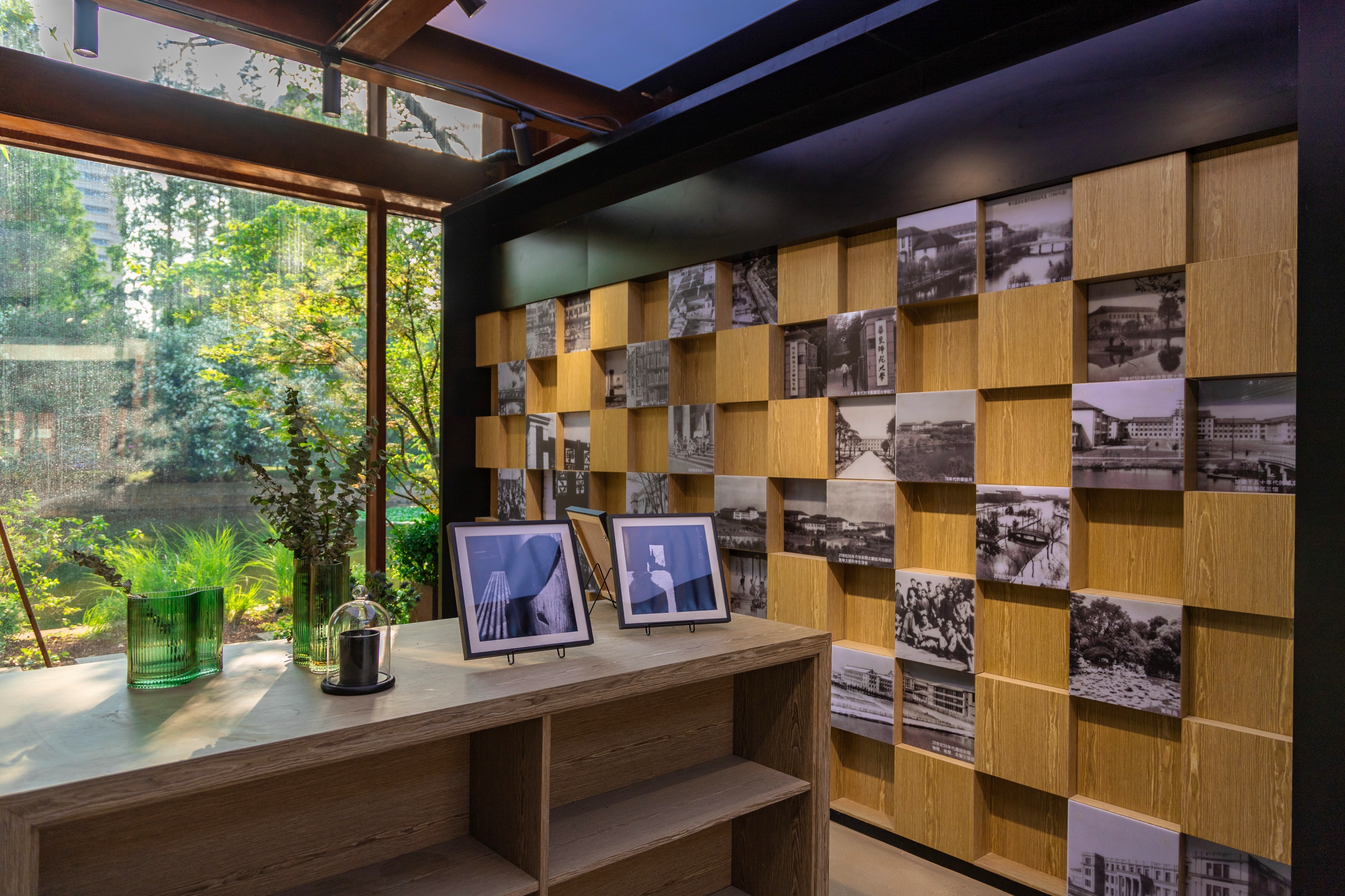 此外,书吧景观设计因地制宜,对建筑周边的空间进行了重塑。例如,在丽娃河景观亭的修缮中,最大程度地保留了亭身,并将底座修缮为“历史之舟”的雕塑形象,犹如一盏水灯长燃希望的烛火漂浮在河面之上,也赋予其承载华东师大辉煌校史的美好寓意。