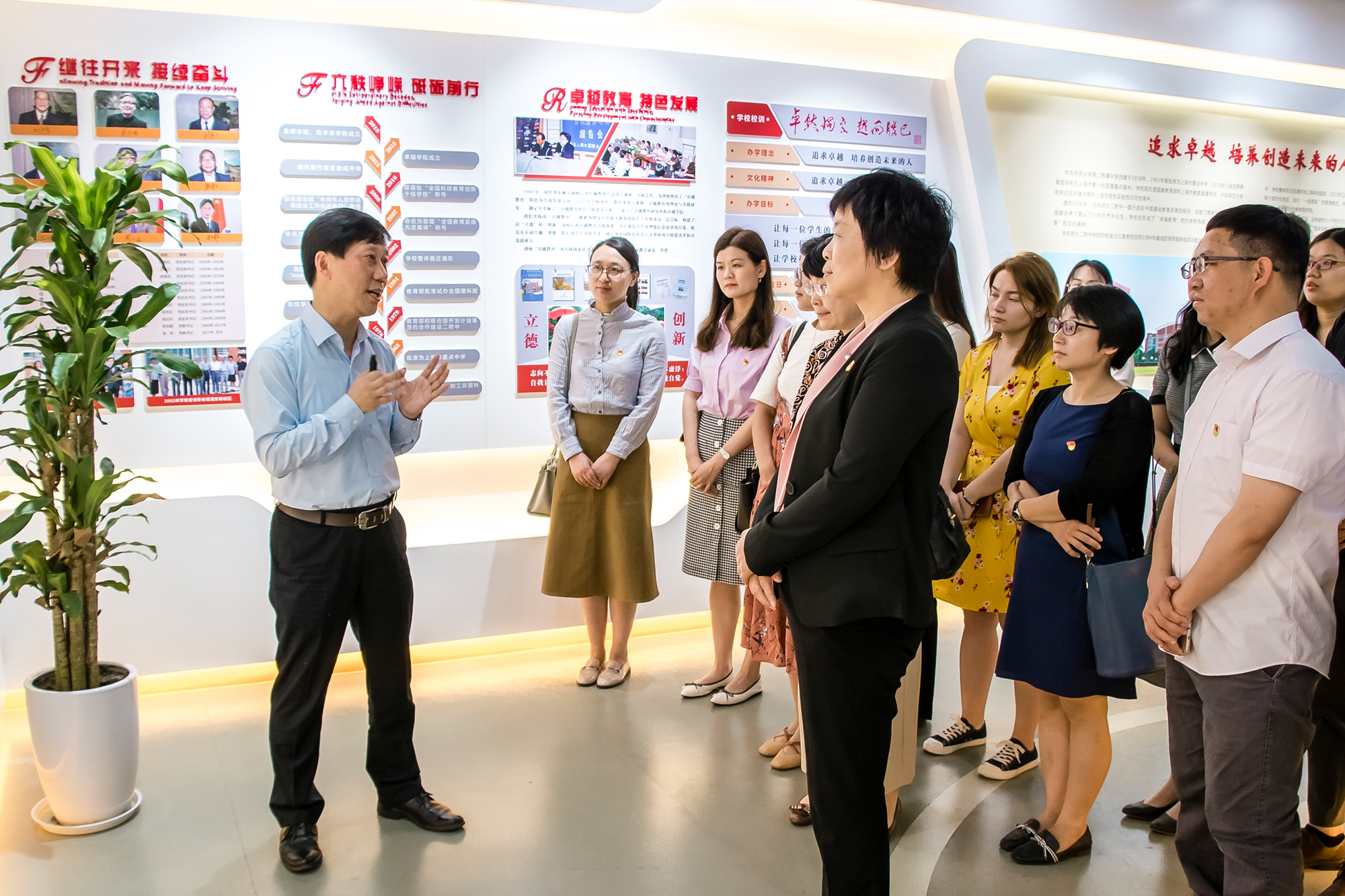 活动伊始,孟宪承书院教工支部全体成员参观了二附中校史馆。二附中校长李志聪在校史介绍过程中特别提到二附中创办之初,华东师大抽调各系90%左右从事教学法研究的大学教师和分配各系优秀应届大学毕业生到二附中任教,从而奠定了二附中高质量发展的师资基础。办学六十年余来,二附中始终得益于华东师大各方面的有力支撑,形成了“追求卓越、崇尚创新”的校园文化精神。