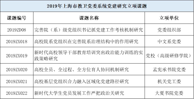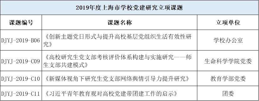 我校共有4项党建研究课题获得2019年上海市学校党建研究课题立项,学校办公室课题组《创新主题党日形式与提升高校基层党组织生活有效性研究》获得重点课题立项;另有6项党建研究课题获得2019年市教卫党委系统党建研究会立项,党委组织部主持的《完善院(系)党组织书记抓党建工作考核机制研究》获得重点课题立项。