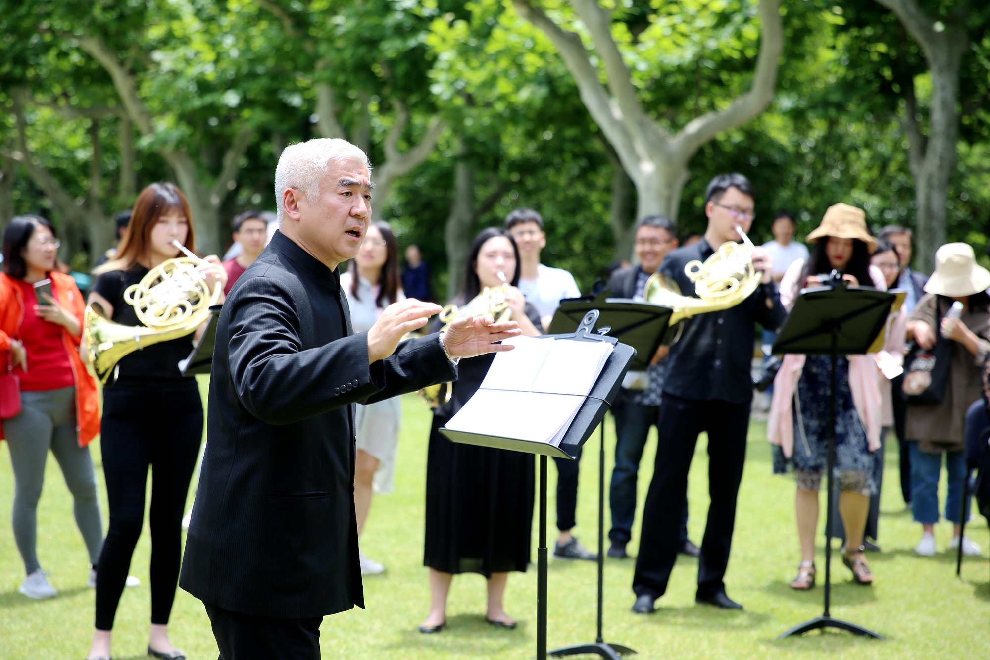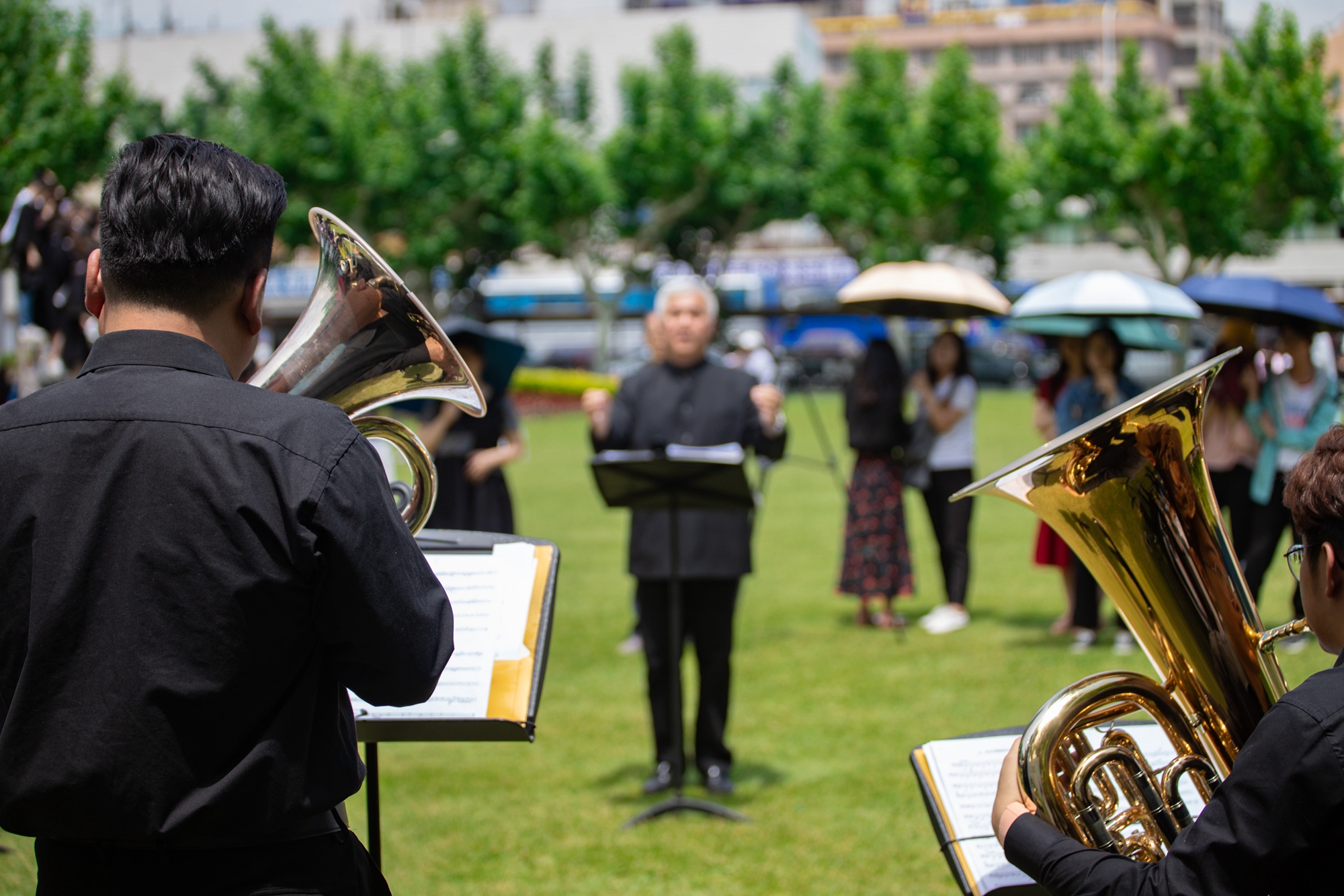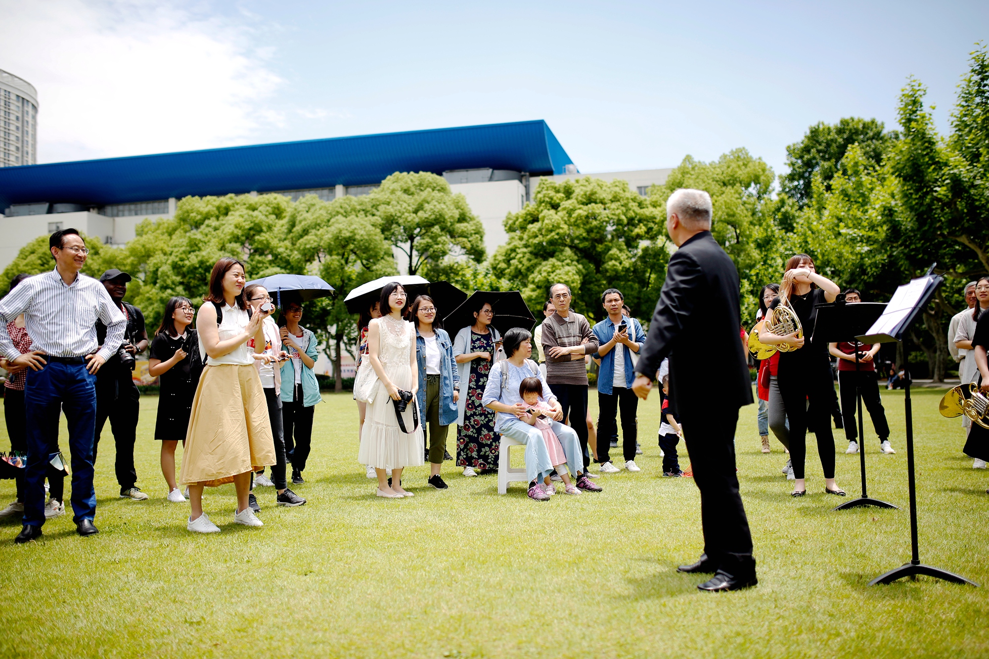 正午的阳光虽热,现场师生们的热情更高。他们纷纷拿起相机、手机拍照、录视频,当一首《我的祖国》响起时,不由得轻声跟唱起来。乐队陆续演奏了根据中国民乐凤阳花鼓改编的《序奏曲》,还有西方古典音乐经典曲目,如《波基少校进行曲》《老人进行曲》《闲聊波尔卡》《雷电波尔卡》《佳节号角》等,这些音乐作品或欢快活泼、幽默诙谐,或激昂悠扬,让现场师生们近距离地感受到铜管乐的魅力。演出在一首轻松欢乐的《拉德斯基进行曲》中结束。