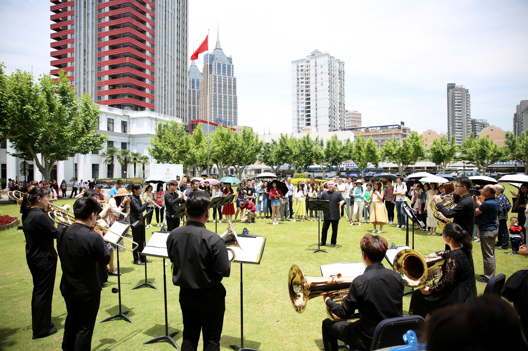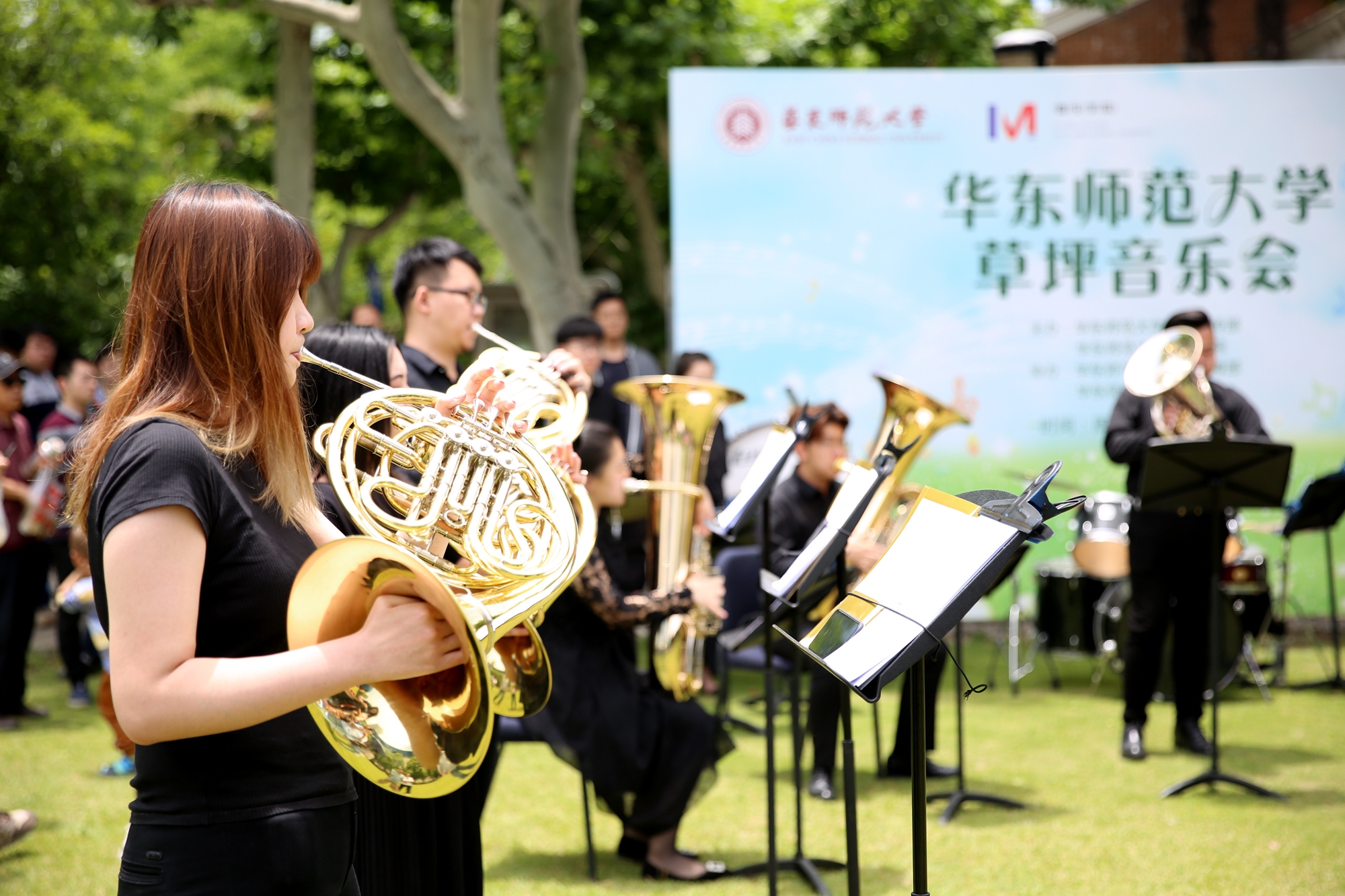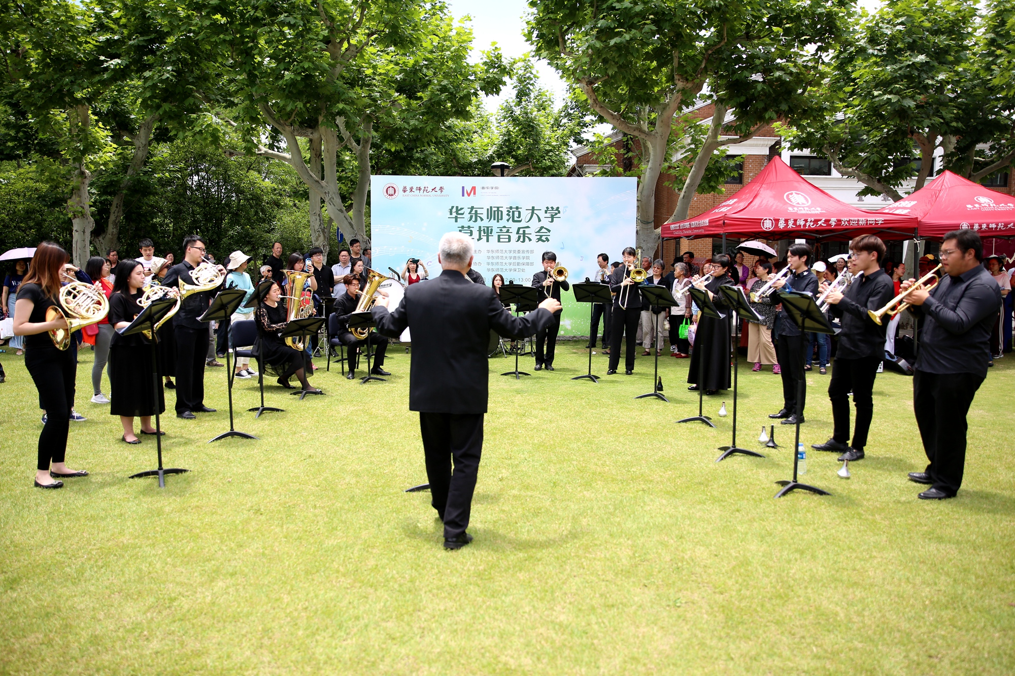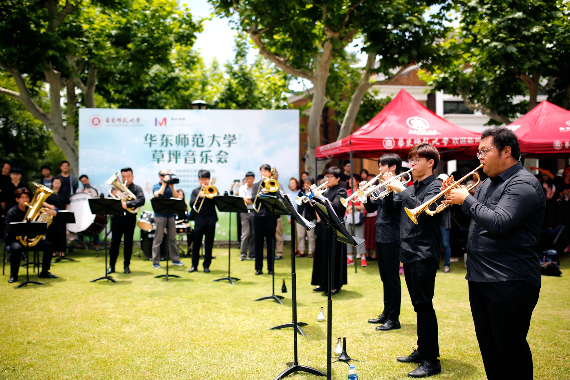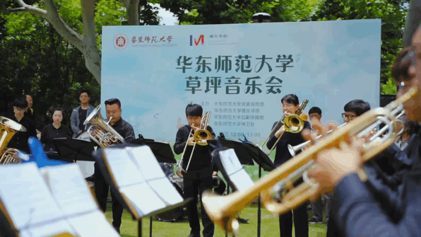 音乐学院ECNU BRASS乐队以《华东师大校歌》拉开了草坪音乐会序幕,点燃了现场师生的热情,吸引了不少行人驻足聆听。这支完全由音乐学院在校本科生、研究生组成的铜管乐队,顶着骄阳,在一个小时的演出中,以铜管乐大重奏、铜管五重奏、低音铜管重奏等多种演奏形式,呈现给观众不同风格的音乐作品。
