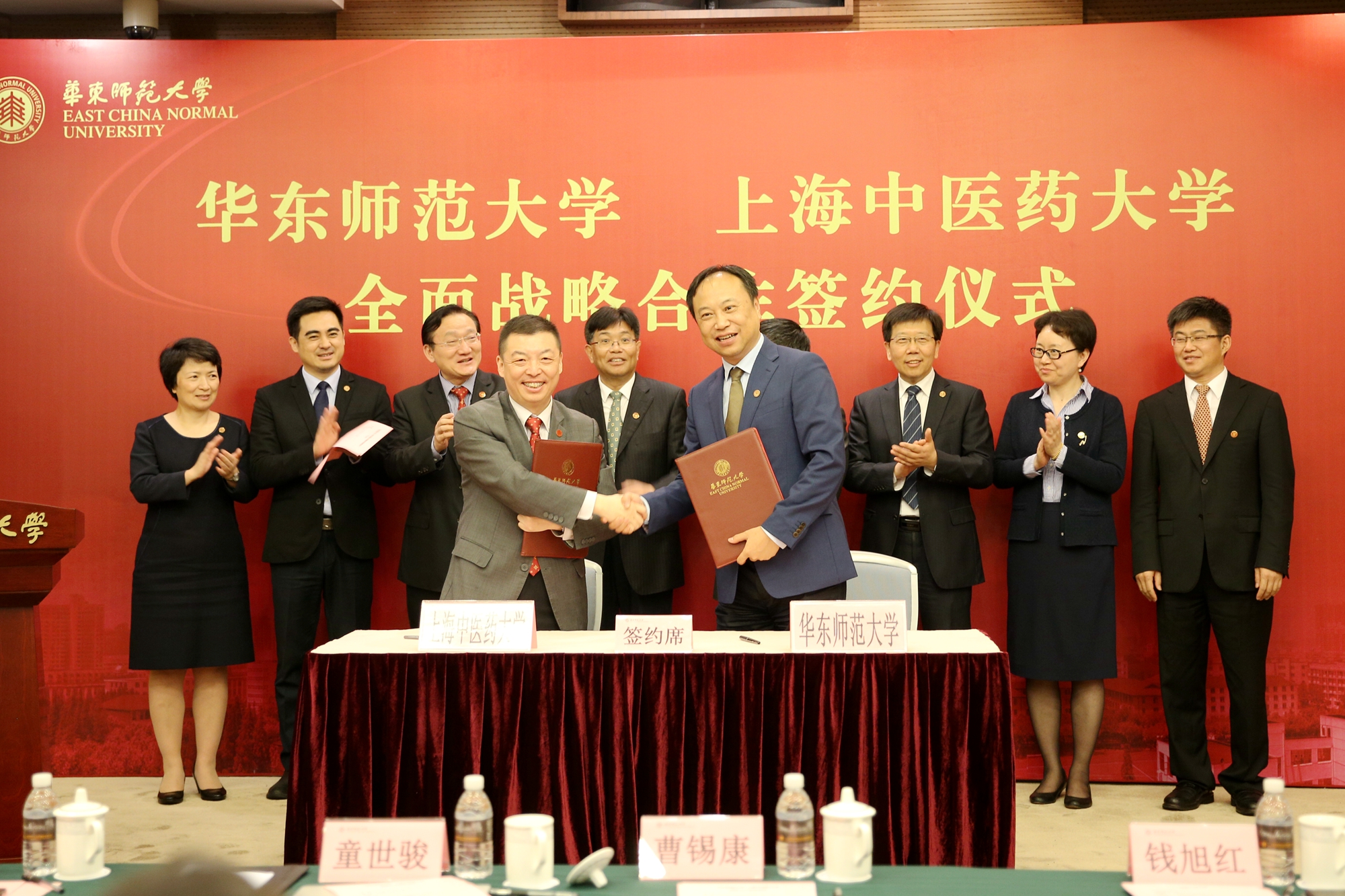华东师大校长钱旭红和上海中医药大学校长徐建光代表双方签署两校全面战略合作框架协议