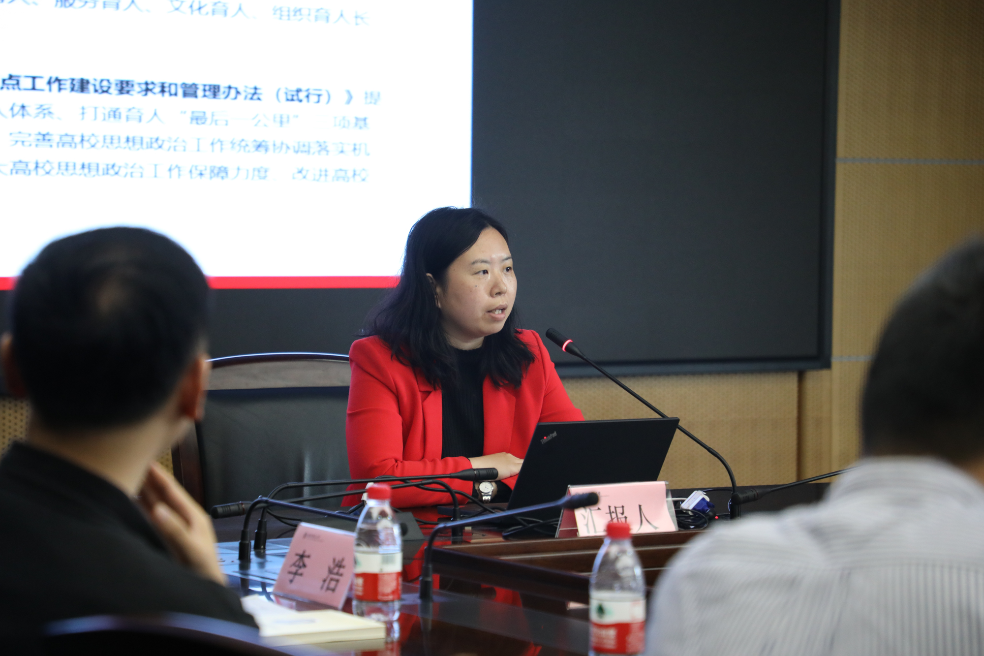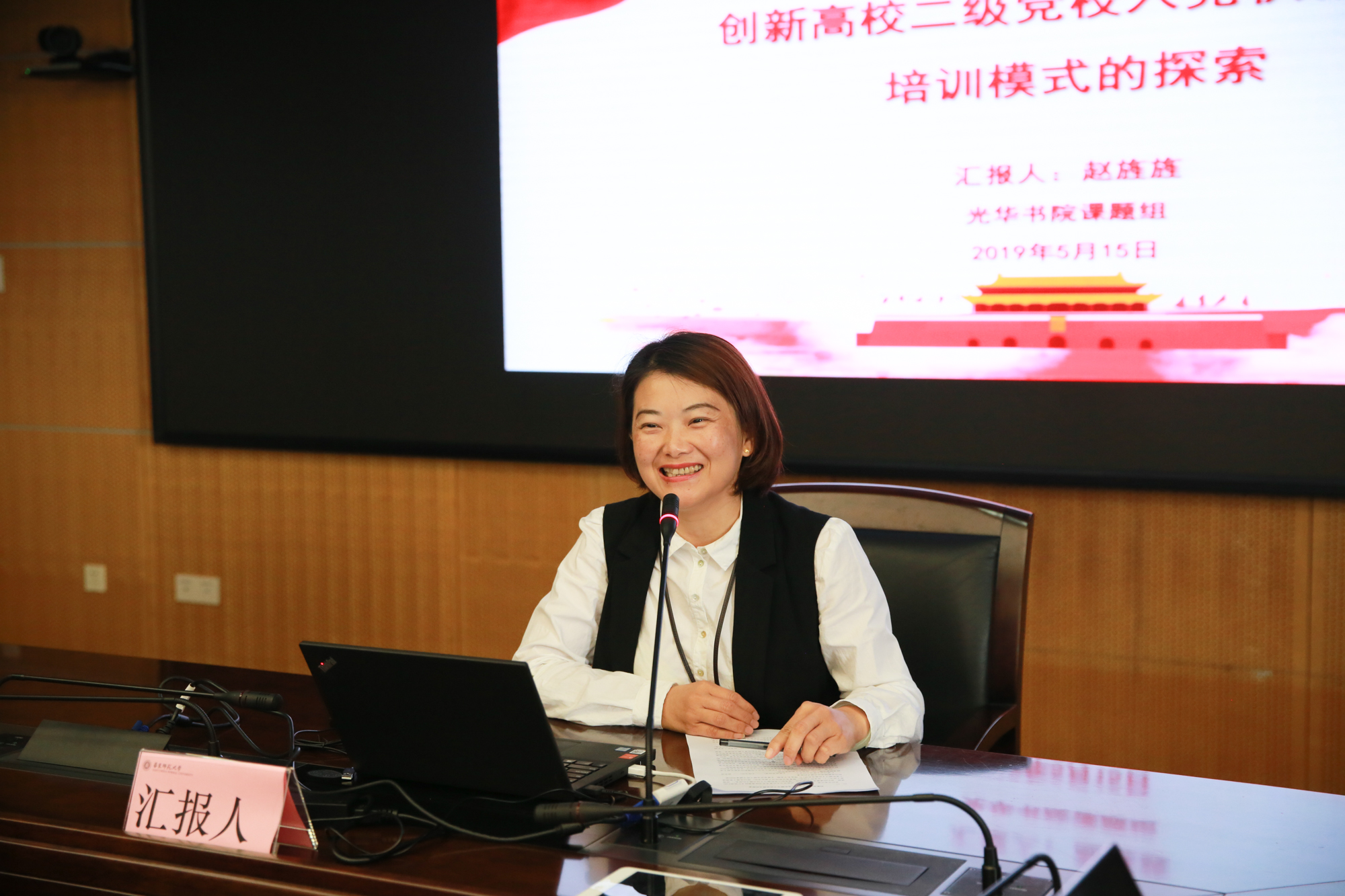 三位委托课题负责人围绕二级党校建设,分别从“创新高校二级党校入党积极分子培训模式” “三全育人”的视角下的二级党校长效机制建设研究、“以情感认同为核心,追求知信行统一——创新高校二级党校入党积极分子培训和评价模式一体化的实践”三个角度展开论述。随后,青干班4个小组分别就“新时代高校领导干部教育培训突出政治能力训练的实践策略研究”“加强和改进高校党校的教学方式研究”“高校‘双带头人’教师党支部书记教育需求及教育路径研究”“干部教育训用结合机制”四个课题进行了汇报。