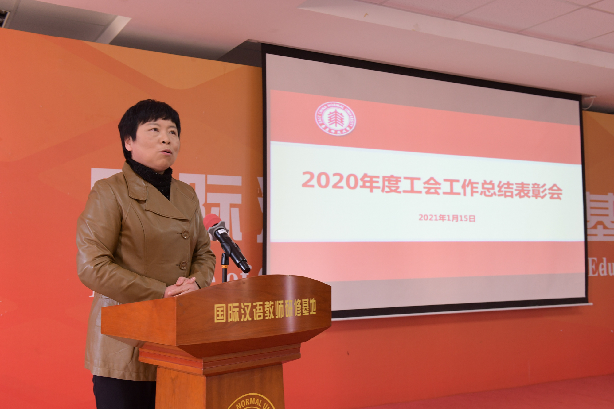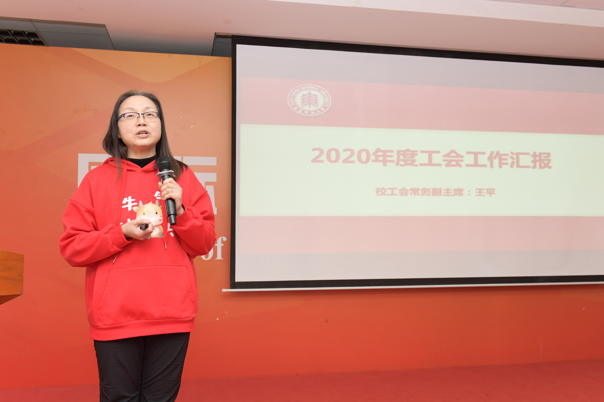 王平首先对2020年度校工会工作作了总结,她强调了校工会在学校党委和上级工会的领导下,秉承“用心、用情,不负众望”的工作理念,以“顶天、立地、引领、内功”为主线,用“买、云、理、线上线下”七个关键字着重介绍了2020年校工会的工作以及取得的成效。王平说,2020年是极不平凡的一年,面对突如其来的新冠肺炎疫情,校工会的同志们第一时间全体返岗,克服种种困难,为广大教职工紧急采购防疫物资,第一批防疫物资2月4号就送达校医院,为学校复工复课提供了有力保障。2020年是我国全面决胜脱贫攻坚之年,校工会积极配合学校,以消费扶贫的方式助力我校对口扶贫地区,还通过“832”平台、“农校对接”平台和“e帮扶”平台购买农特产品的方式做好援疆、援鄂、援黔等相关工作。我校在教育部e帮扶平台消费扶贫150余万元,在全国3000余所高校排名中位居前10。在确保安全的前提下有序复工,校工会对常规工作进行创新,在“云端”讨论工作计划、布置学期工作、推荐劳模人选、组织附校行、开展青年教师发展基金项目立项和上年度项目的评优答辩以及工会一年经费早知道专题培训等,在积极应对新冠肺炎疫情影响的同时确保了工会工作平稳有序。将原来举行的提案交办会改为“民声直通车”,通过每次约请一个职能部门与代表面对面交流,更加深入、详细地回答教职工普遍关心的问题,进一步拓宽了我校代表与职能部门的沟通渠道。为丰富我校教职工的业余文化生活,强健教职工的身心,践行“健康+”行动计划,将文体活动改为线上线下同时进行,丰富了教职工的文化生活的同时,也增强广大工会会员的归属感和凝聚力。王平表示,这些成绩的取得与党委的领导、行政的支持以及全体工会干部对工会工作的关心、支持和努力密不可分,她对广大工会干部的辛勤工作表示衷心的感谢,同时也表示校工会将进一步深化“不忘初心、牢记使命”主题教育的成果,继续加强工会内涵建设,助力学校双一流发展。最后,她通过广大工会干部向全校教职工致以新春的祝福。