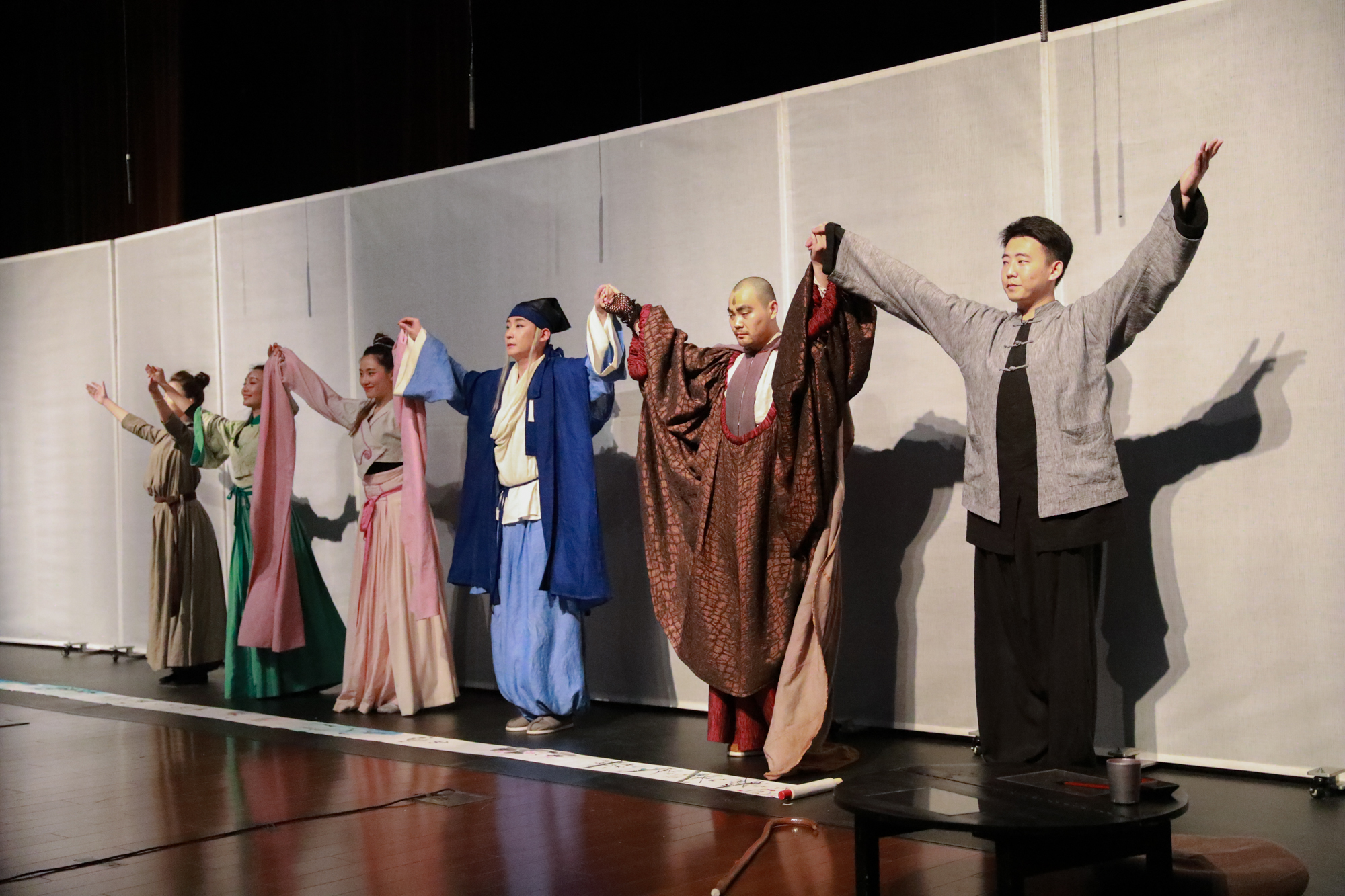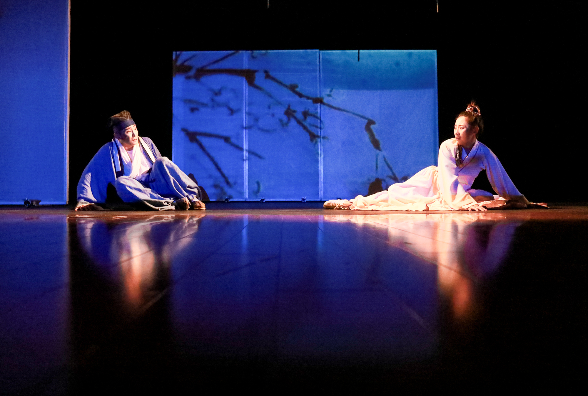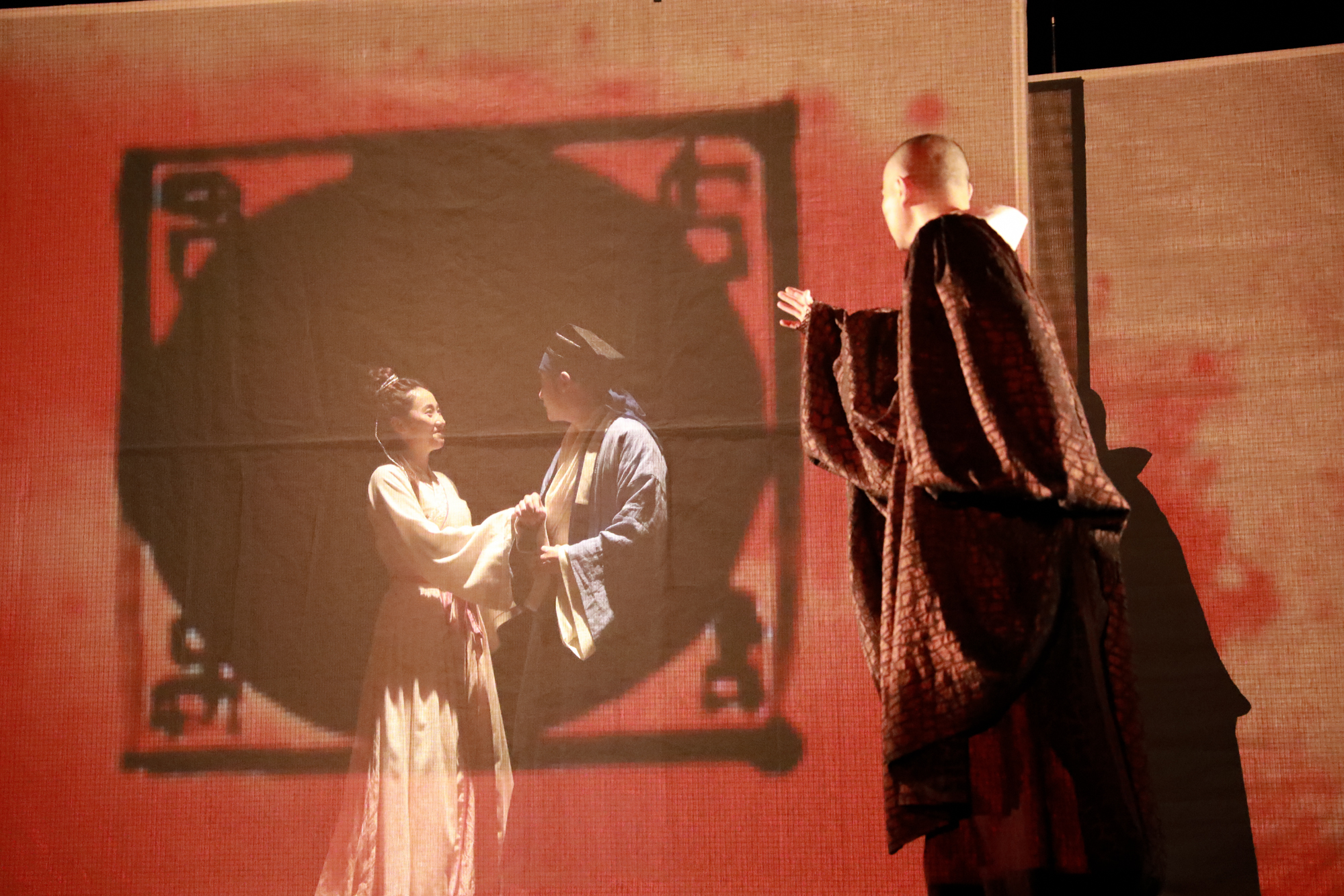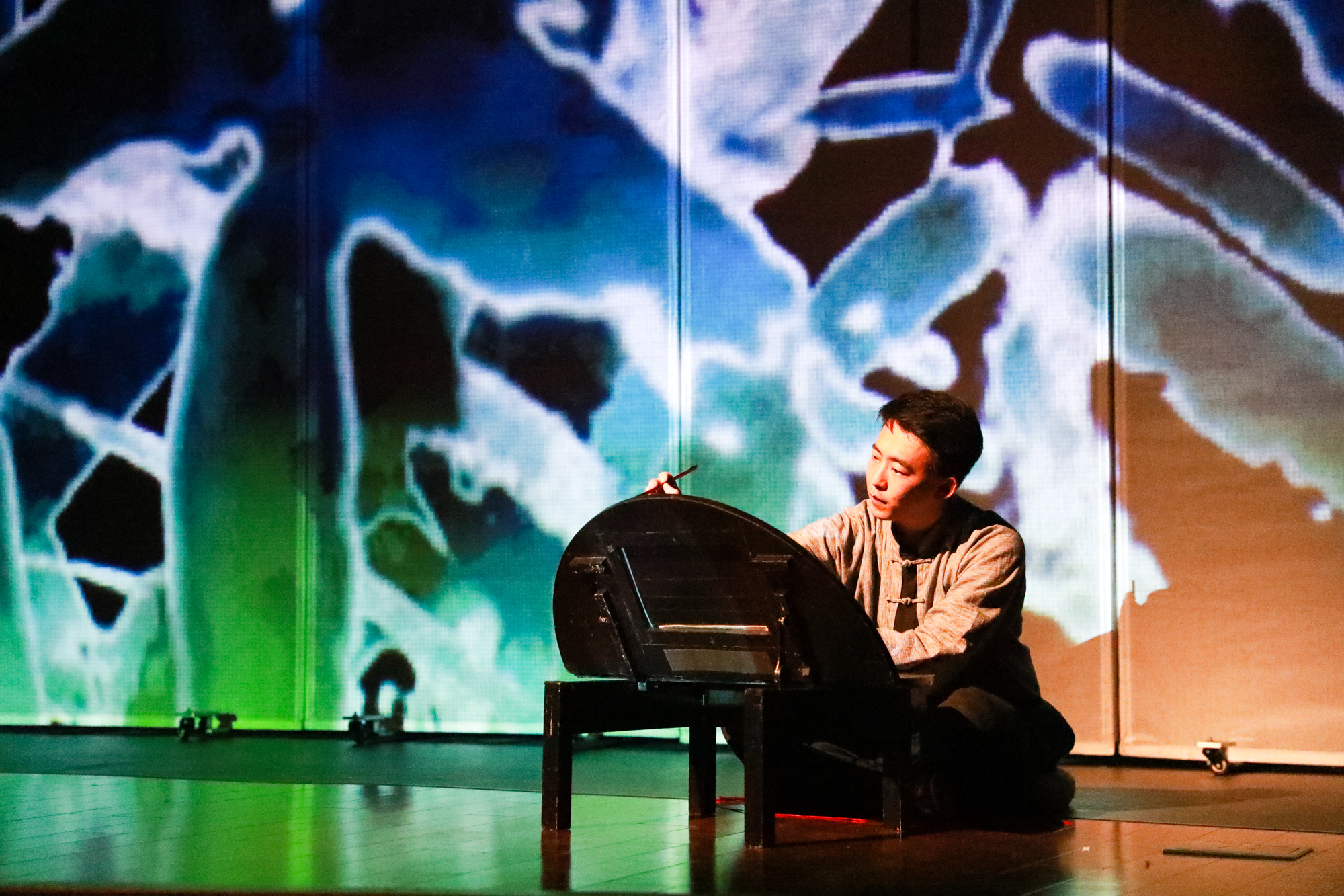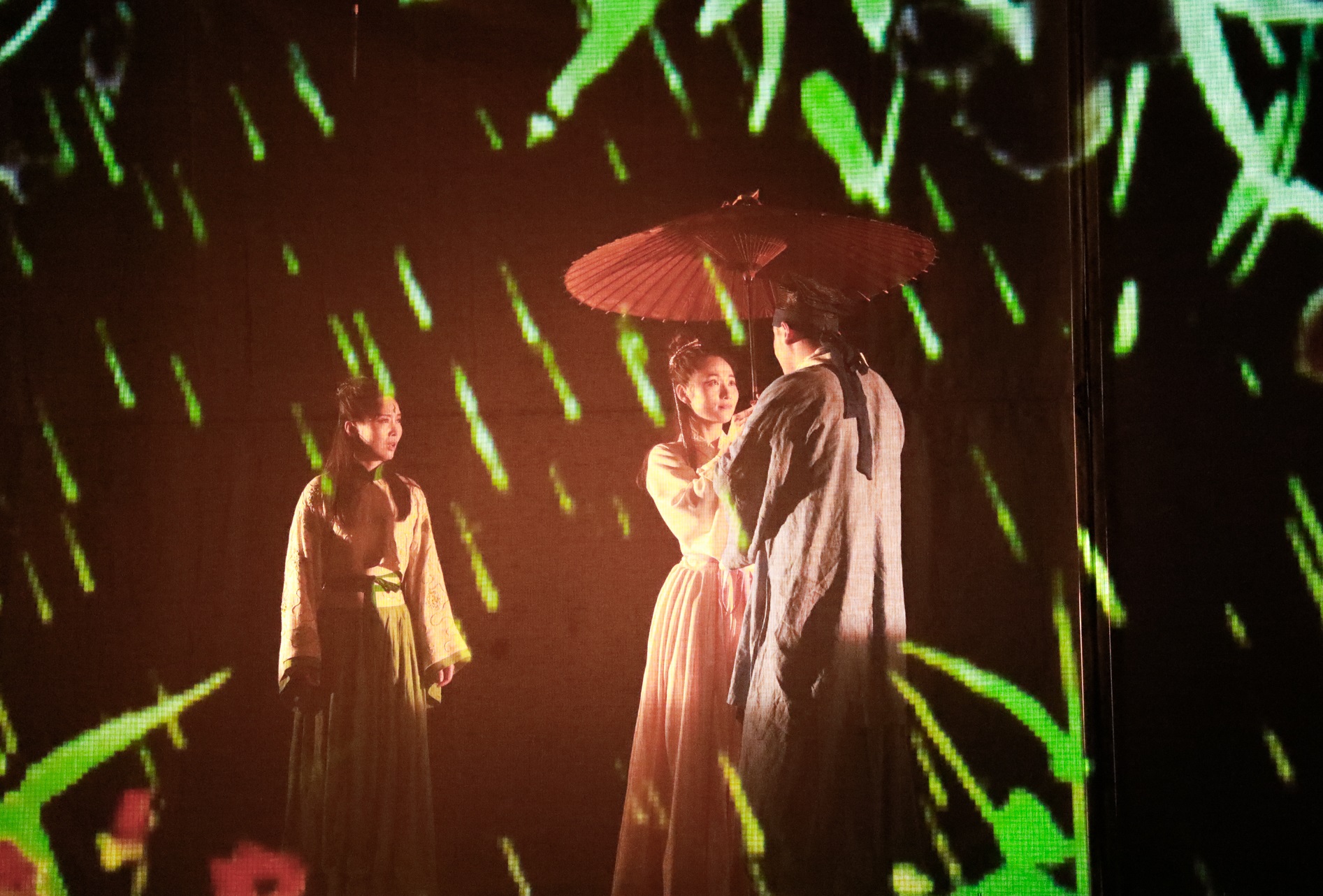 黑暗中,一束绚丽的光芒横贯演出厅上方,白色的幕布上映照出一幅幅水墨图景,舞台一侧,一个布衣男子正缓缓讲述一个流传许久的故事。这正是4月25日晚于我校大夏舞台上演的、由上海话剧艺术中心出品的多媒体舞台剧《白蛇传》。