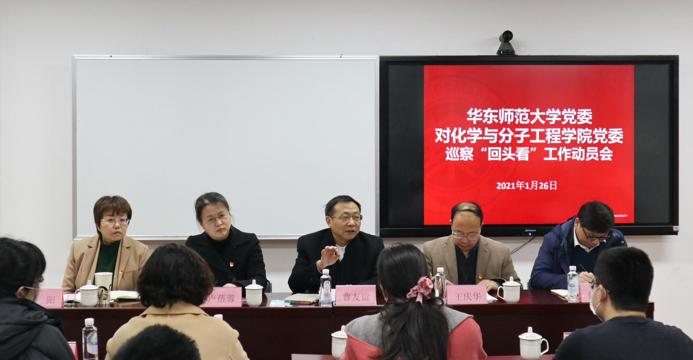 巡察“回头看”工作组组长王庆华介绍了本次巡察“回头看”工作任务和安排。传播学院、化学与分子工程学院主要负责人分别汇报了学院巡察整改落实情况。