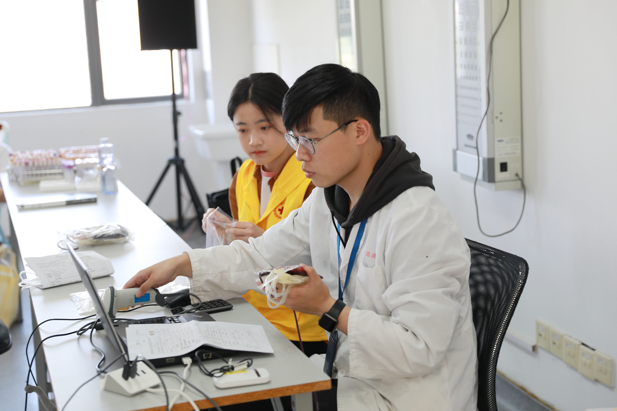 献血现场,医务人员忙碌有序地开展着工作,无偿献血的师生则认真填写献血登记表,进行测量血压、抽血化验等基本检测,以确保血液质量和献血者的健康。采血现场播放着舒缓的轻音乐,以缓解献血师生的紧张情绪。随着初检、登记、采血等一个个步骤的完成,满含爱心的鲜红血液缓缓流向血袋。据悉,今天共有191人成功献血,采集全血38200毫升。各院系的书记、辅导员们也一直在现场陪伴。