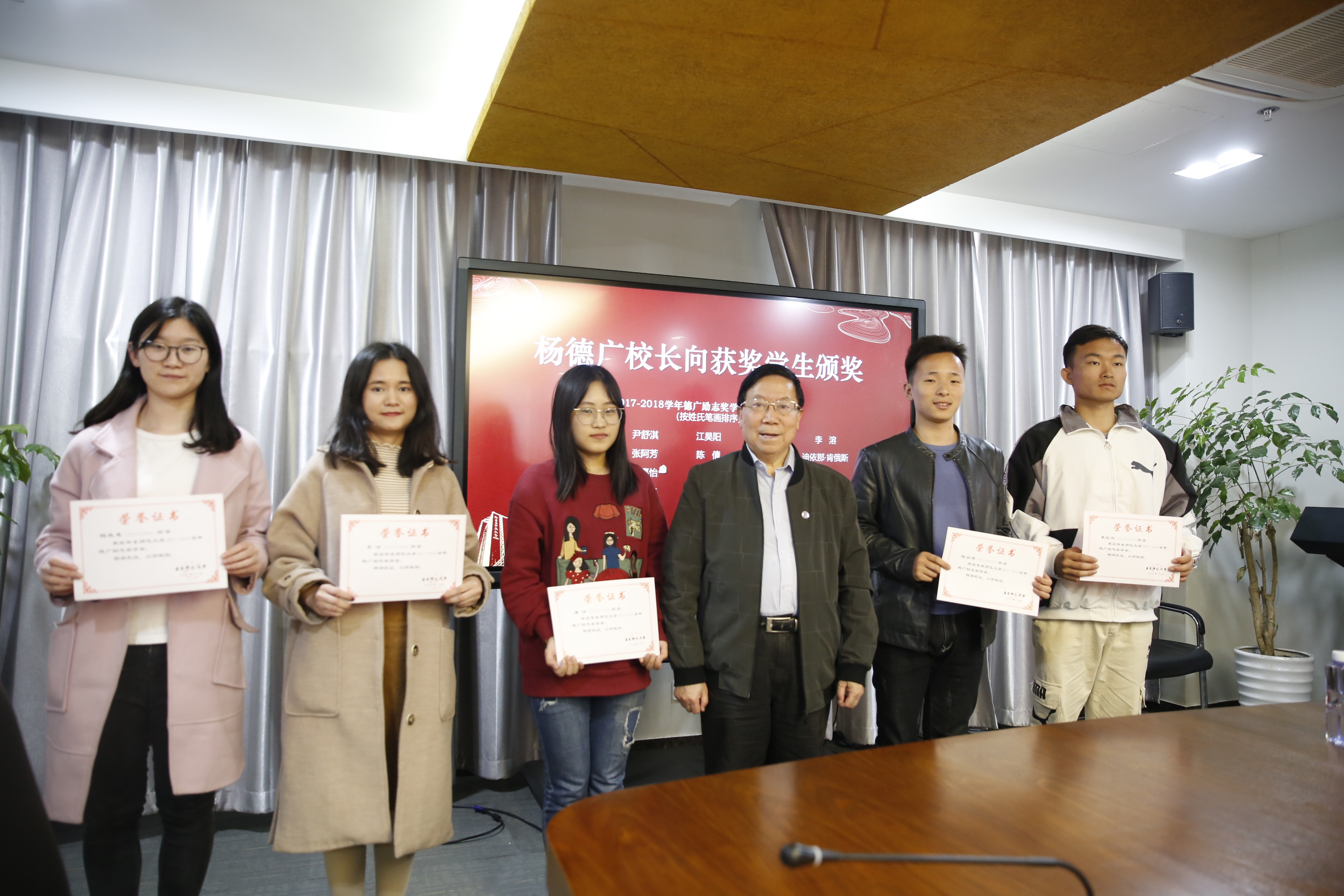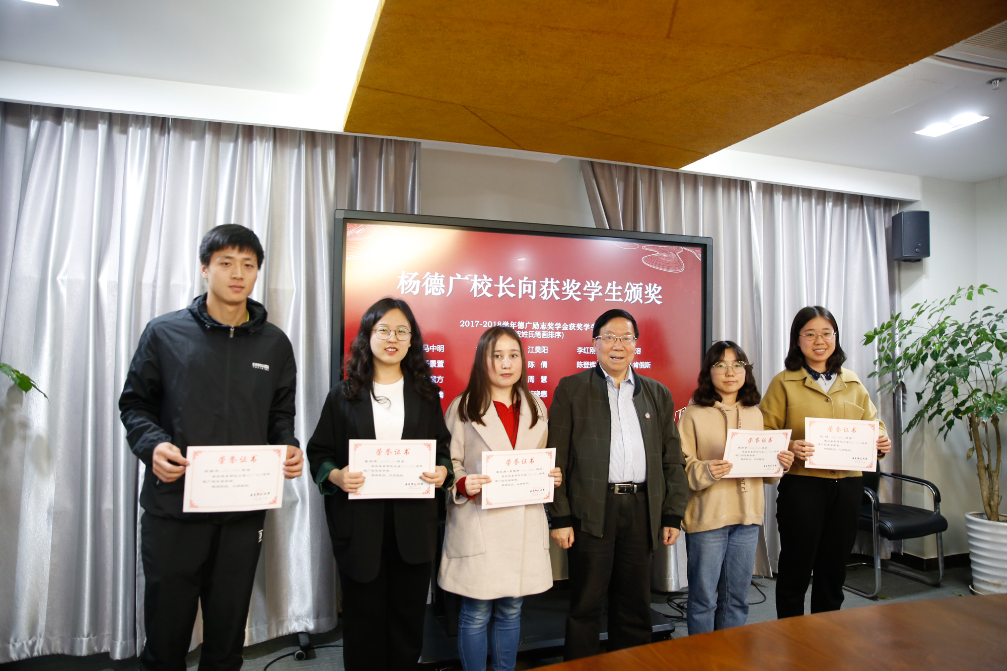 周赛君就2017—2018学年“德广励志奖学金”评选情况进行汇报,并宣读了获奖同学名单。杨德广为获奖学生颁发表彰证书。