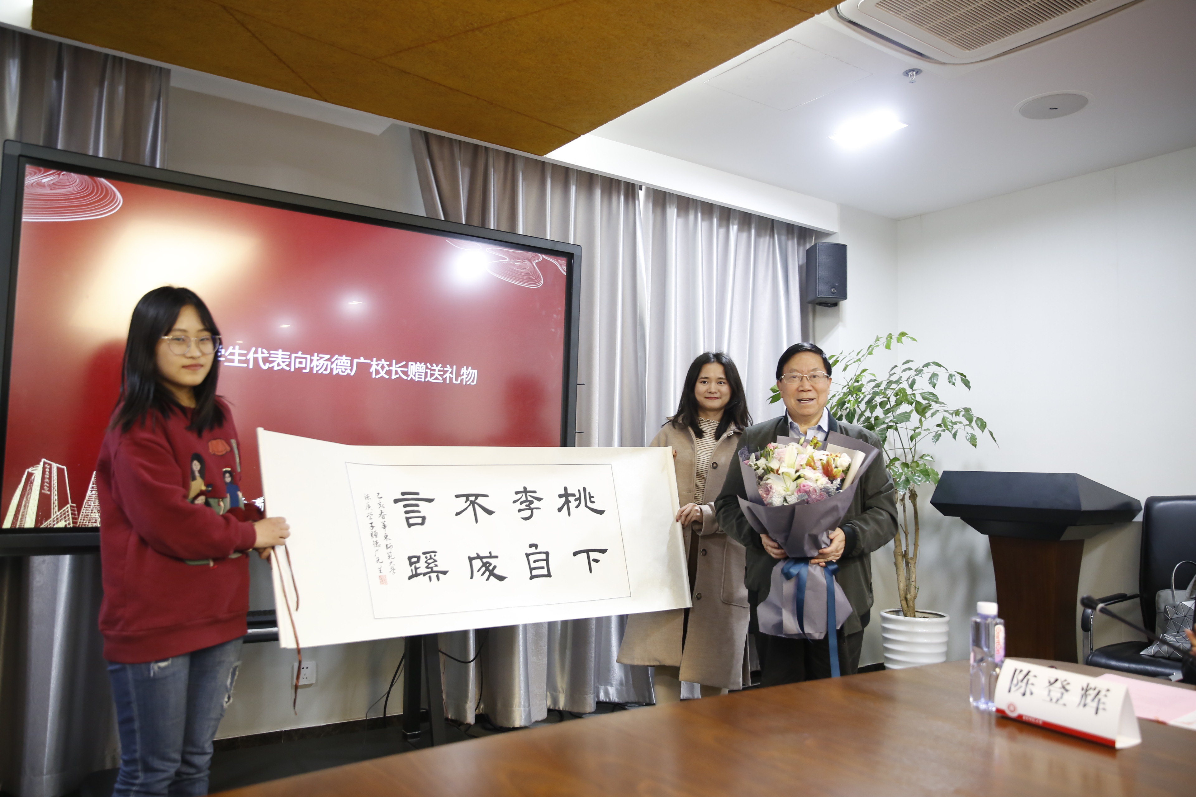 获奖学生代表向杨德广赠送了书法作品:“桃李不言,下自成蹊”,感谢杨德广的关爱和慷慨捐赠。2015级学前教育专业的杨景萱作为学生代表发言,她向杨德广汇报了自己作为一名师范生学习、实践、志愿服务的心路历程,并表示要“牢记使命,不忘初心”,努力学习、积极实践,为成为一名优秀的未来教师做准备,同时积极参加公益活动,传递爱和温暖。2016级学前教育专业的梁杰现场弹唱《奉献》一曲,用歌声表达了对杨德广的真诚谢意和以他为榜样奉献教育事业的决心。