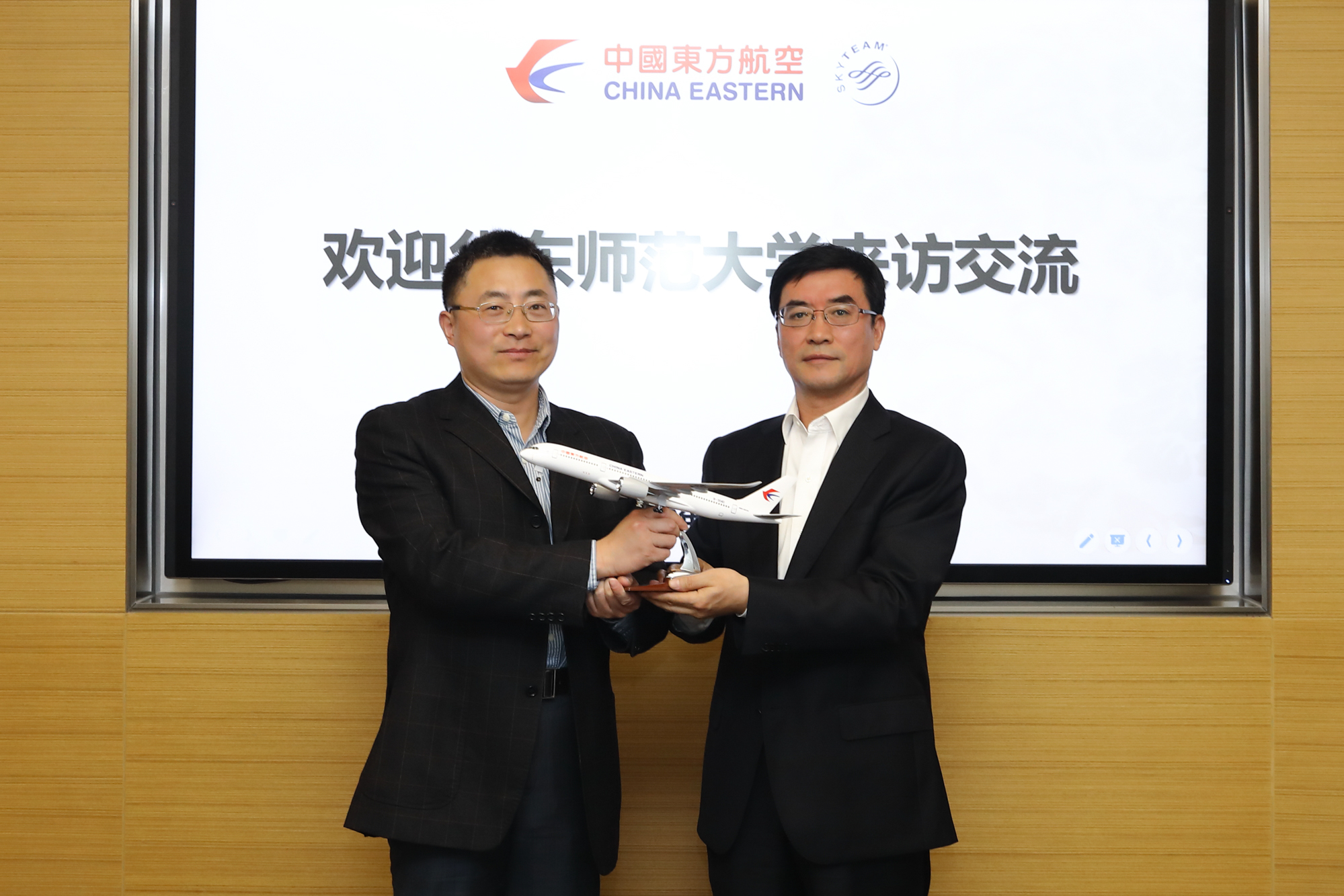 东航集团党组宣传部部长、党委宣传部部长李江向我校学生工作党委书记、学生工作部部长余佳展示东航集团的飞机模型
