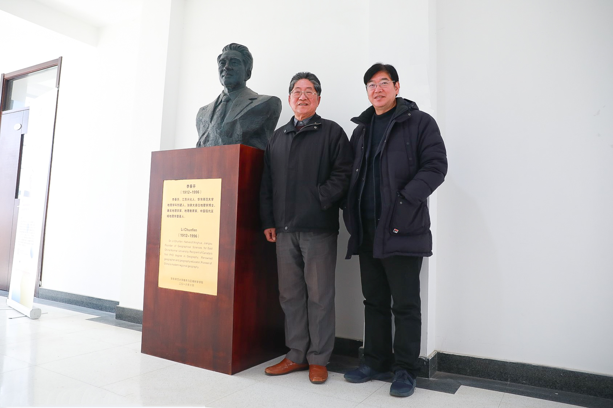 杜德斌(右)、蒋长瑜与李春芬铜像合影