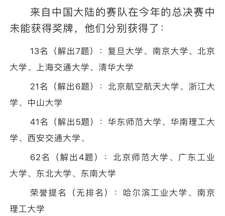 北京时间4月5日零点,第43届ACM国际大学生程序设计竞赛全球总决赛在葡萄牙波尔图大学落下帷幕。经过多场亚洲区域的拼搏,从国内上千支队伍中杀出重围,成功晋级全球总决赛的华东师大计算机科学与软件工程学院三名本科生张羽戈、林方欣、周亦然组队,最终成绩位列全球第41名。在晋级全球总决赛的大陆高校中,并列第9名。