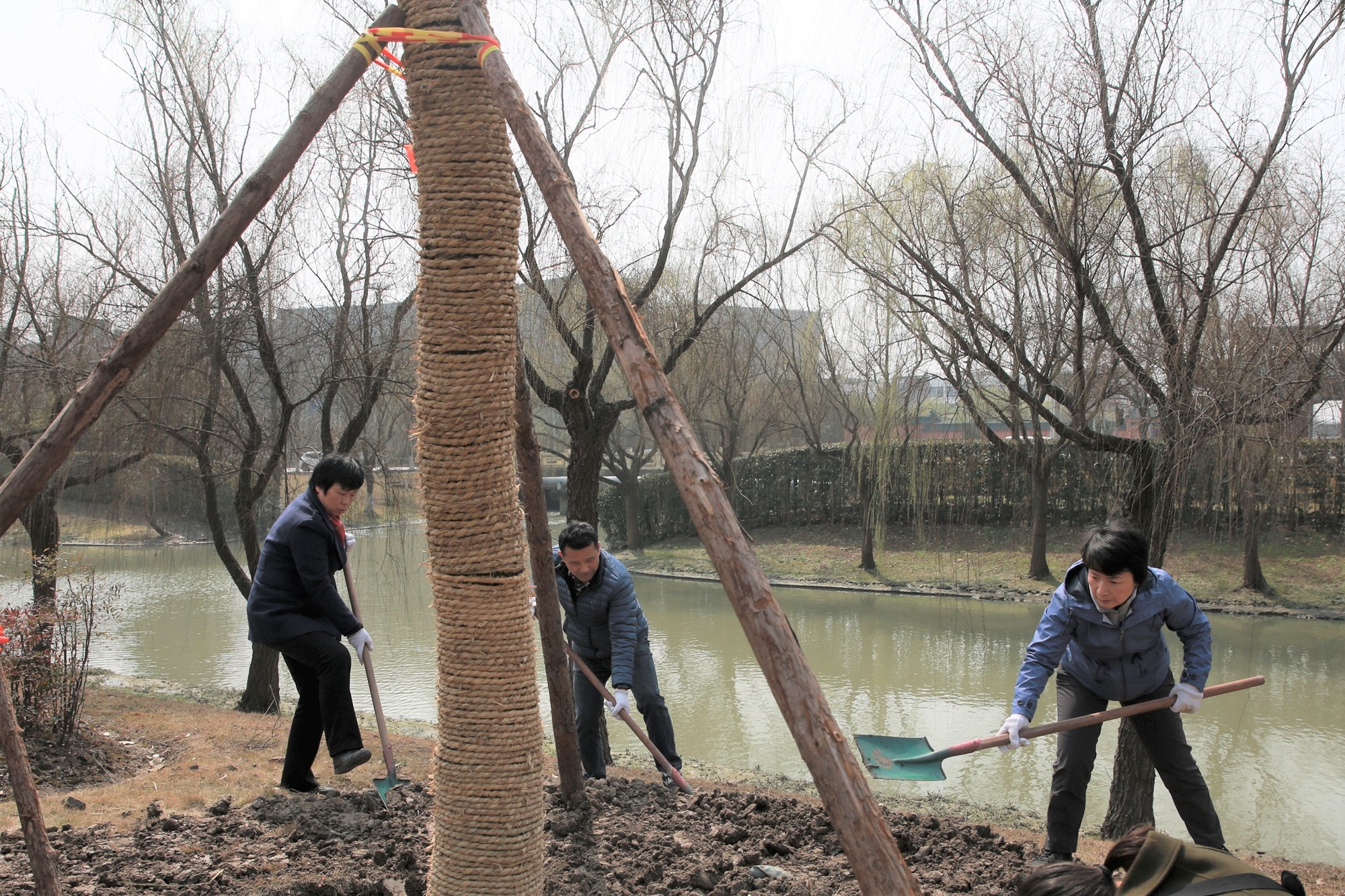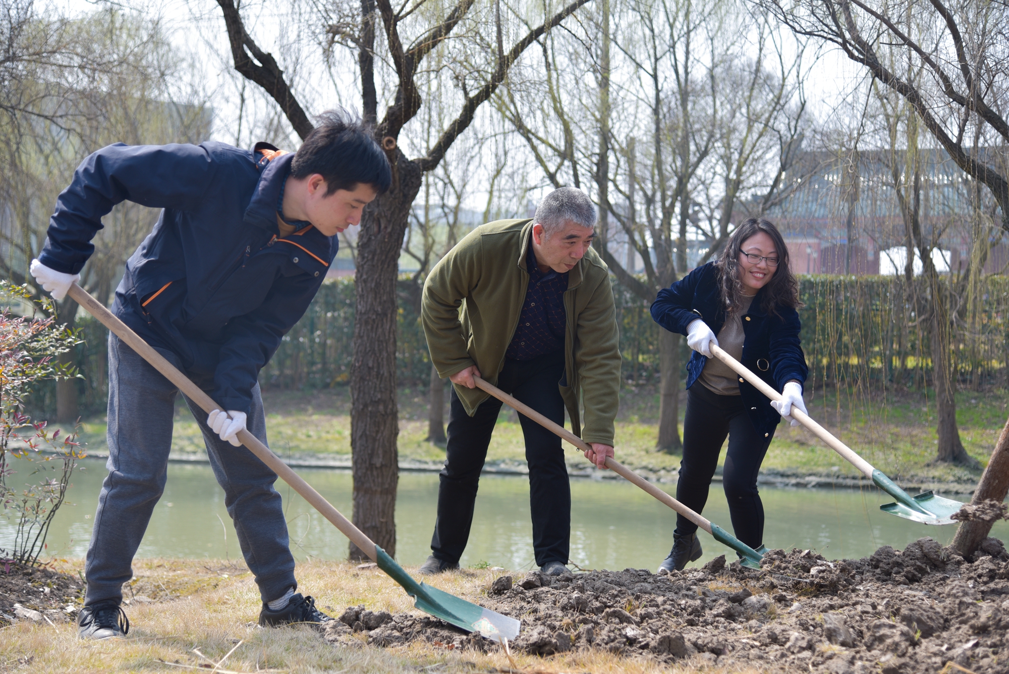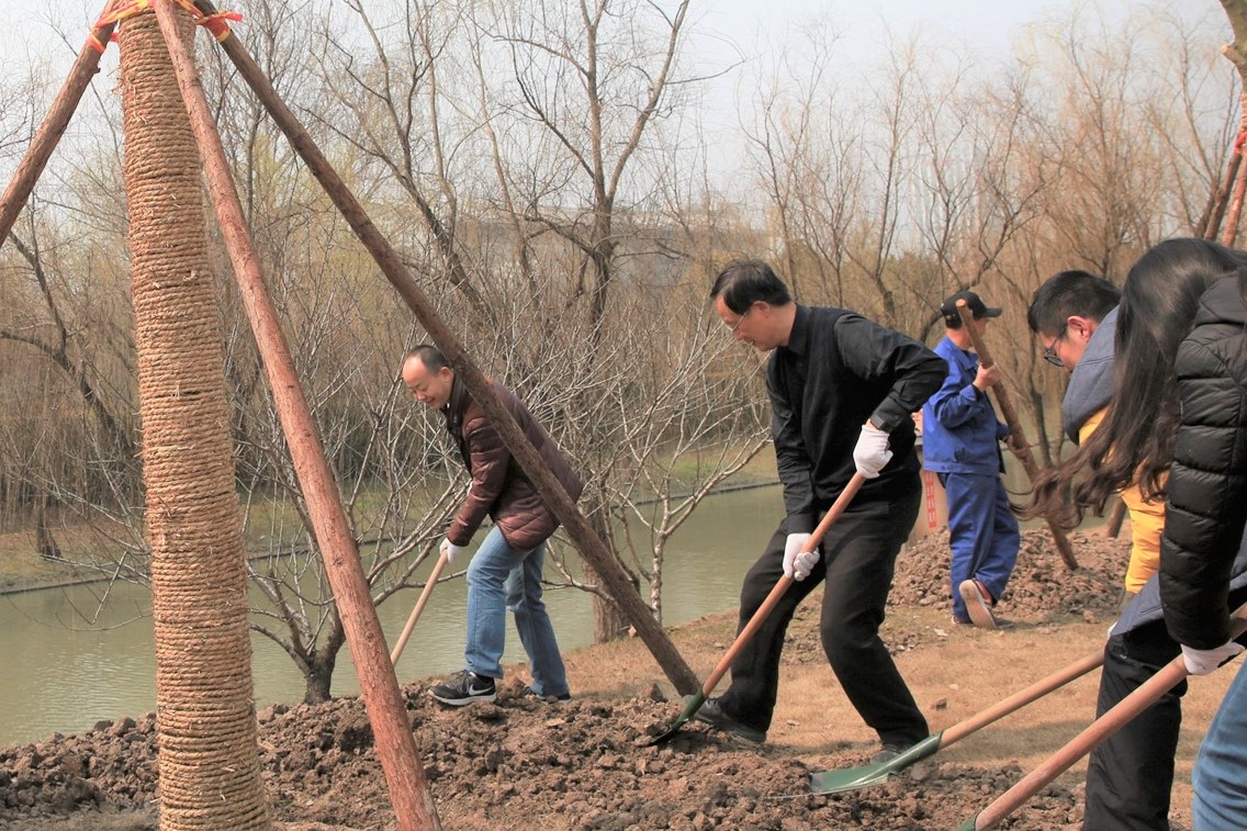 植树点位于樱桃河畔的光华路上,属第三教学楼、第四教学楼绿化范围内。植树现场一片热火朝天景象:师生们一起挥锹铲土填入树坑,培实新土堆起围堰。