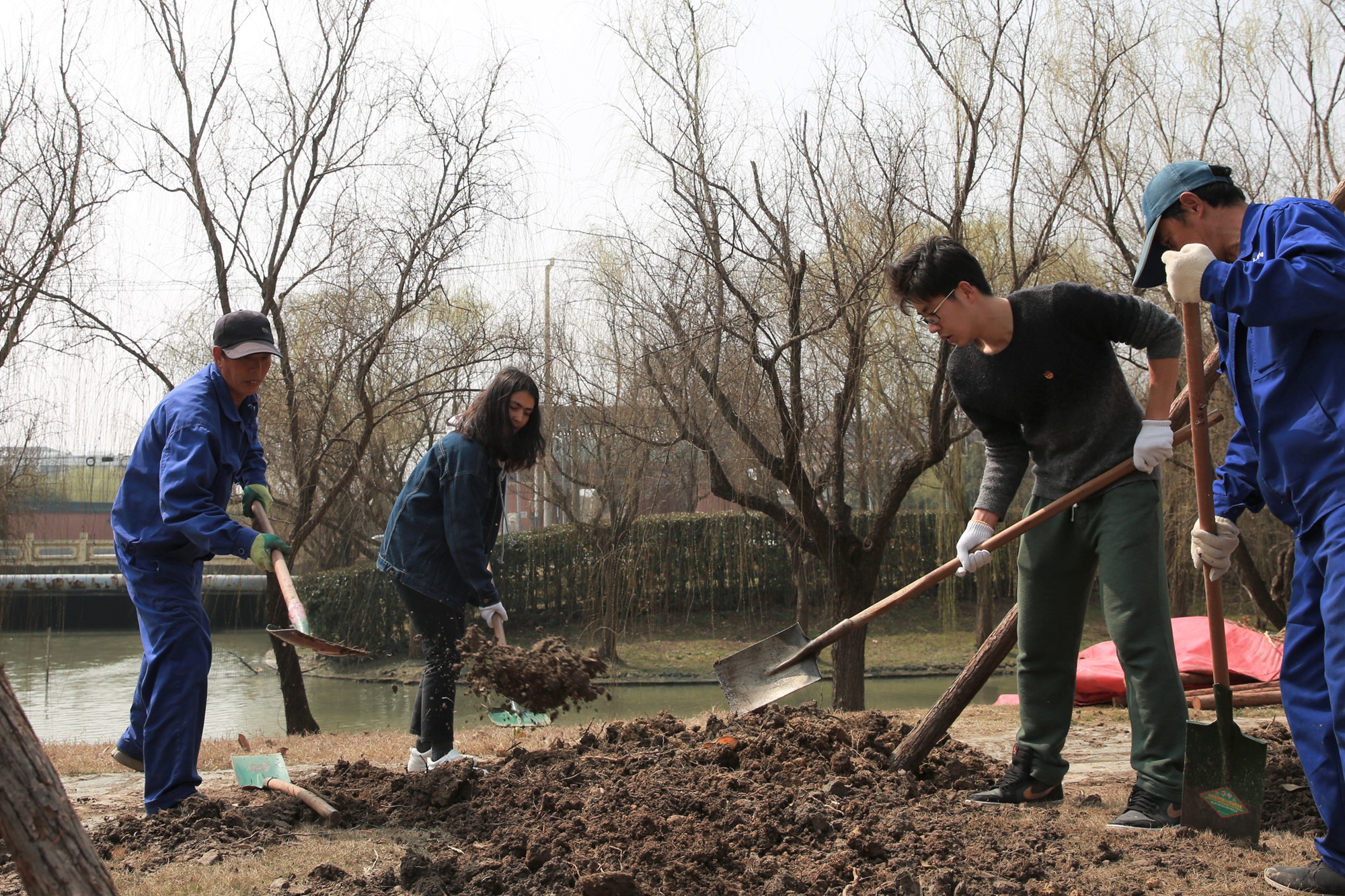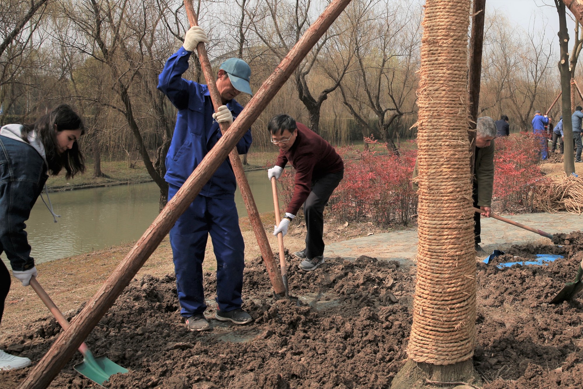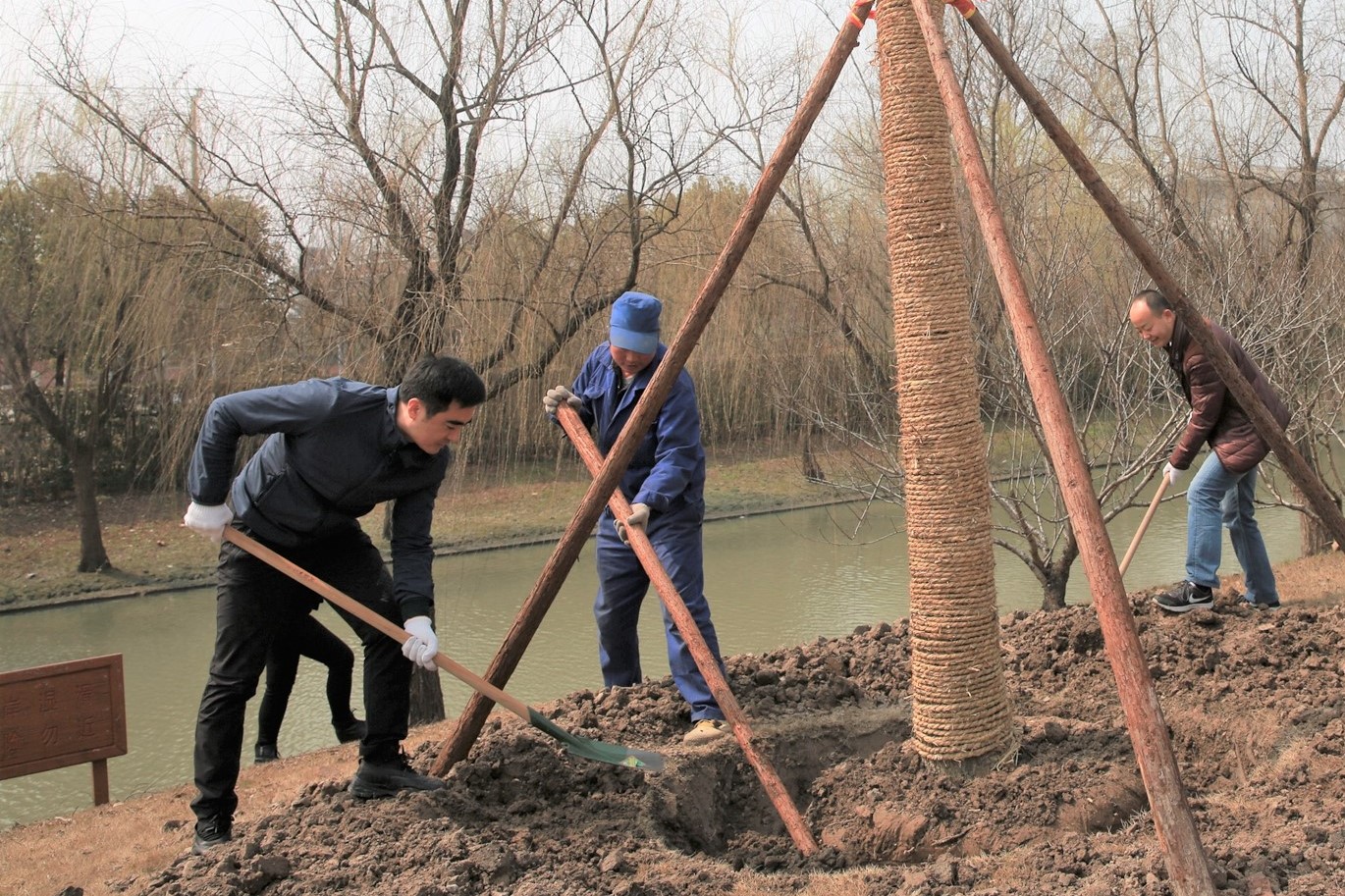 植树点位于樱桃河畔的光华路上,属第三教学楼、第四教学楼绿化范围内。植树现场一片热火朝天景象:师生们一起挥锹铲土填入树坑,培实新土堆起围堰。