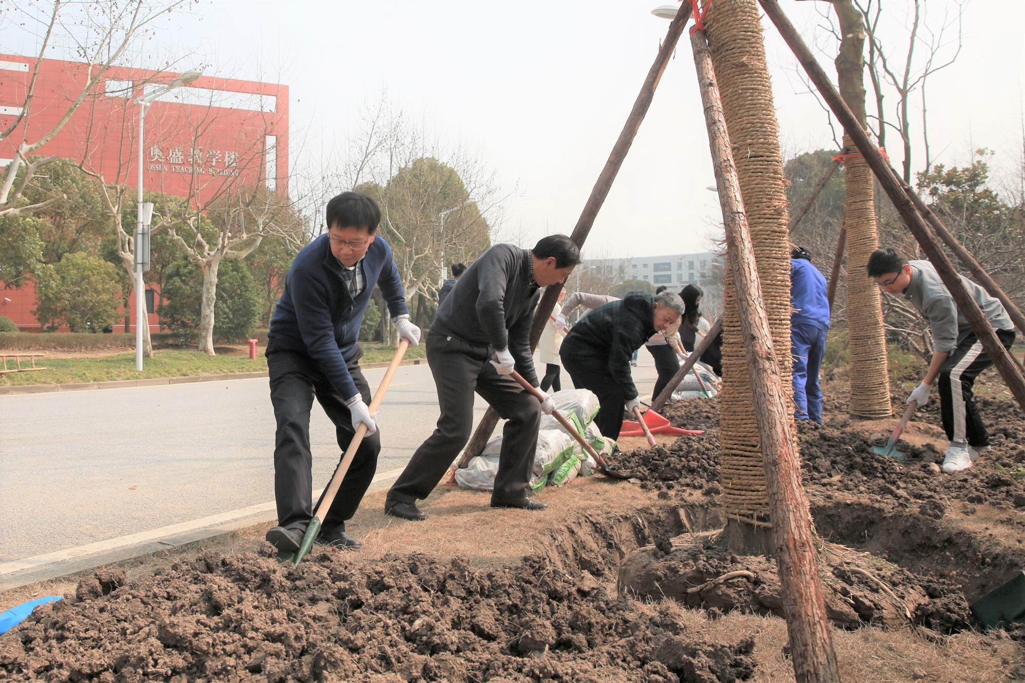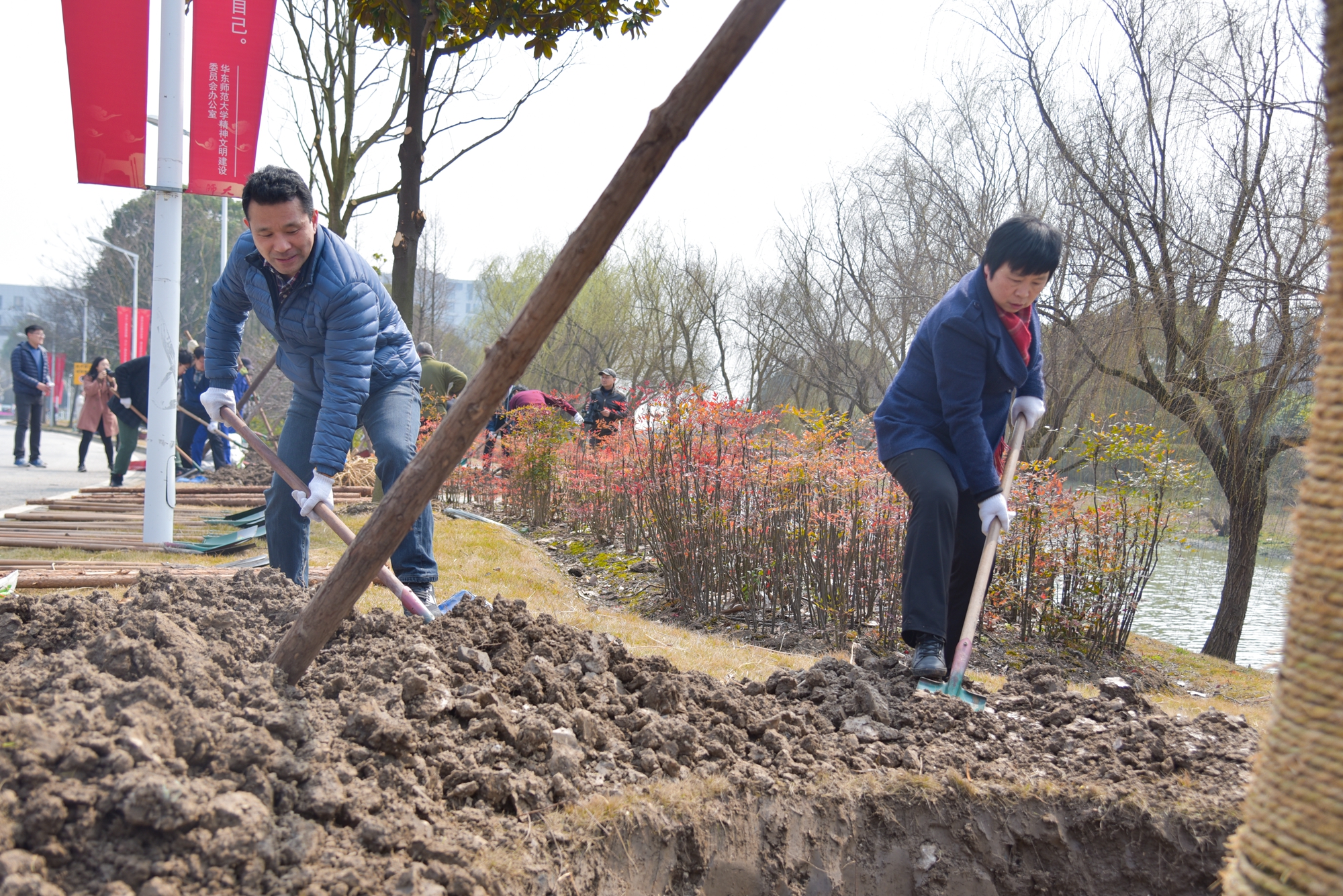 校领导与师生一起挥锹培土
