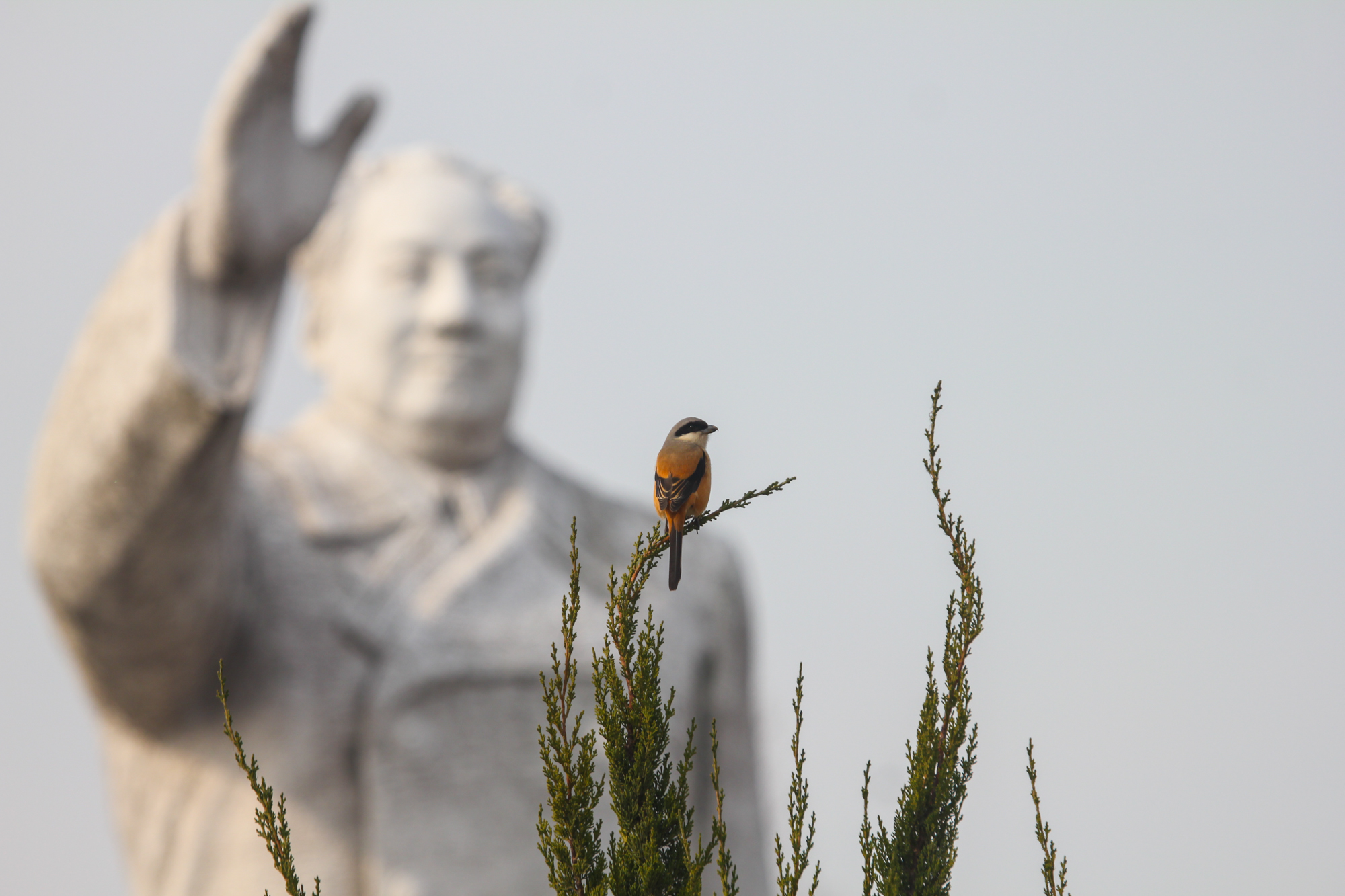 在毛主席像前的松树上站着的棕背伯劳居高临下,霸气得很——要说树林里最醒目的鸟,则非棕背伯劳莫属了。它们喜欢出现在突兀的树顶、电线杆乃至房顶上,并不断“嘎嘎嘎”地拖长声音叫嚷,威风凛凛。伯劳经常在校园里上演“模仿秀”,除了模仿其它鸟类的叫声,在校园里生活久了,他们甚至能模仿发出汽车鸣笛的声音。