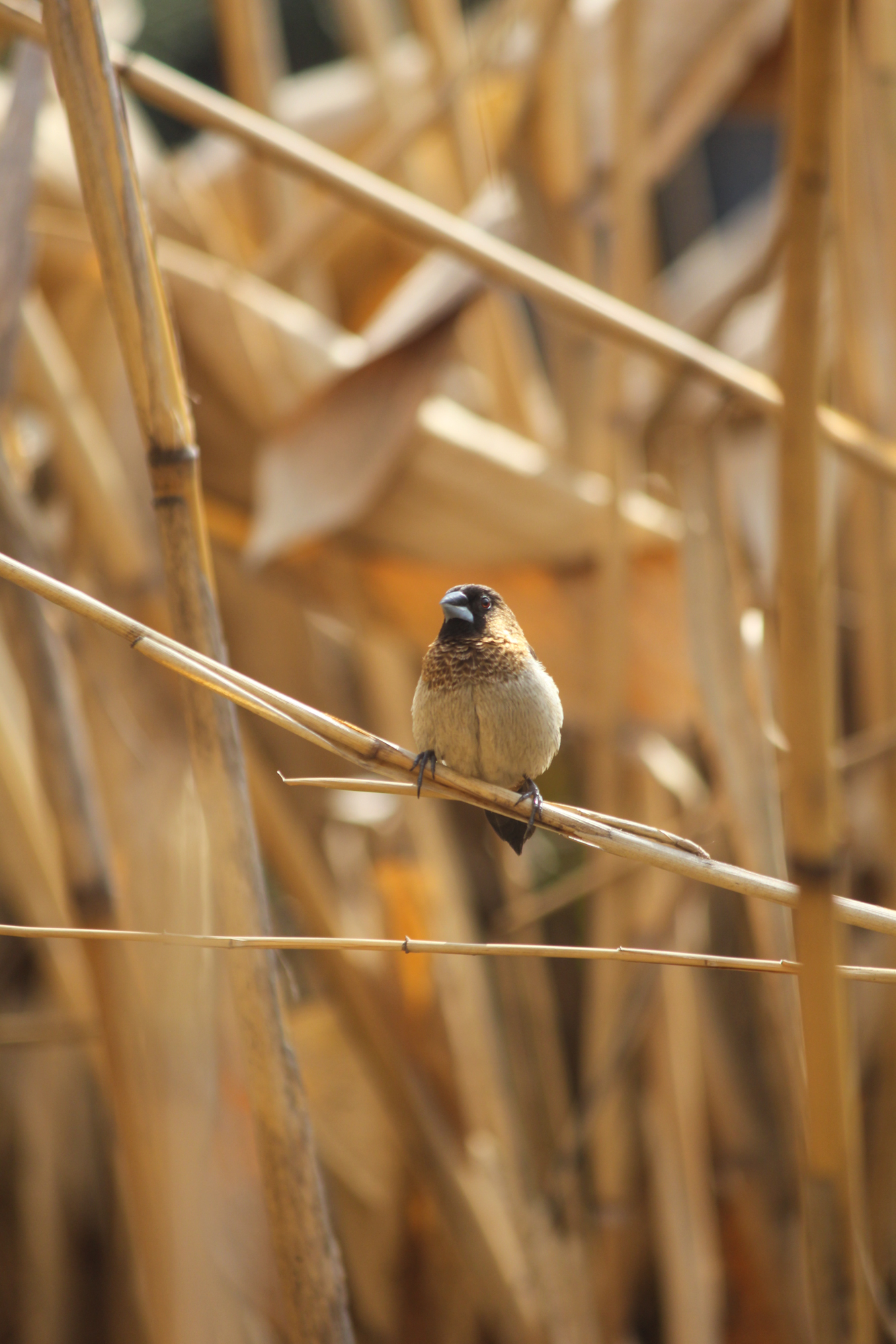 我们有时候还能发现一小群暗褐色的小鸟,它们无论是飞翔还是停歇时,都常常喜欢十几只小鸟挤成一团,这是白腰文鸟。