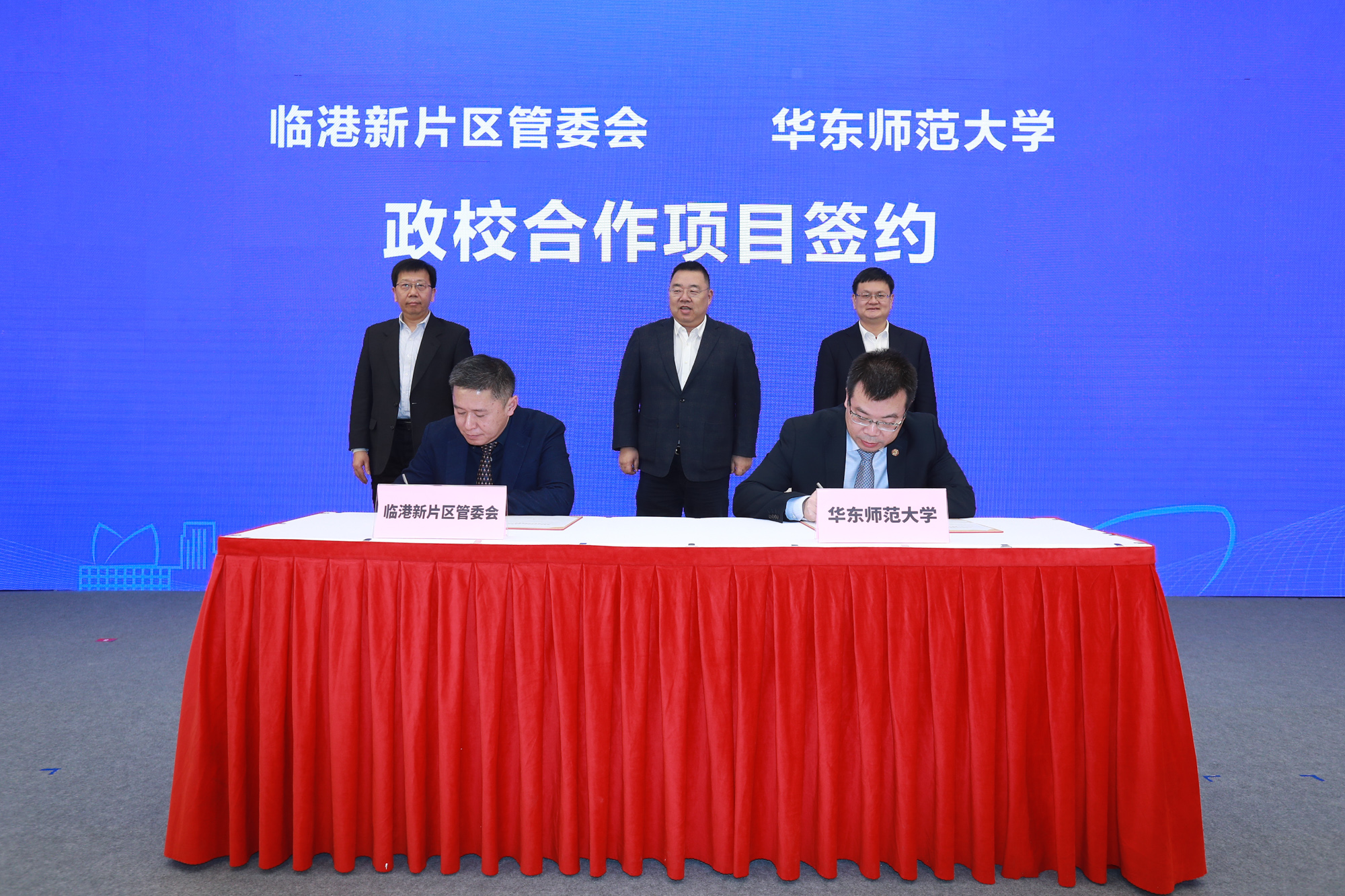 上海市教委主任王平,华东师大校长钱旭红,临港新片区党工委副书记、临港集团董事长袁国华见证