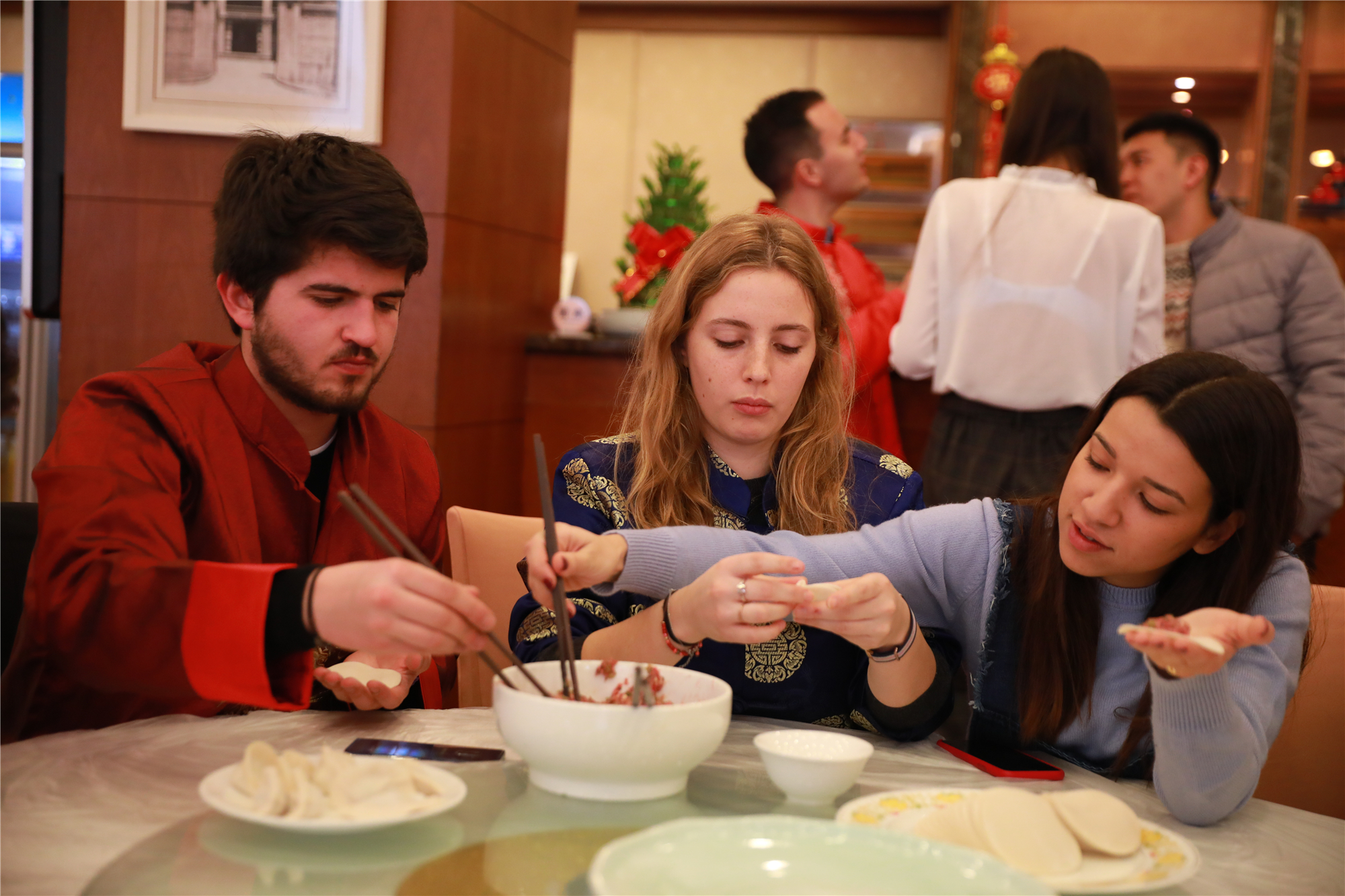 留学生围成一桌包饺子