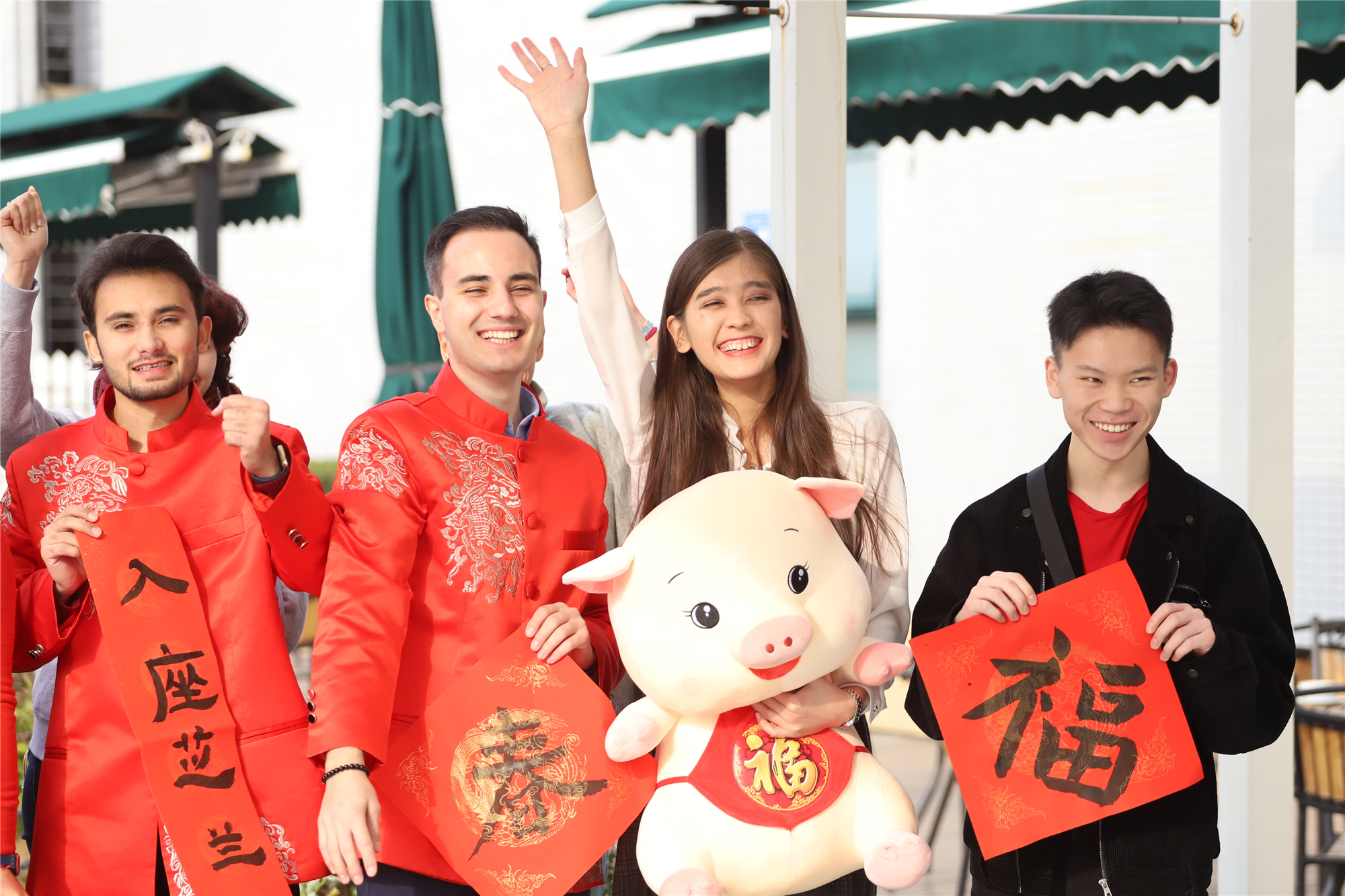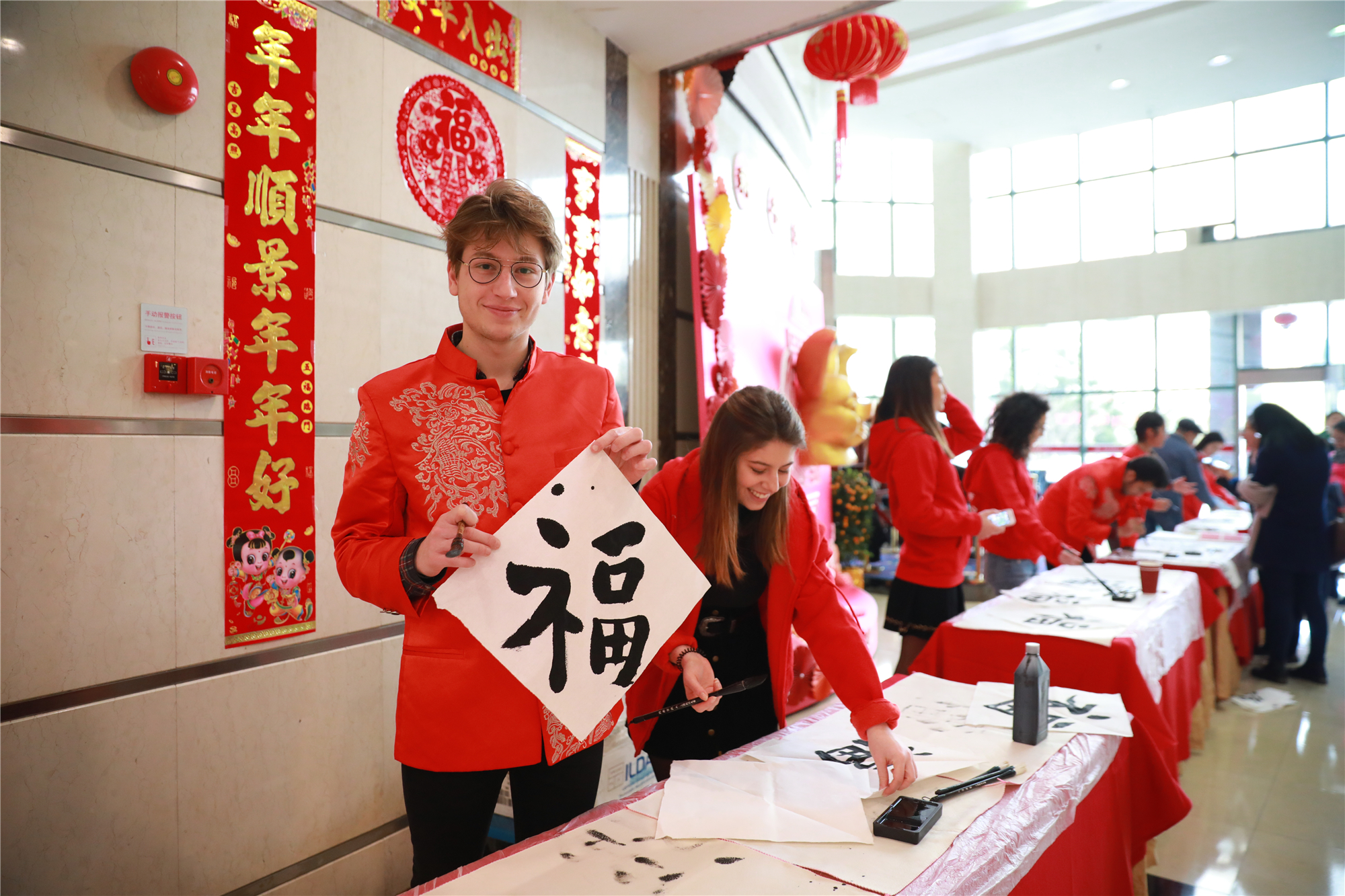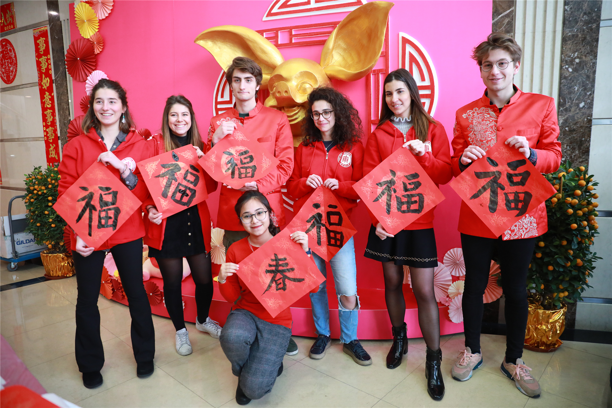 活动现场年味十足,红红火火的灯笼、门联,大大小小的传统生肖年的“猪”装饰物,身着唐装的“洋面孔”,来自各国的留学生欢聚一堂。