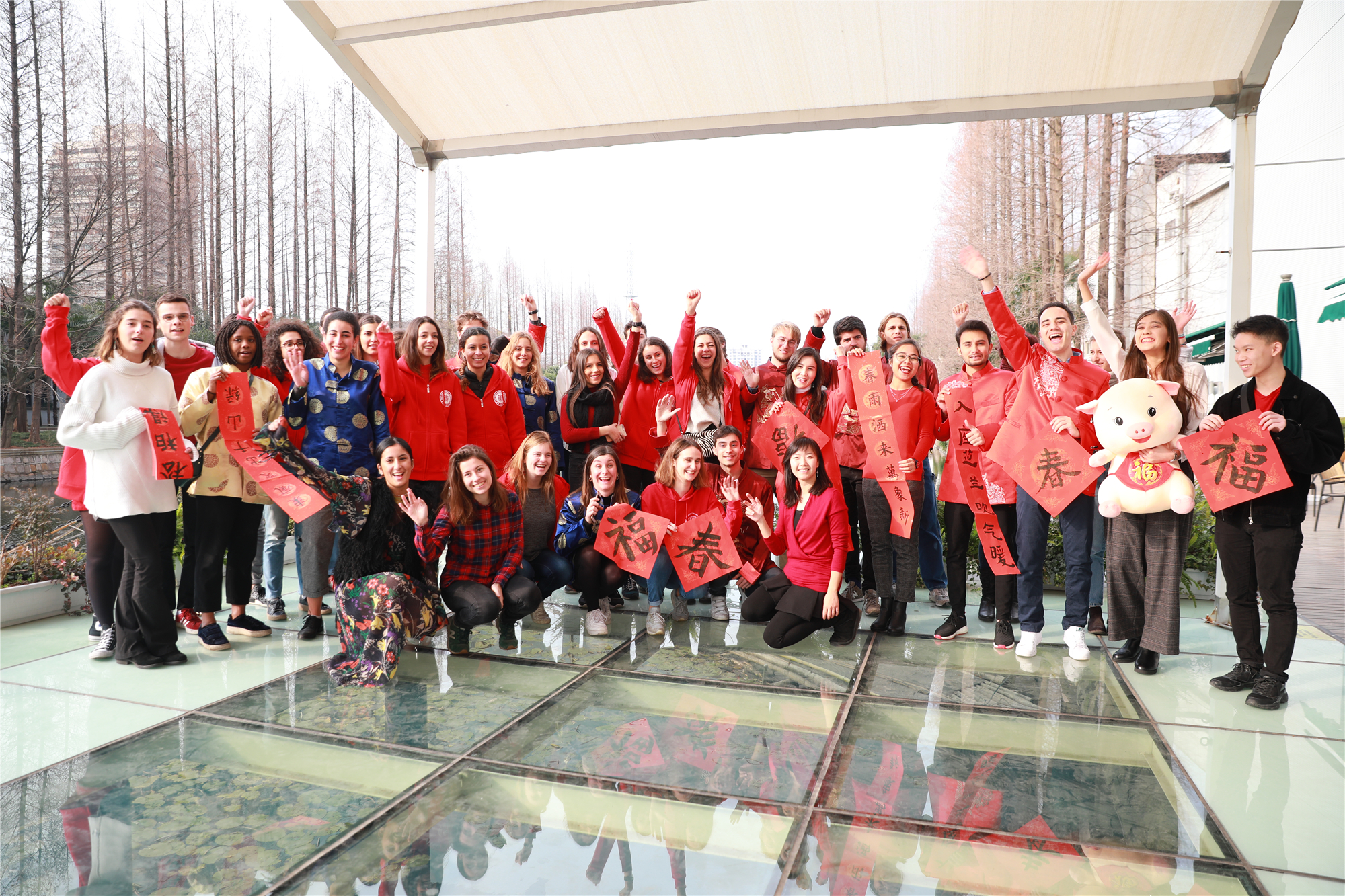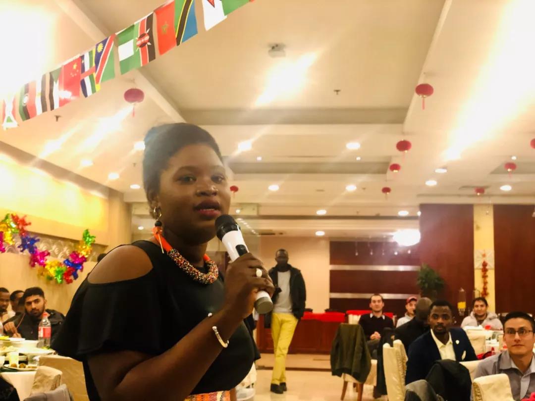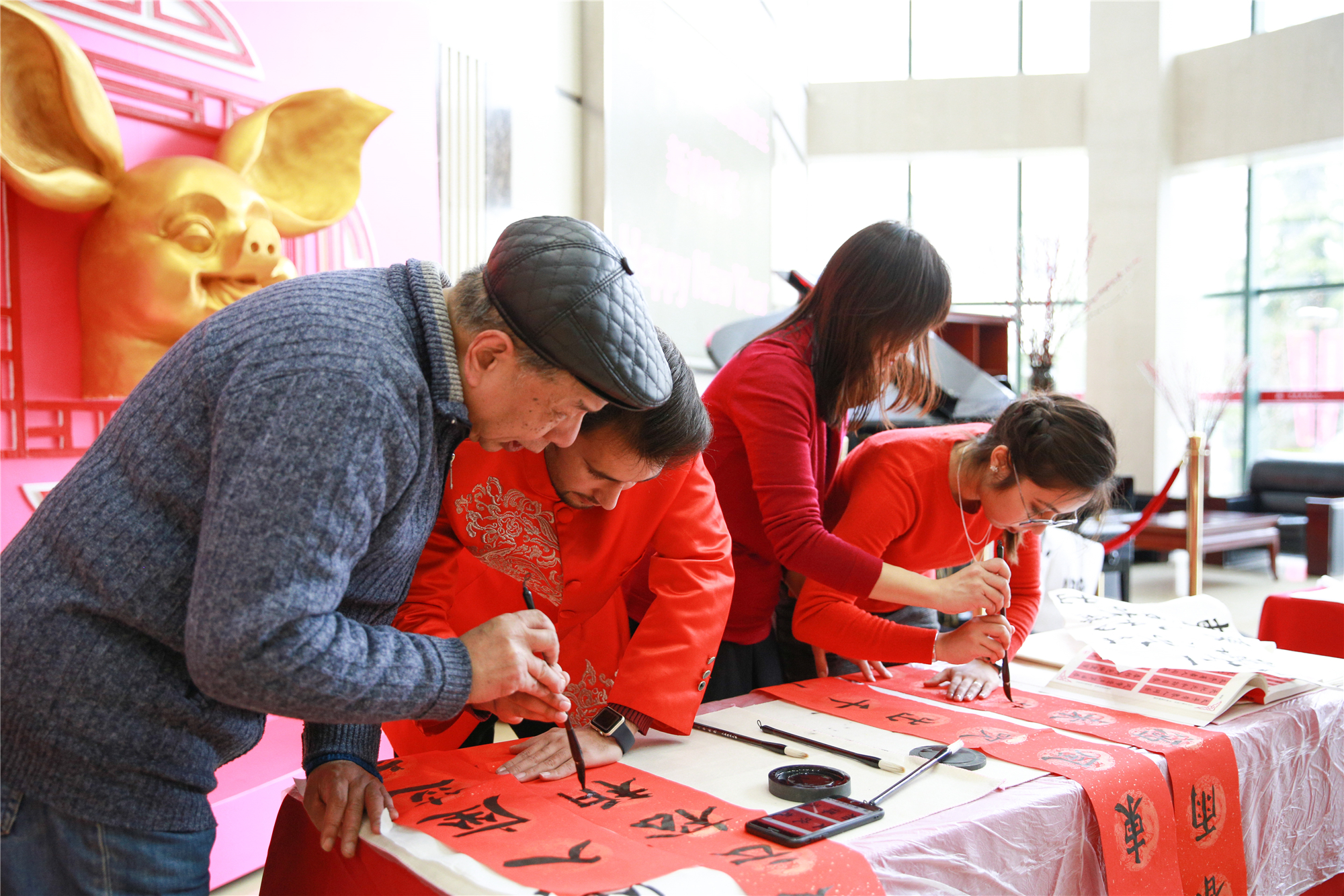 活动现场年味十足,红红火火的灯笼、门联,大大小小的传统生肖年的“猪”装饰物,身着唐装的“洋面孔”,来自各国的留学生欢聚一堂。