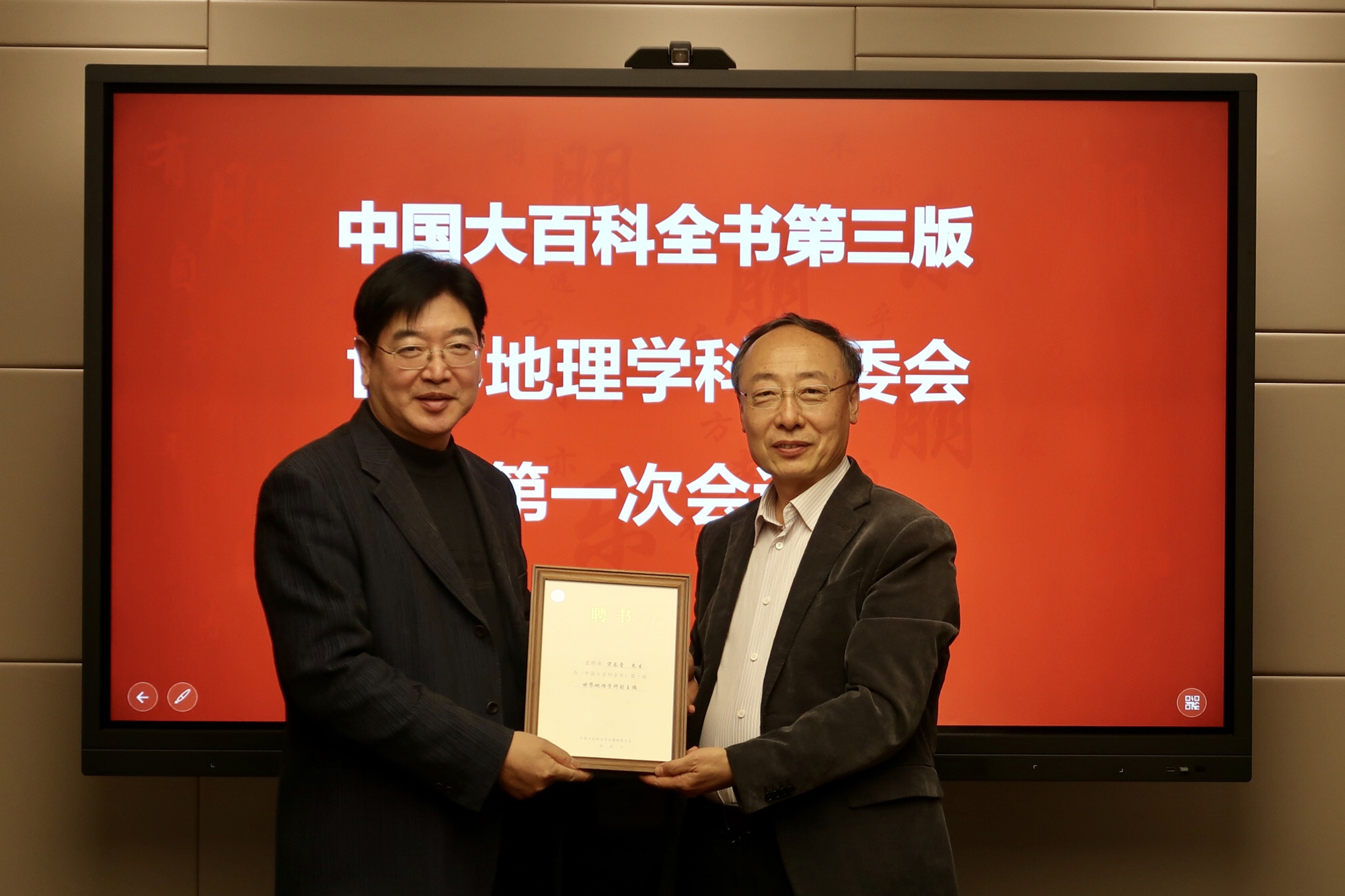 《中国大百科全书》第三版世界地理学科主编杜德斌(左)为宋长青教授颁发副主编聘书