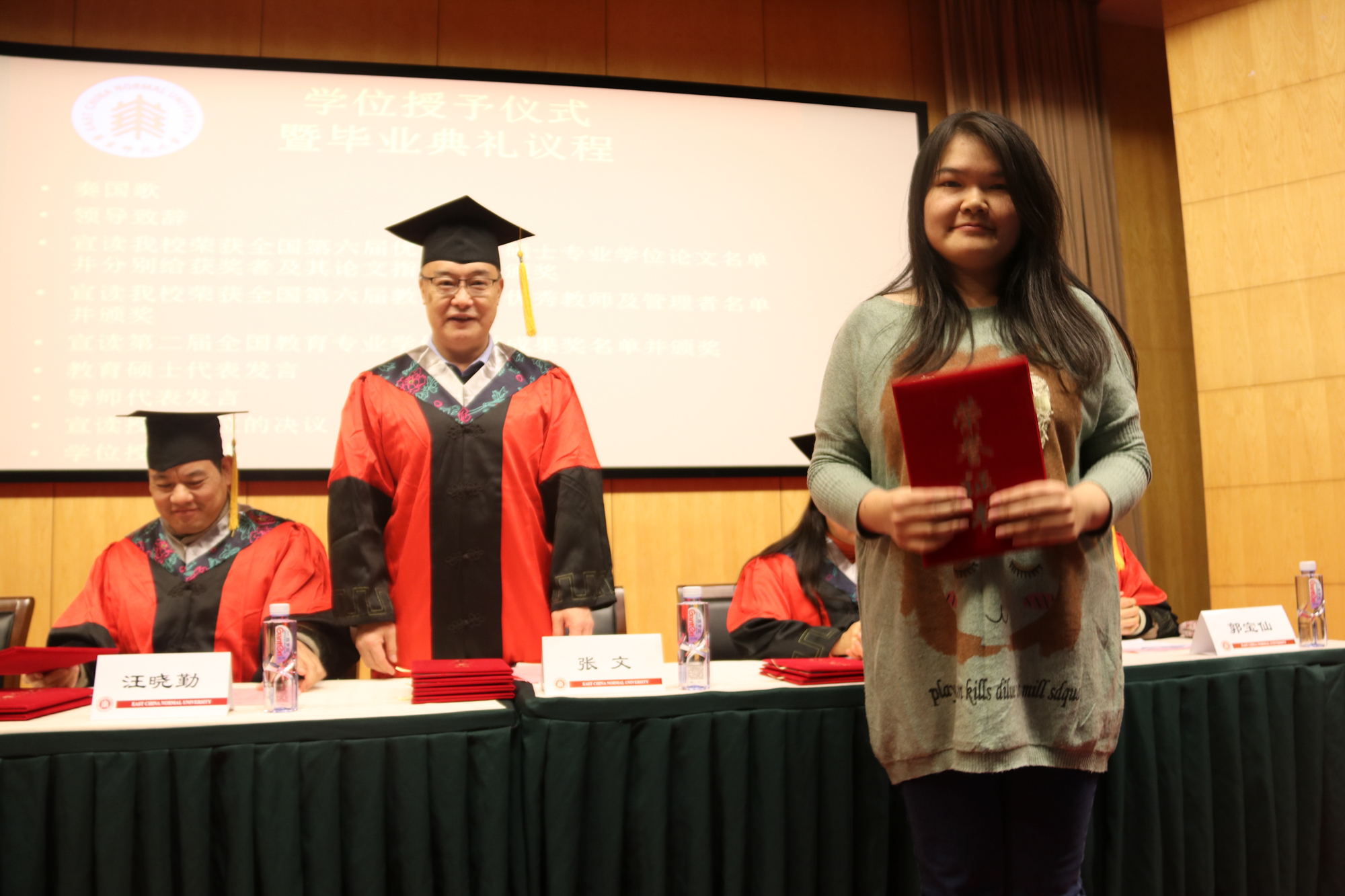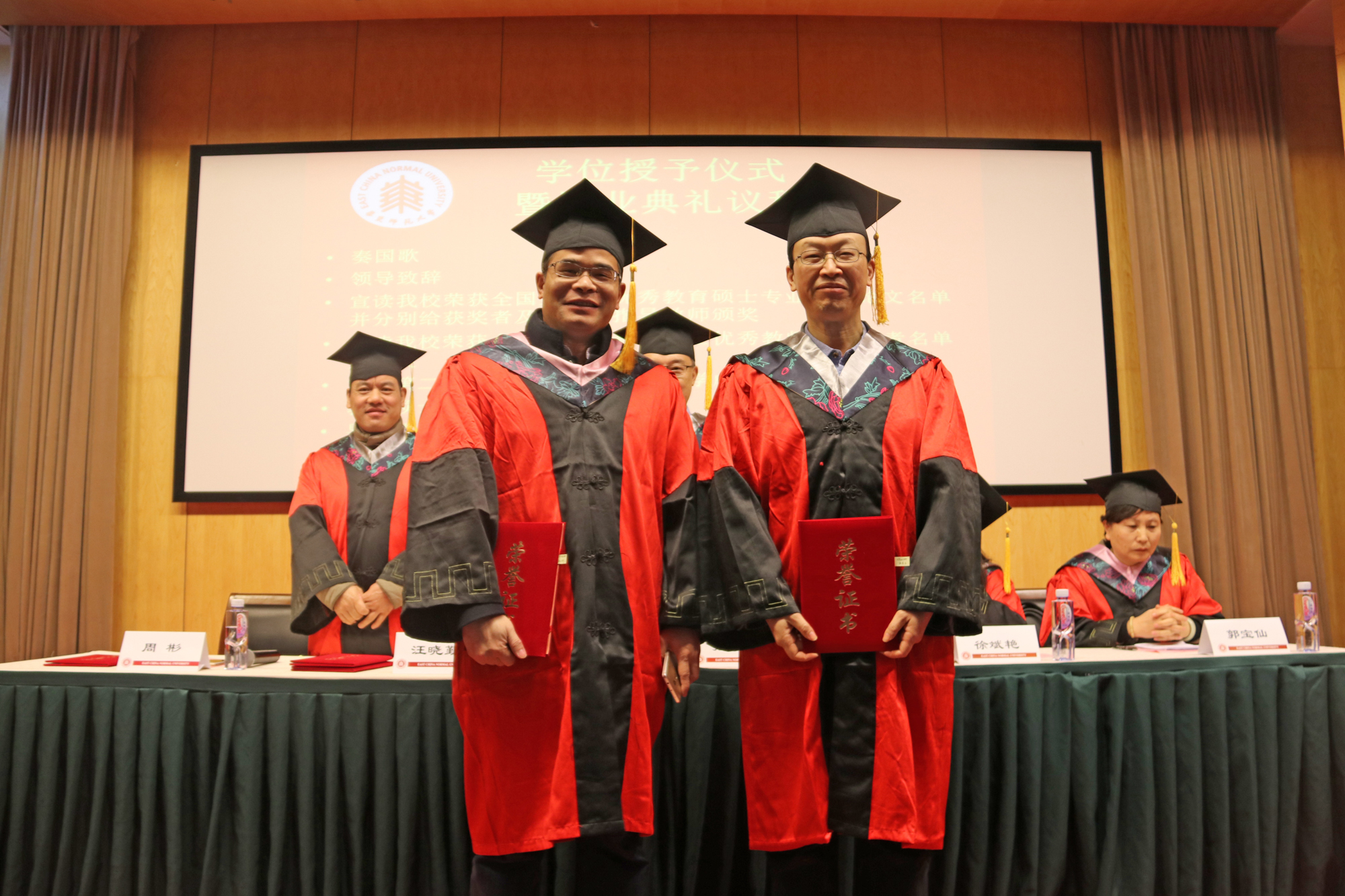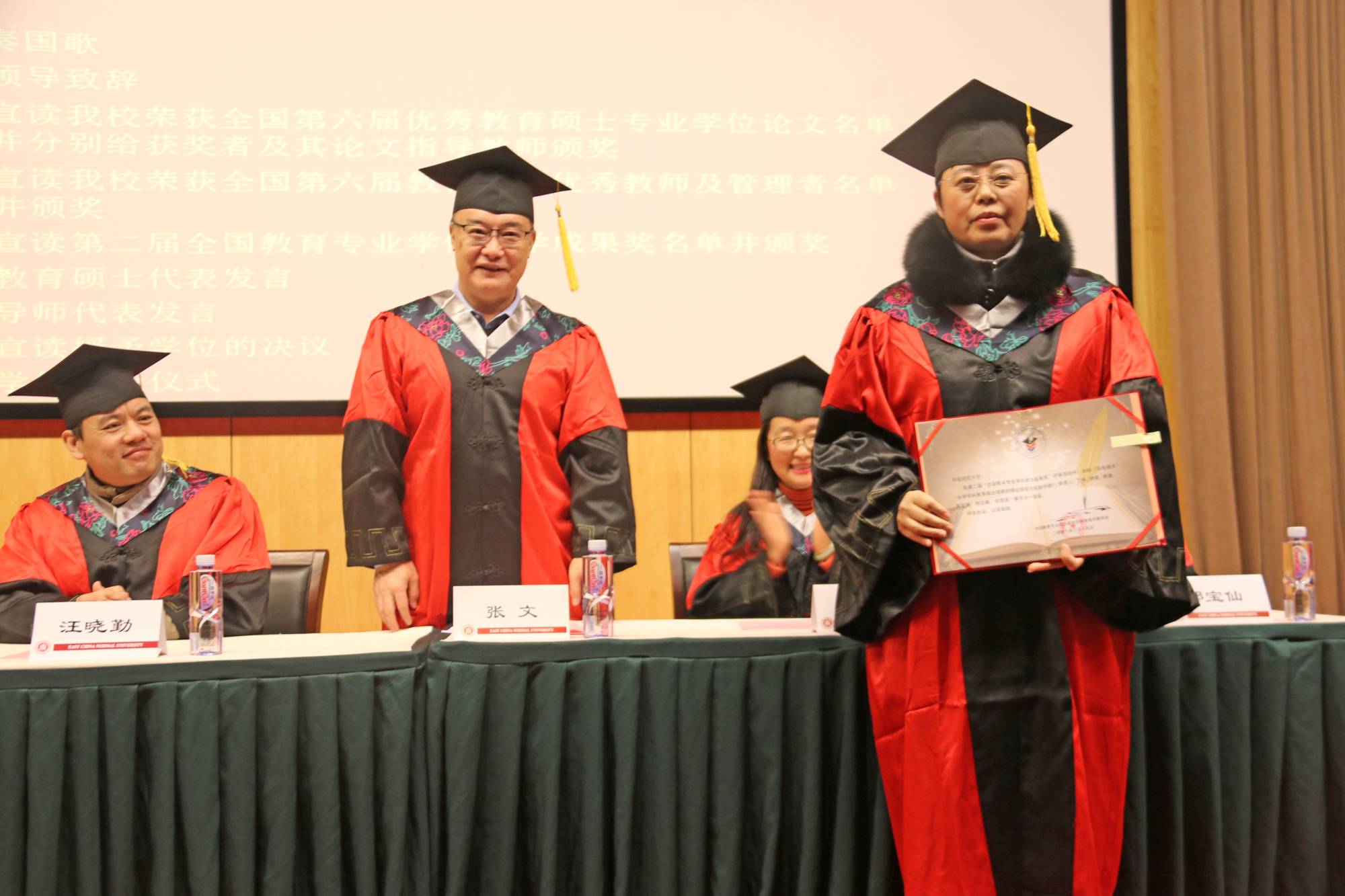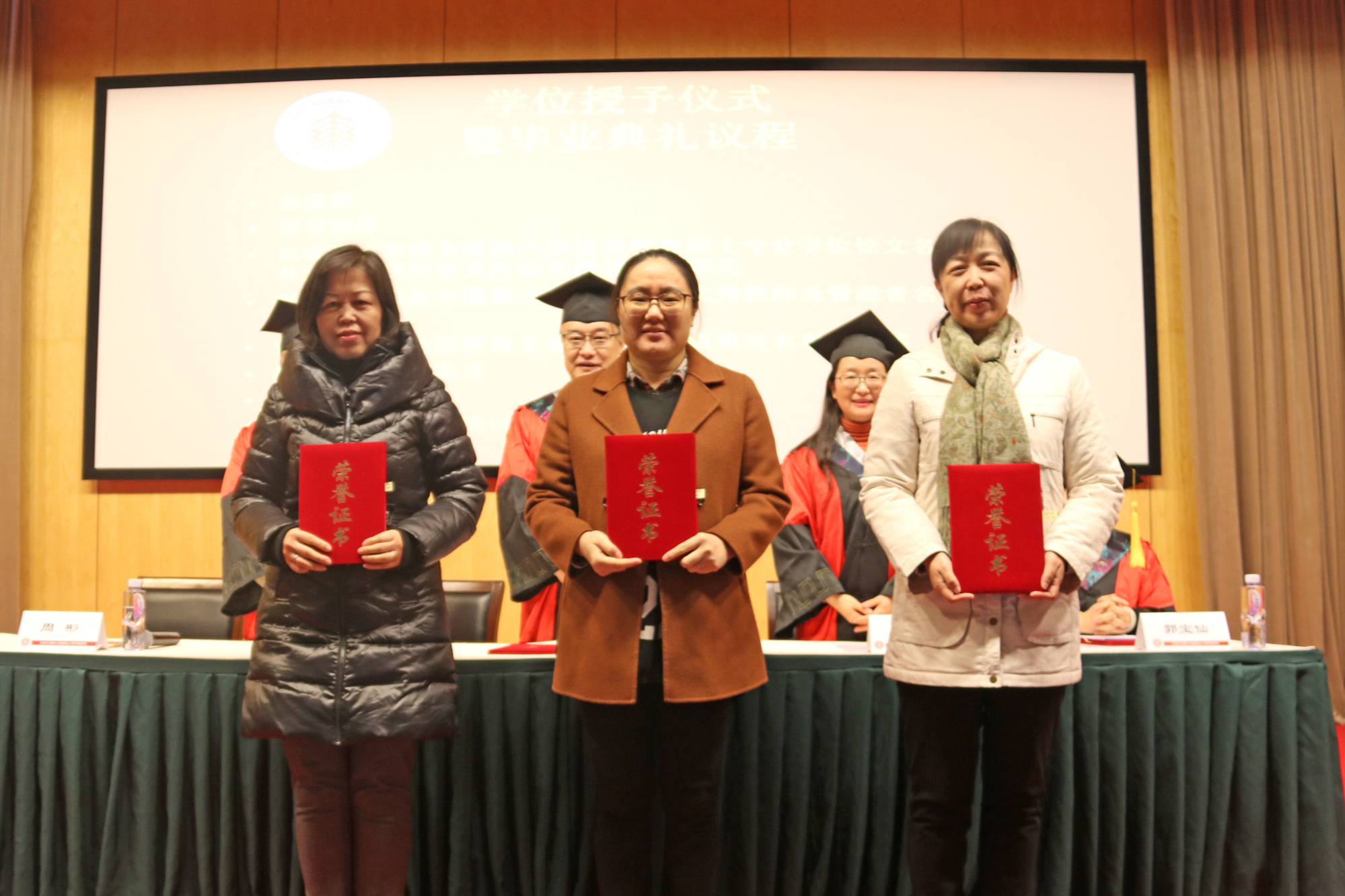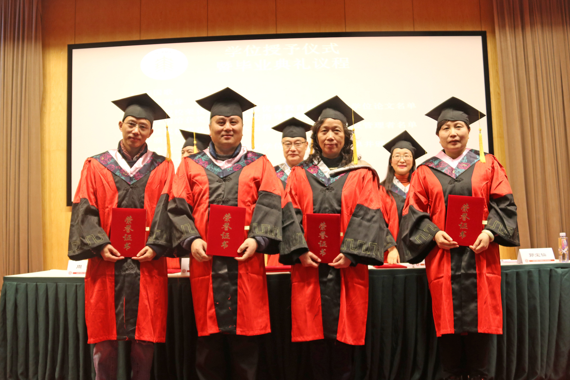 最后,由张文宣读授予学位的决议,出席典礼的领导和老师们为毕业生们逐一拨正硕士学位帽流苏、颁发硕士学位证书并合影留念。
