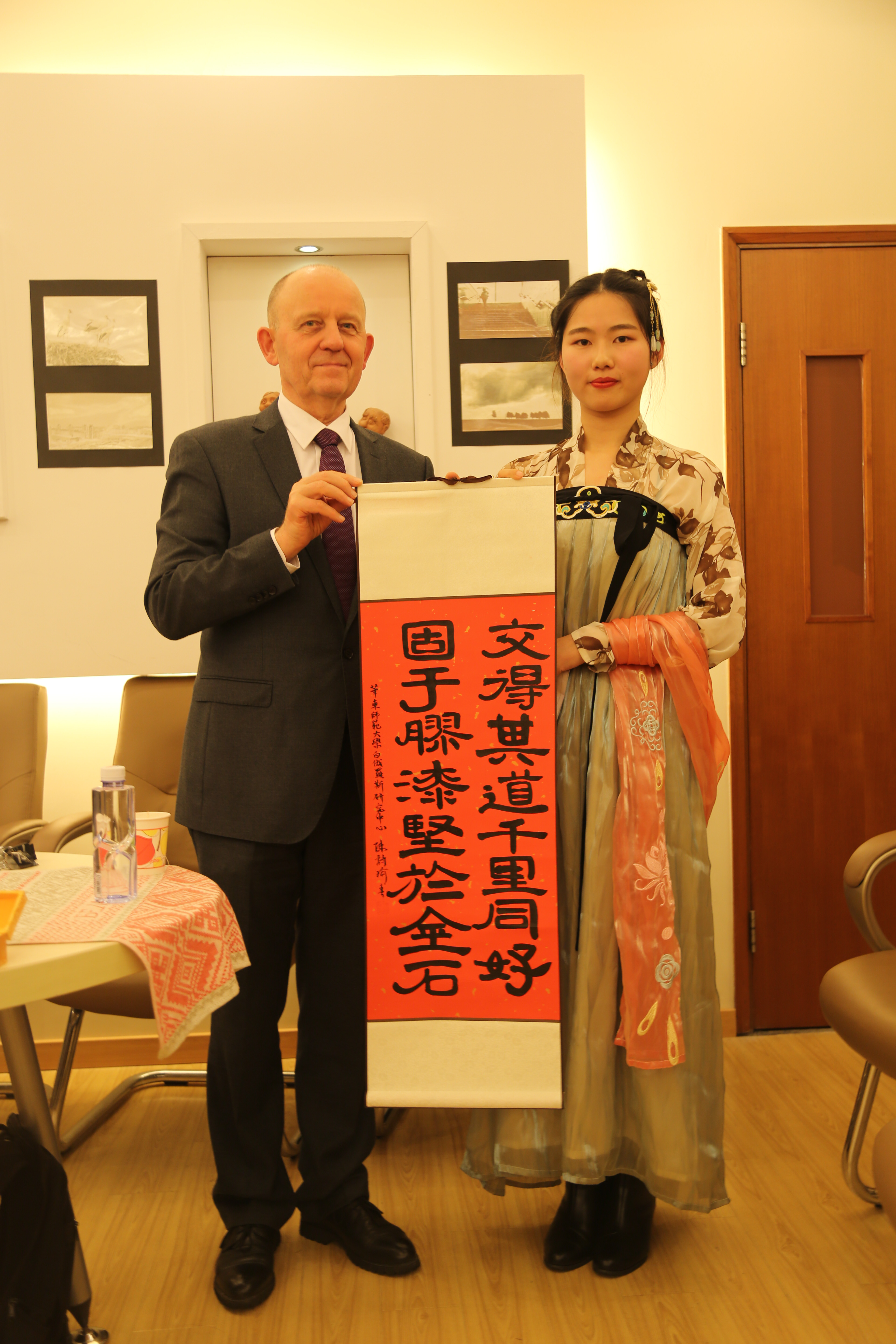 研讨会气氛热烈,交流踊跃。发言者梳理成就,分析问题,提供建议,大家表示,中白两国宣布建立“相互信任、合作共赢的全面战略伙伴关系”,两国关系发展已经进入定位高、基础牢、机制顺的新阶段,双方对接各自发展战略,深化各领域合作,共同推进丝绸之路经济带建设,着力打造发展目标高度契合、彼此利益深度融合的命运共同体。在此背景下,对中白各自的发展和双边合作形势的准确判断、分析和把握显得尤为重要。双方要加强研究,积极发挥智库的作用,开展务实交流合作,增进互信和友谊,夯实两国友好的社会基础,以此扎实推进两国友好关系健康、稳定和深入的发展。研讨会结束后,中国学生展示了书法撰写和民族器乐演奏。