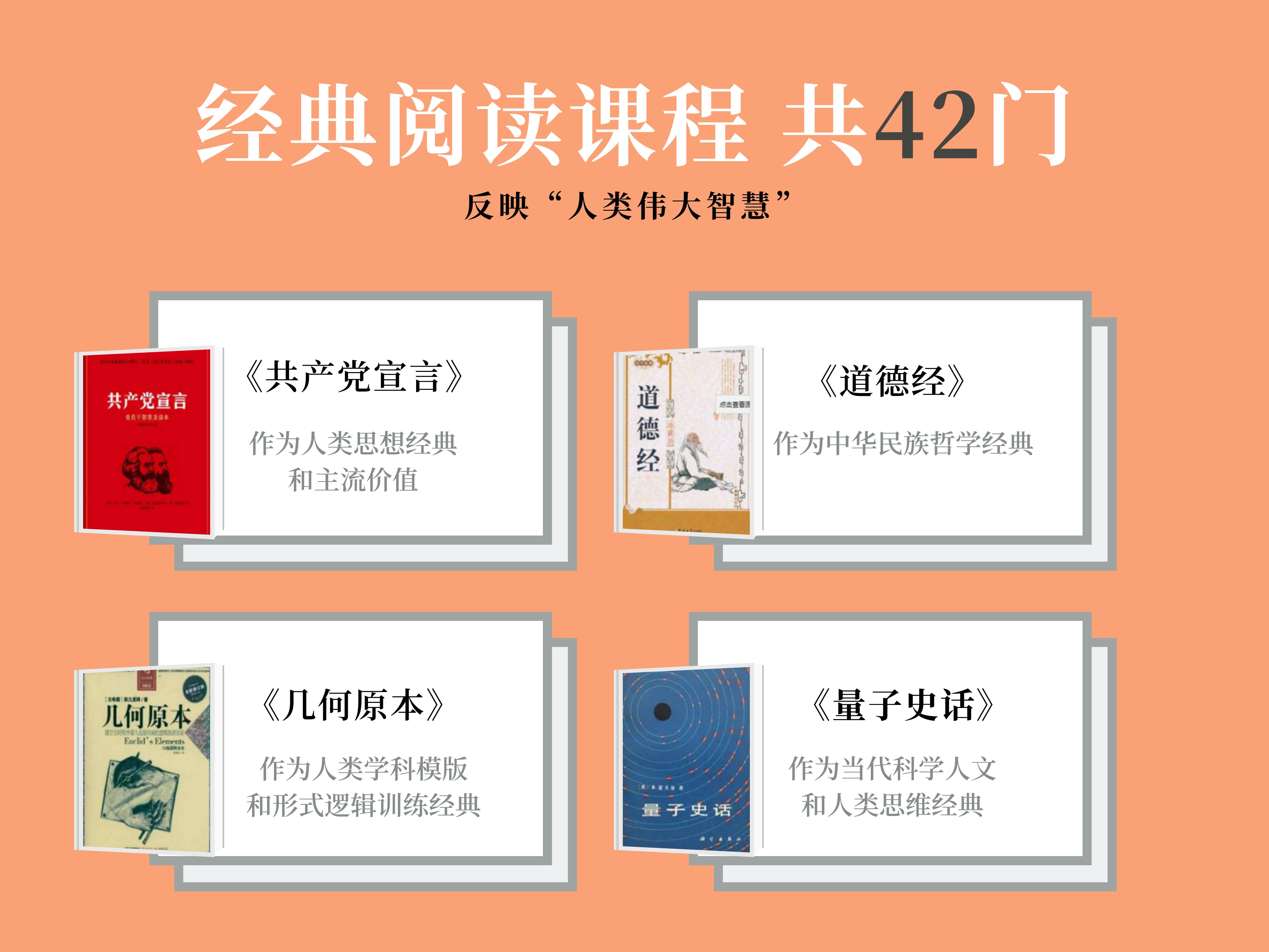 第二层经典阅读课程是反映“人类伟大智慧”的,以《共产党宣言》《道德经》《几何原本》《量子史话》为代表的,涉及价值体系、思维逻辑、文明传统、认知前沿,带领学生吸收人类文明的营养。