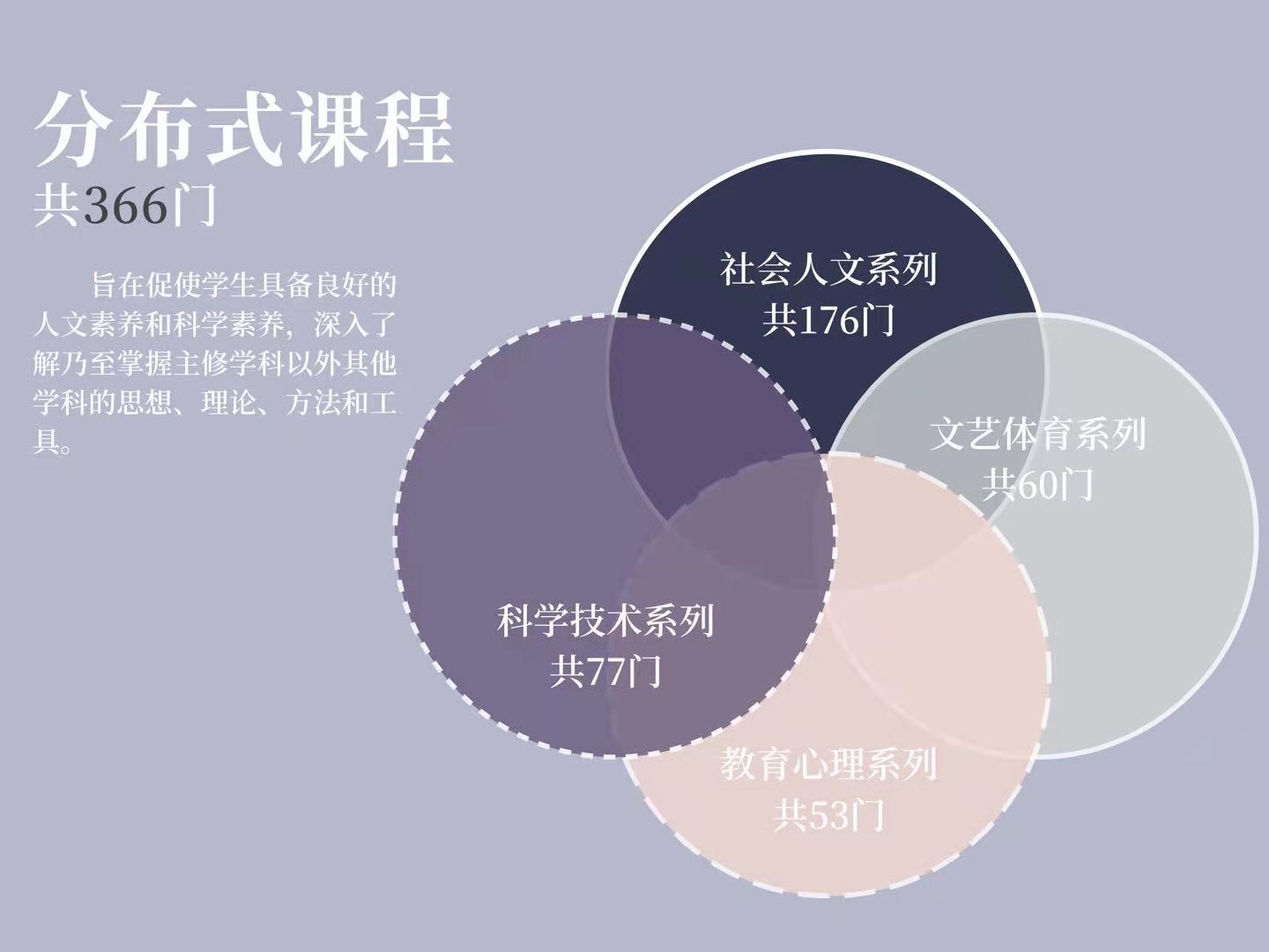 第四层分布式课程依托华东师大传统优势学科,结合正在实施的“教育 +、生态 +、健康 +、智能 +、国际 +”五大行动计划,学校在教育、心理、智能、生态四个领域建设了系列核心课程和分布式课程,使学生打下华东师大的烙印。