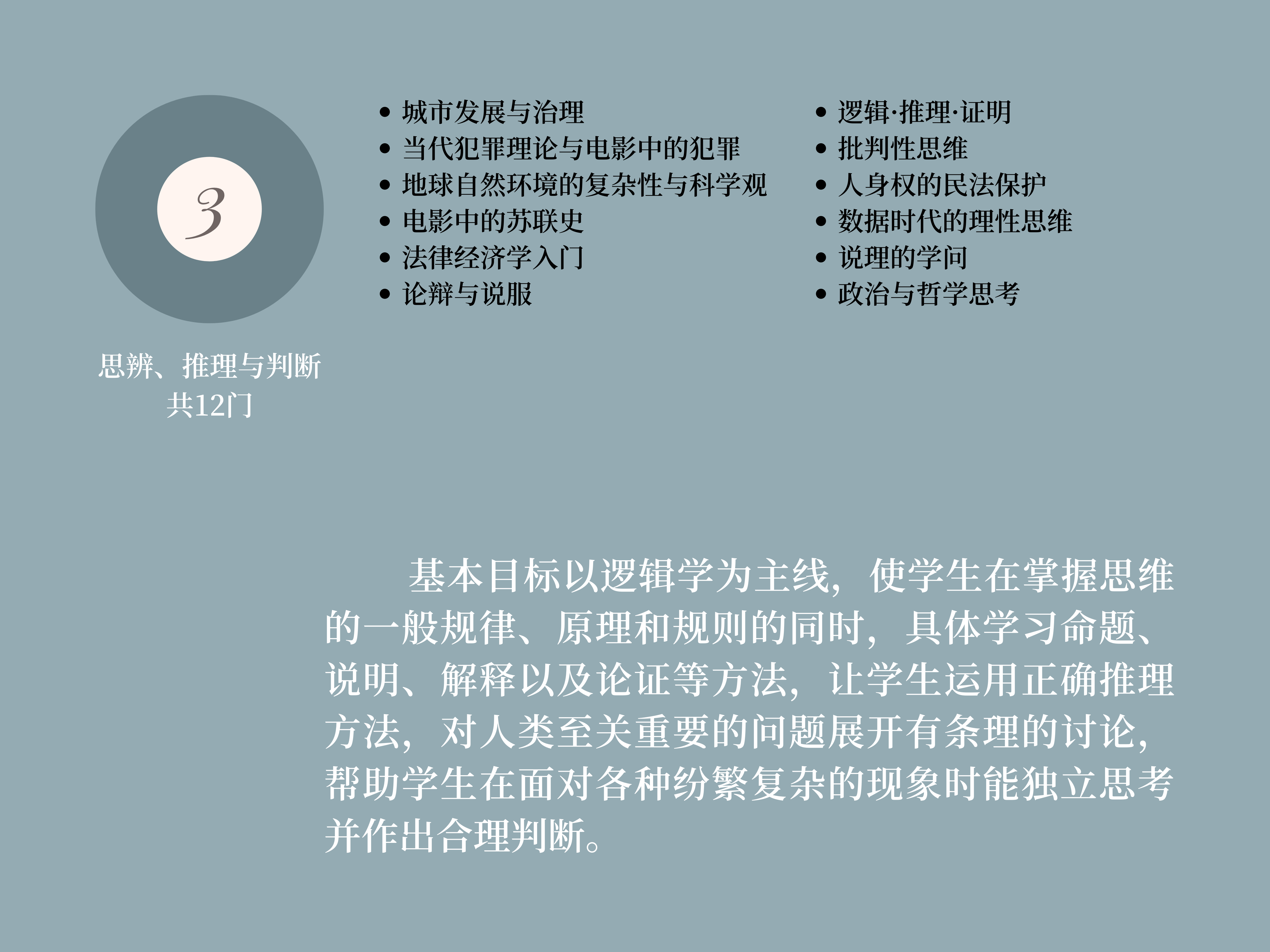 第三层核心课程包含六个延伸模块,以问题为导向,强调逻辑思维、形象思维、批判性思维、创造性思维、问题意识和问题解决的方法等方面的训练。