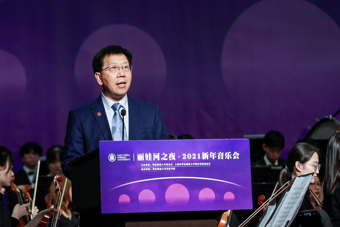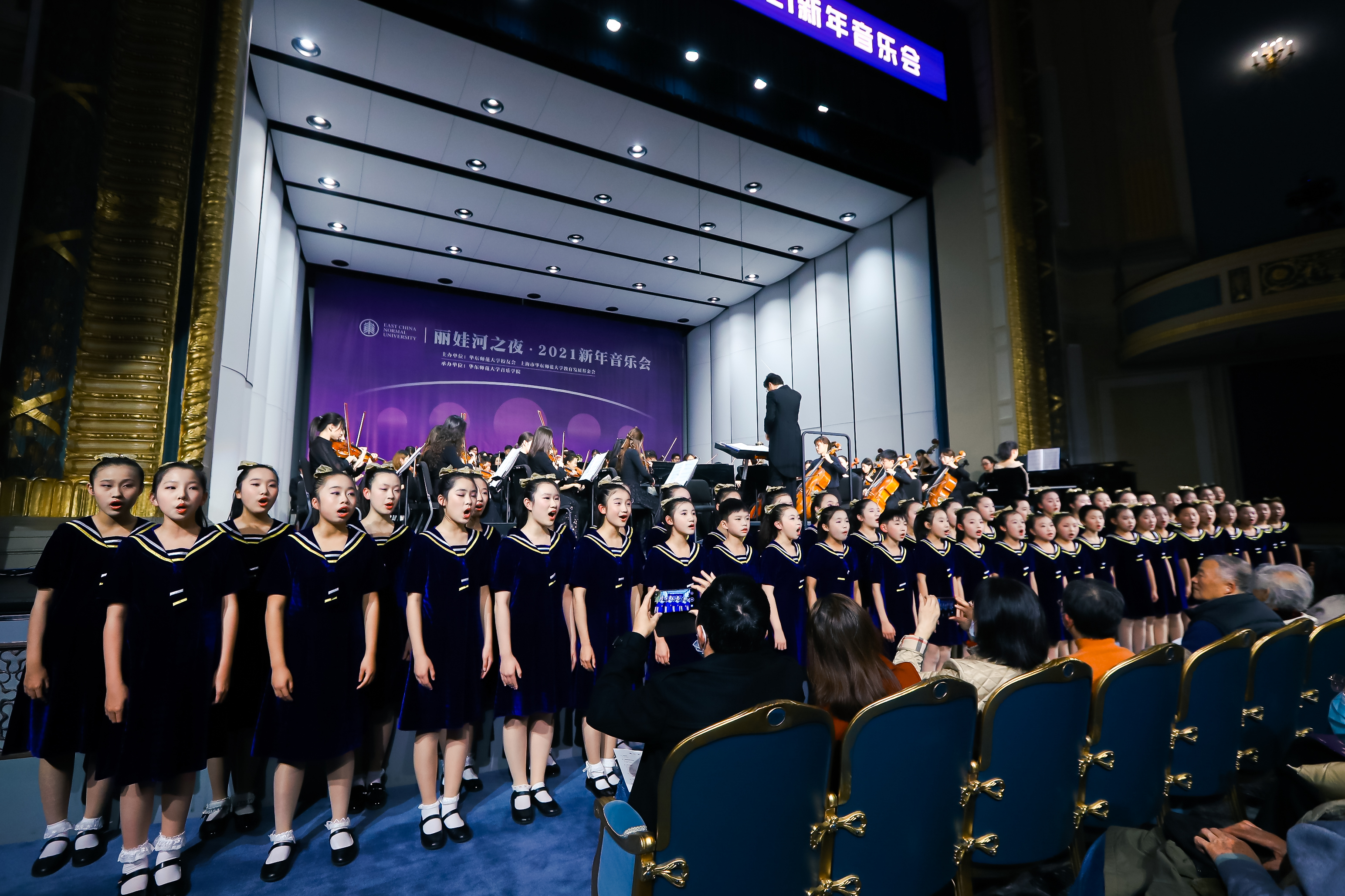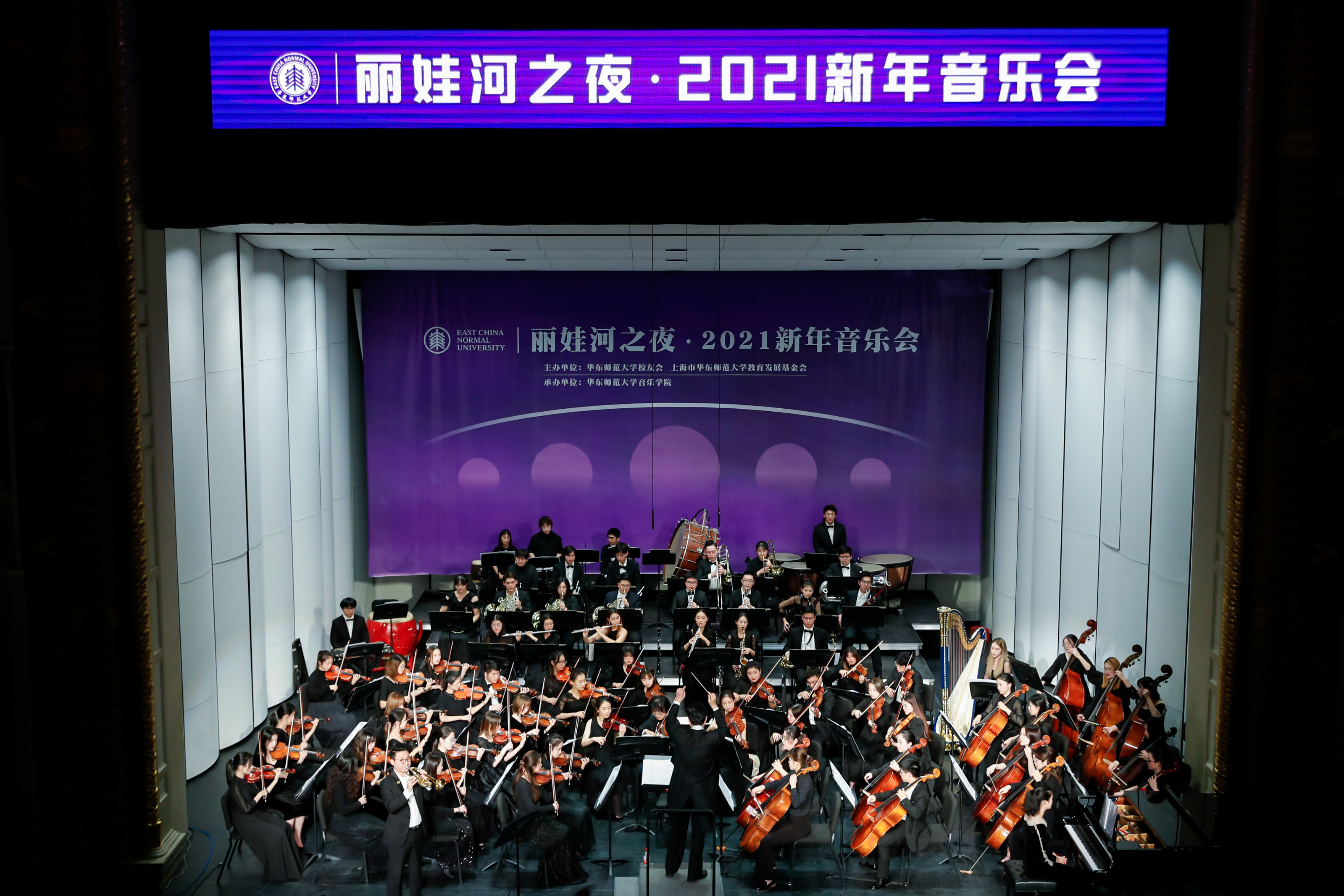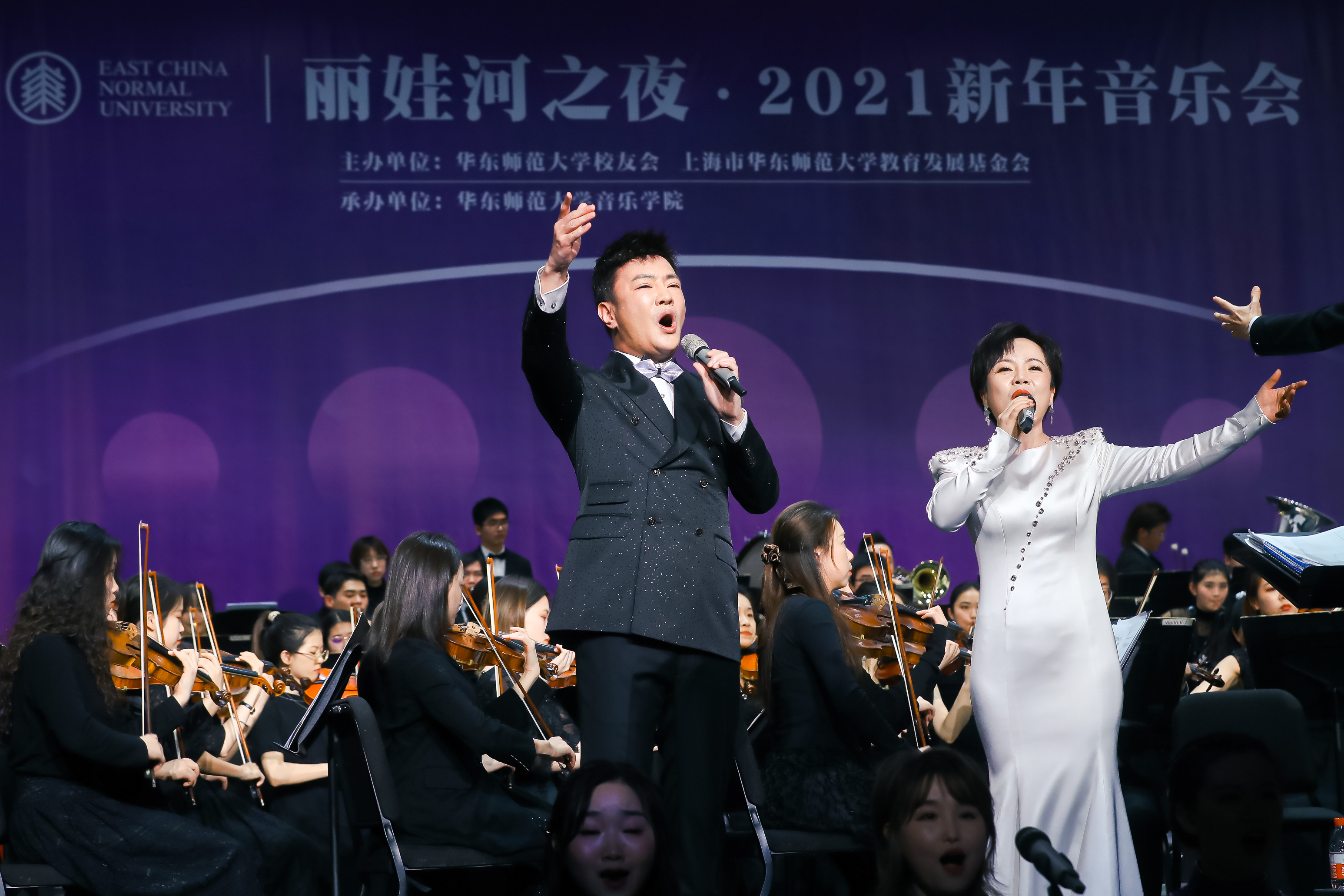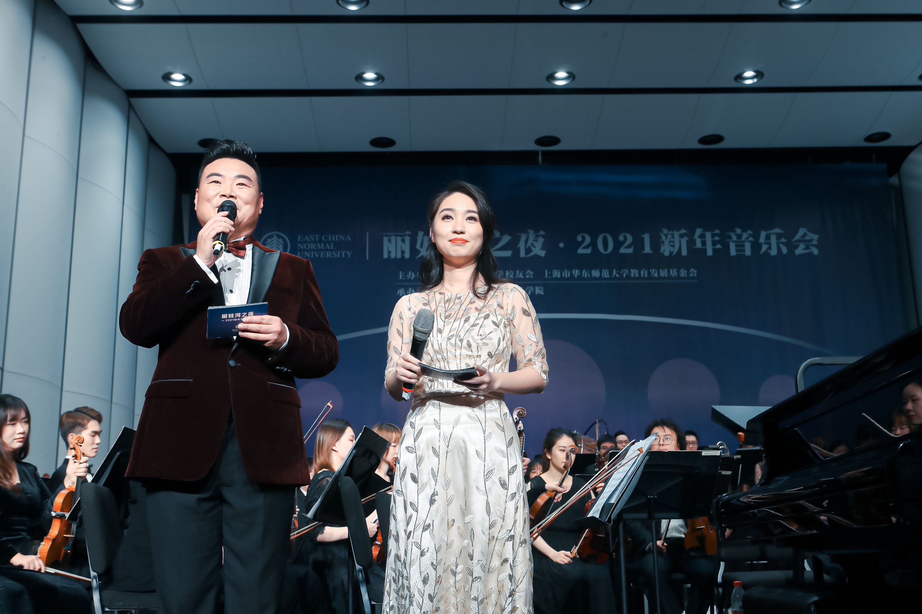 音韵悠扬,鼓乐催人。12月23日晚,丽娃河之夜·2021新年音乐会在上海音乐厅精彩上演,为迎接建党100周年和建校70周年奏响时代华章。校领导、校发展咨询委员会委员、校友会和基金会理事会成员、师生代表、各界校友以及关心和支持华东师大发展的各界贤达800余人出席音乐会,畅叙情谊,共迎新年。音乐会同时面向全球校友同步直播。传播学院播音主持艺术专业教师马力,08级传播学院播音主持艺术专业校友、上海广播电视台“动感101”节目主持人小短共同担任主持。