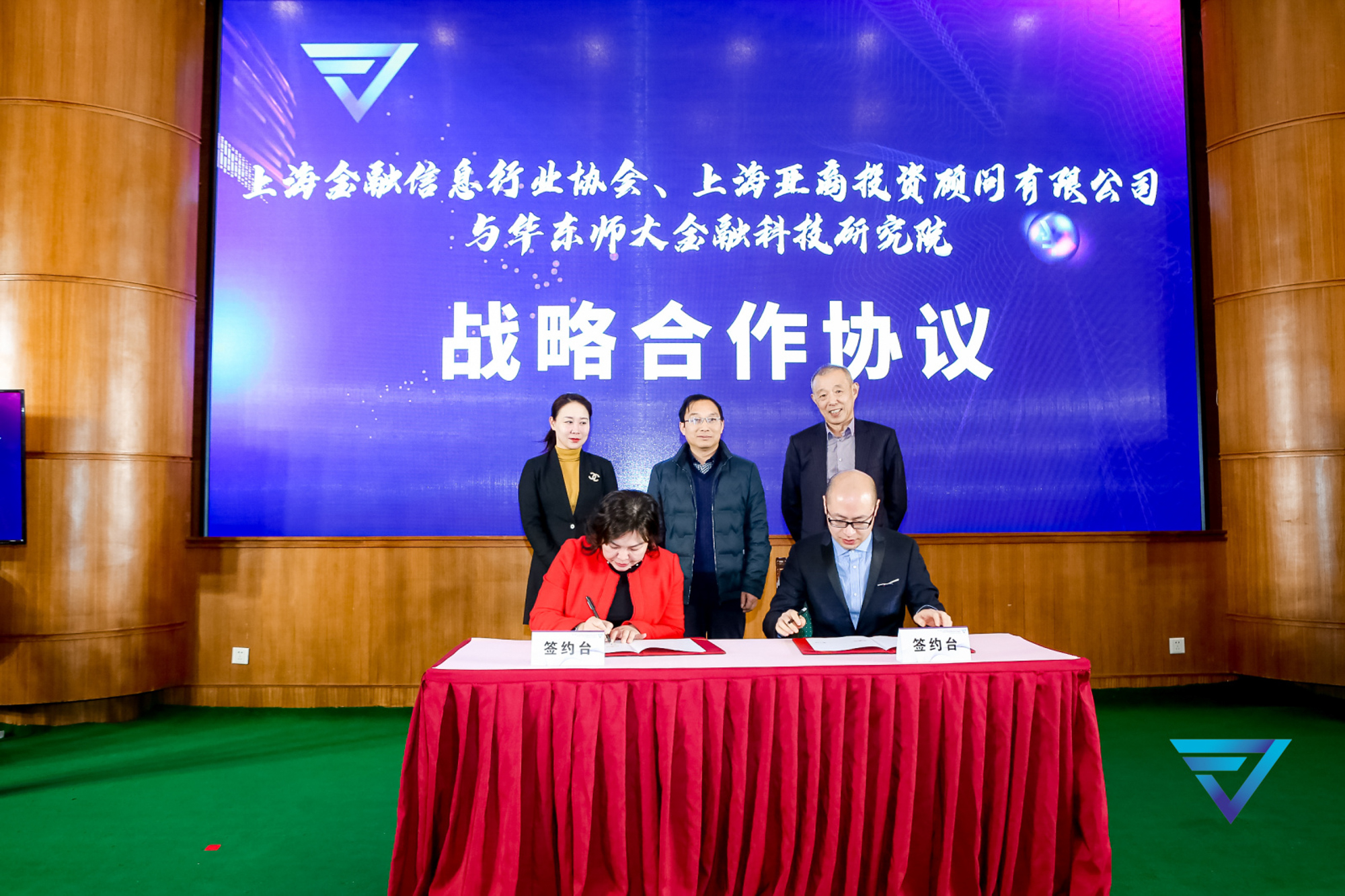 演讲结束,在华东师大金融科技研究院理事长、亚商集团董事长陈琦伟,华东师大校长助理、教育发展基金会秘书长斯阳,上海金融信息行业协会常务副会长李娟的见证下,上海金融信息行业协会秘书长吴军、上海亚商投顾有限公司总经理黄文佳分别与3245澳门新莆京经济与管理学部党委书记、金融科技研究院院长岳华进行战略合作签约。