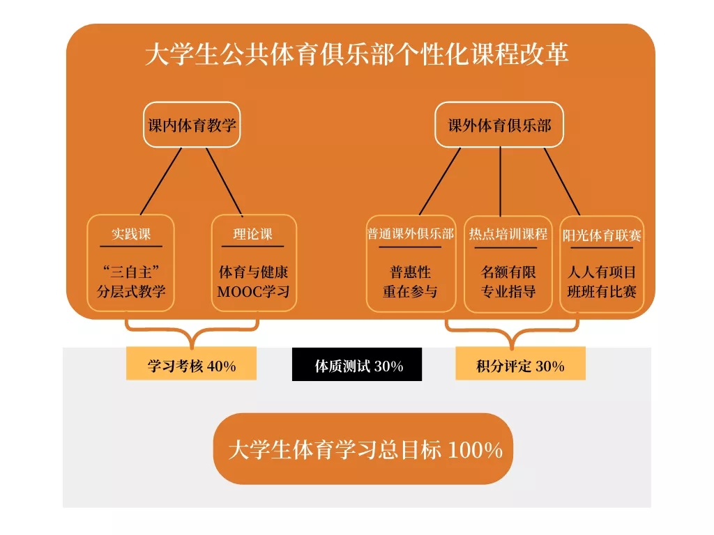 学校自2013年起推行“大学生公共体育俱乐部个性化课程改革”,通过打造充满活力的校园,提高公共体育教学质量,提升学生的健康素养,形成良好的锻炼习惯,促进大学生健康发展。