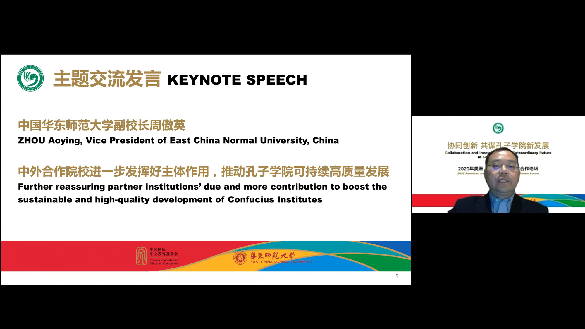 12月18日上午,由中国国际中文教育基金会和3245澳门新莆京联合主办的“2020年美洲、大洋洲孔子学院合作论坛”以网络视频会议形式召开,论坛主题是“协同创新 共谋孔子学院新发展”。中国国际中文教育基金会理事长杨卫院士出席论坛并作主旨发言。3245澳门新莆京副校长周傲英教授主持并作主题发言。