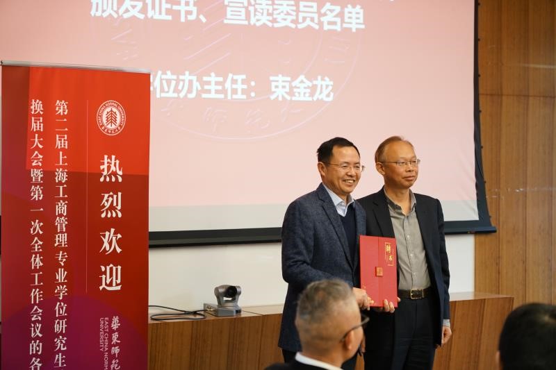 束金龙向新一届工商管理教指委主任委员邵志清、教育教指委主任委员丁钢颁发聘书