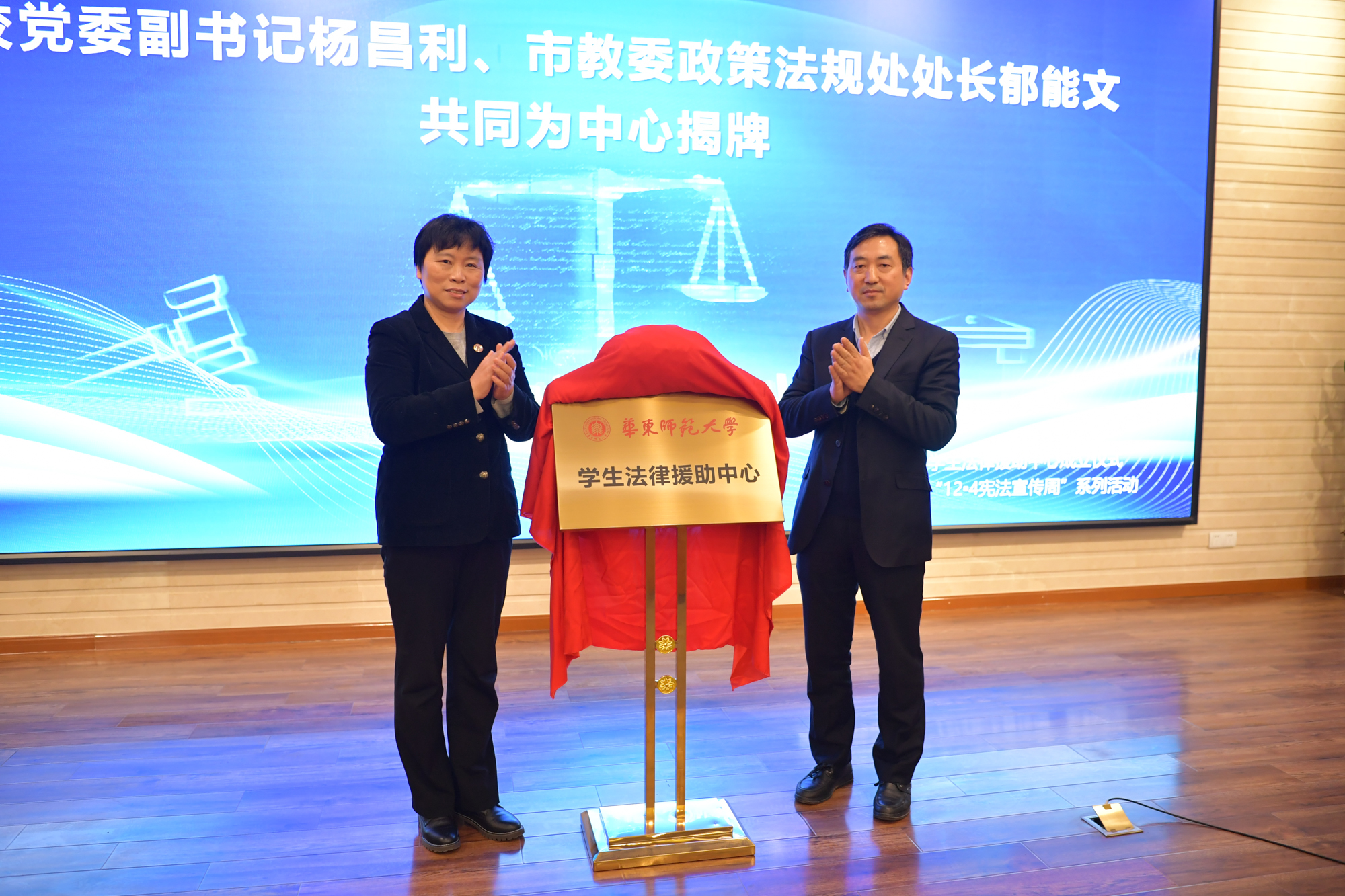 校党委副书记杨昌利、市教委政策法规处处长郁能文为学生法律援助中心揭牌