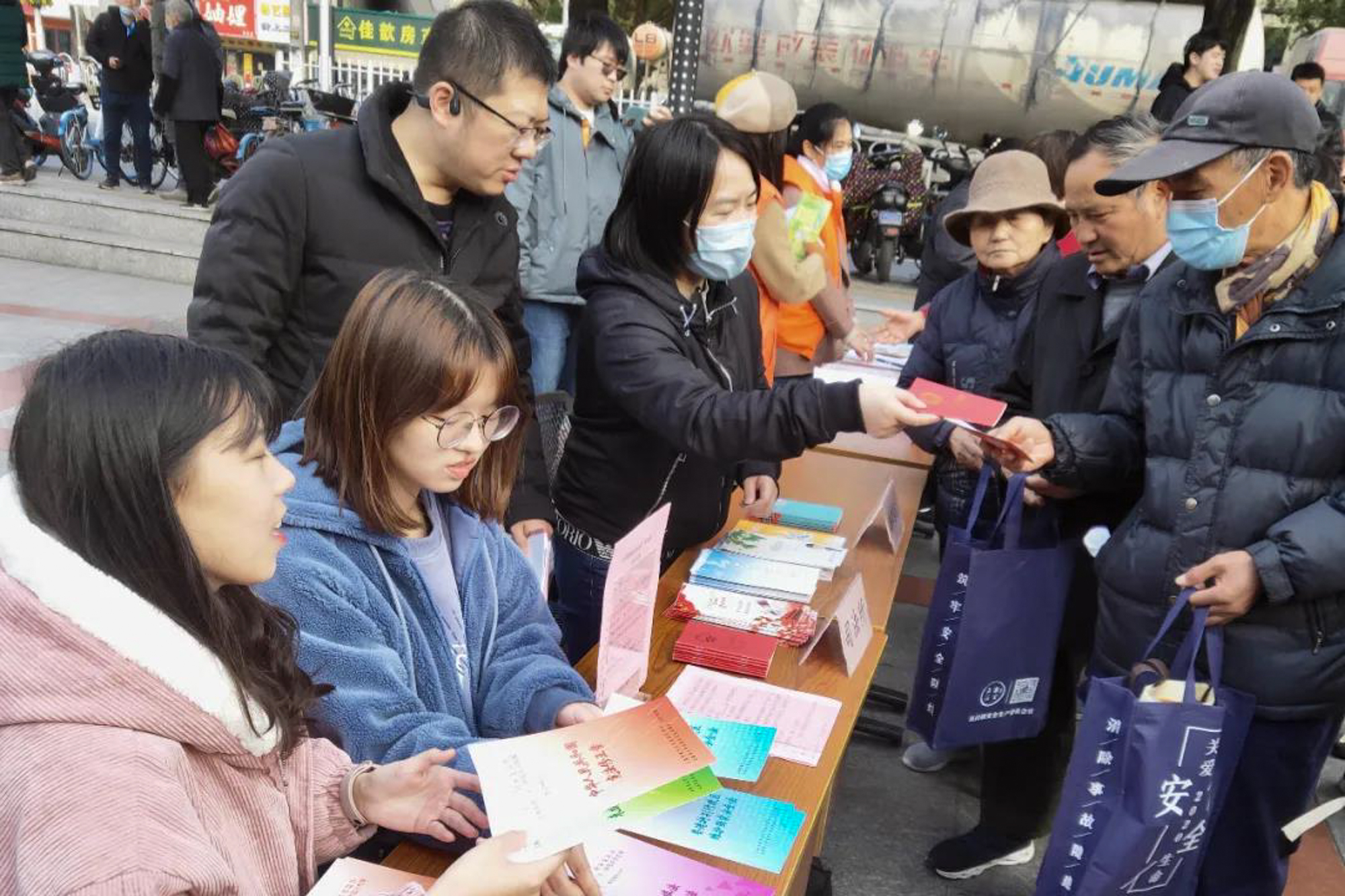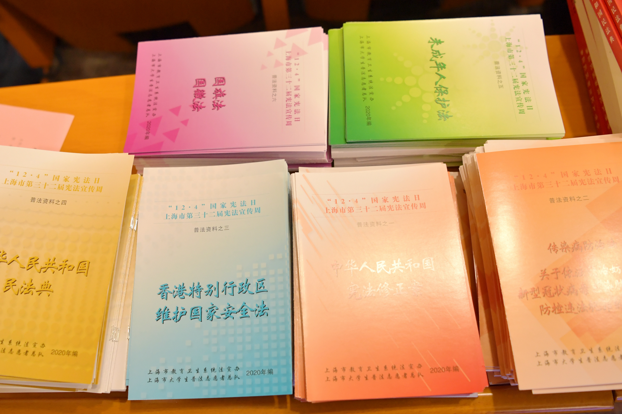 学生法律援助中心为到场学生们派发《民法典》法条以及上海市教委法宣办印发的2020年普法宣传资料