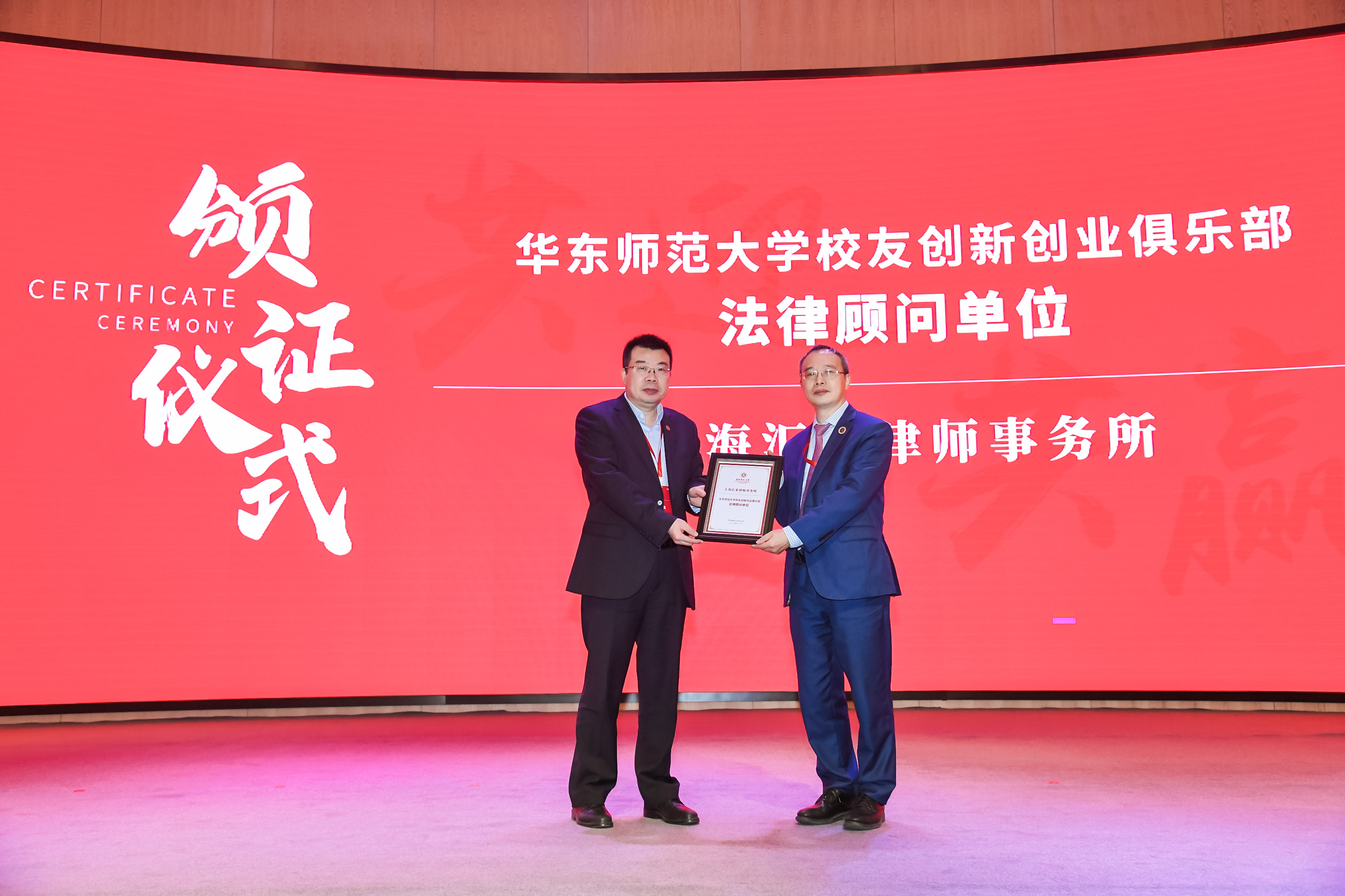 副校长孙真荣向汇业律师事务所高级合伙人廖明涛颁发校友双创俱乐部法律顾问单位证书