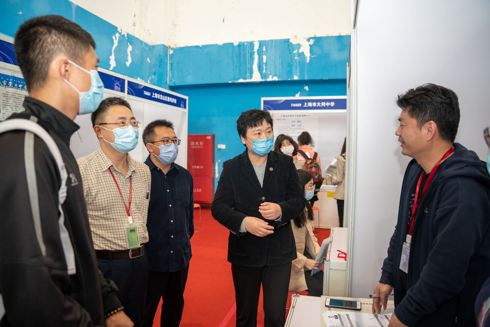 校党委副书记杨昌利在招聘会现场,走访参会单位,感谢他们对华东师大毕业生的青睐及对学校教师教育工作的支持,她与毕业生们交谈,了解毕业生求职状况和具体需求,鼓励毕业生迎难而上,转危为机,以更加积极的心态和求职行动应对疫情所带来的就业挑战。