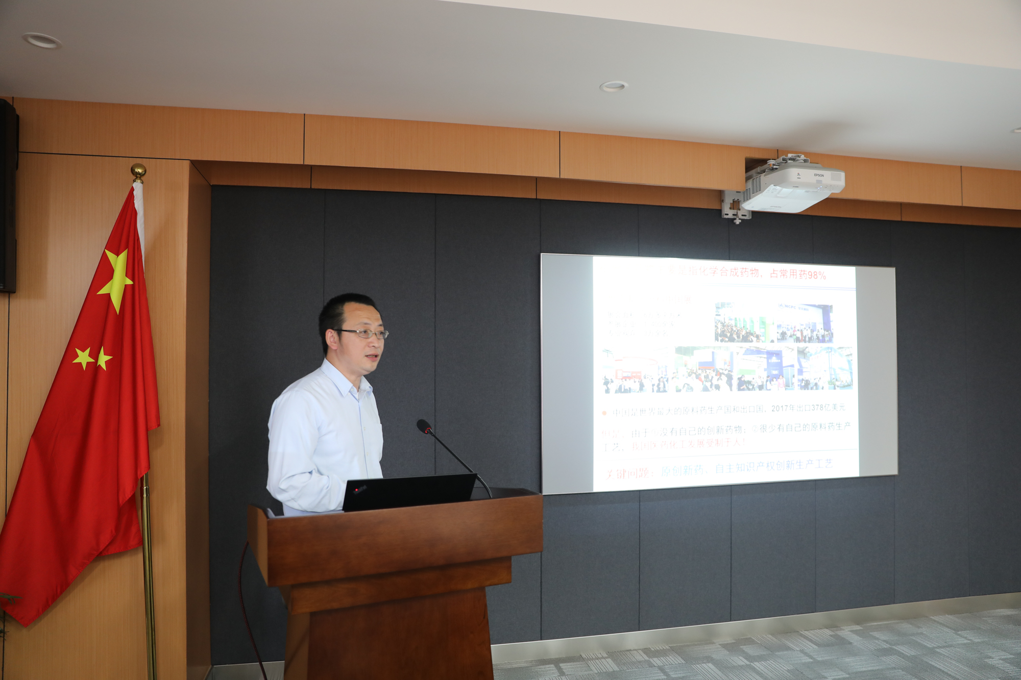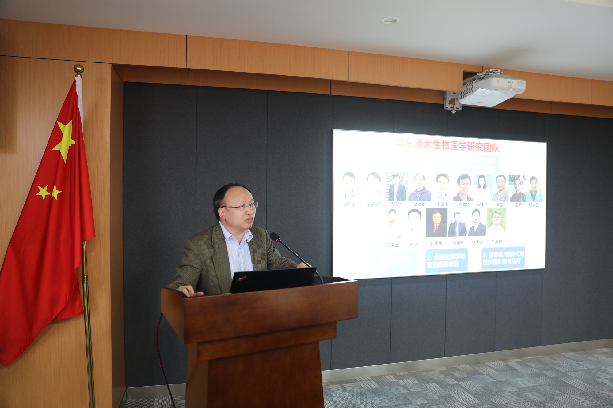 上海分子治疗与新药创制工程中心主任、化学与分子工程学院周剑汇报了研究团队在小分子药物研究方面取得的成果。他谈到,团队将积极融入上海市科创中心建设、生物医药和脑科学国家实验室的筹建,面向上海老龄化社会需求,进行新药研发,为推进上海市生物医药创新体系建设和医药成果转化、产业发展贡献力量。