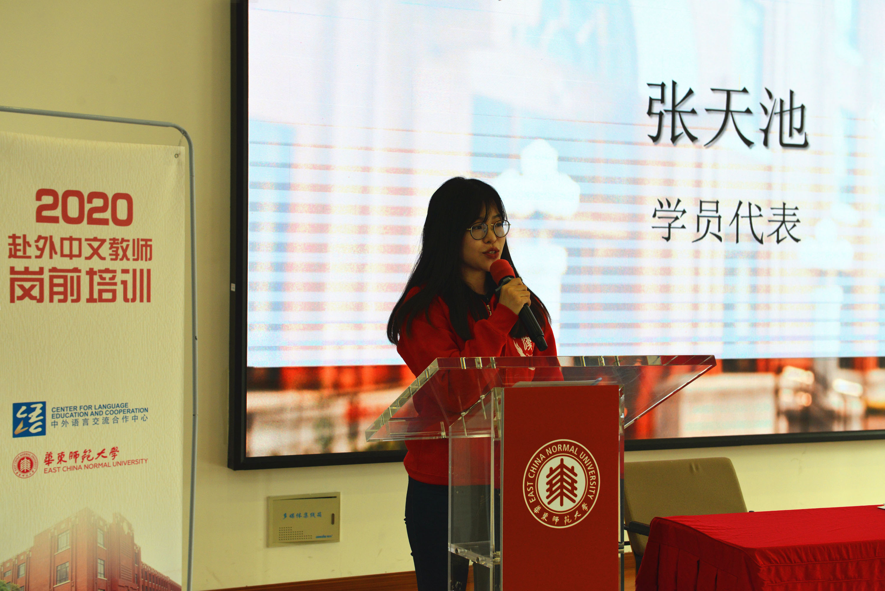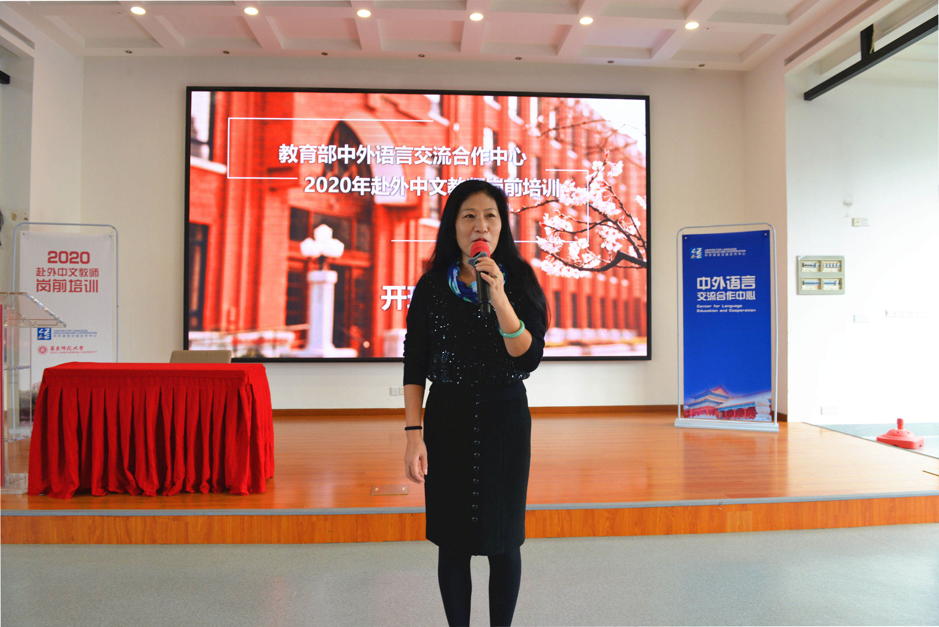 暖场片播放之后,开班仪式在庄严的国歌声中拉开帷幕。梅兵首先代表学校致辞,她对参加2020年首次线下培训的学员们热烈欢迎。她提及,刚闭幕的十九届五中全会为未来5年乃至15年中国发展擘画了蓝图,公布了既有前瞻性又符合实践需要的行动纲领,打开了世界感知中国脉动的最佳窗口。在这样的背景下举办培训意义深远。梅兵对语合中心的信任和支持表示诚挚感谢,对在座老师们在这特殊时期的“逆行”表达了崇高的敬意和美好的祝福。她介绍了刚刚度过69周岁生日的华东师大,作为新中国成立的第一所师范大学在学科发展及语言教育方面的特色,介绍了成立于2008年国际汉语教师研修基地12年的工作及取得的成绩。她希望大家在国际合作交流面临挑战的今天,能够克服困难,认真学习,承担好教授汉语、交流文化的重担,成为中国呈递给世界最好的名片。